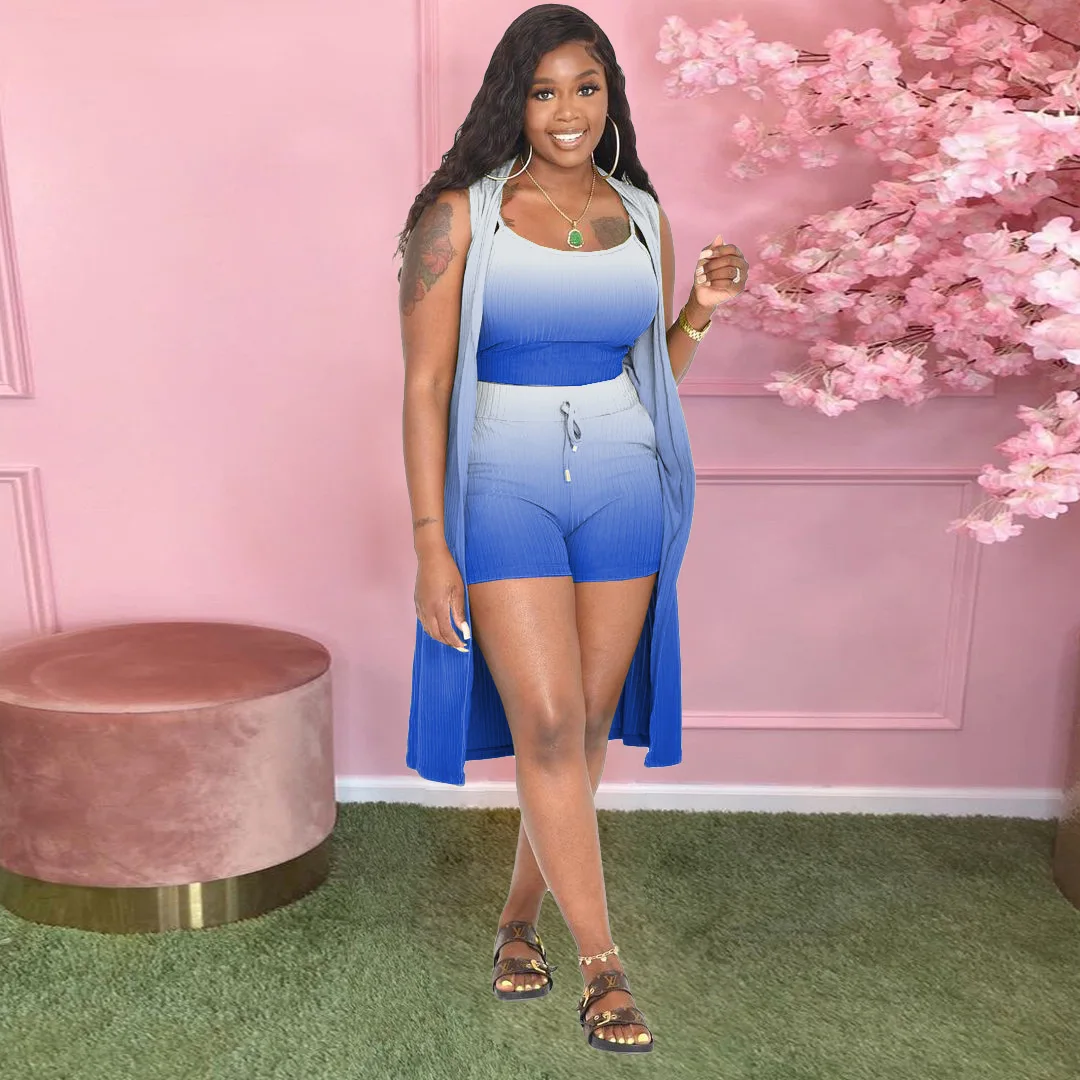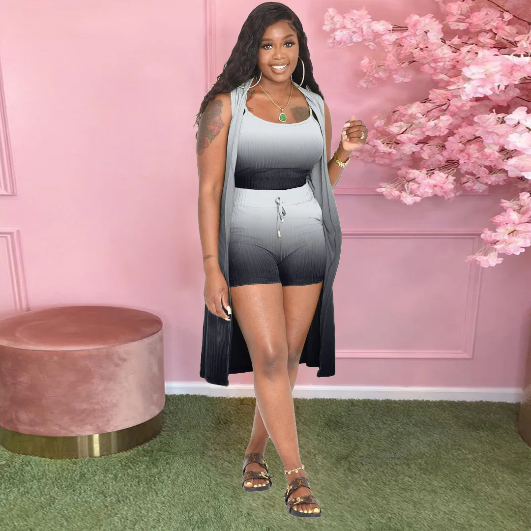 CM.YAYA Streetwear Knit Gradient Women 2 Piece Set Outfits Sleeveless Clock Top + Tank + Shorts Set 2023 Yoga Fitness Tracksuit