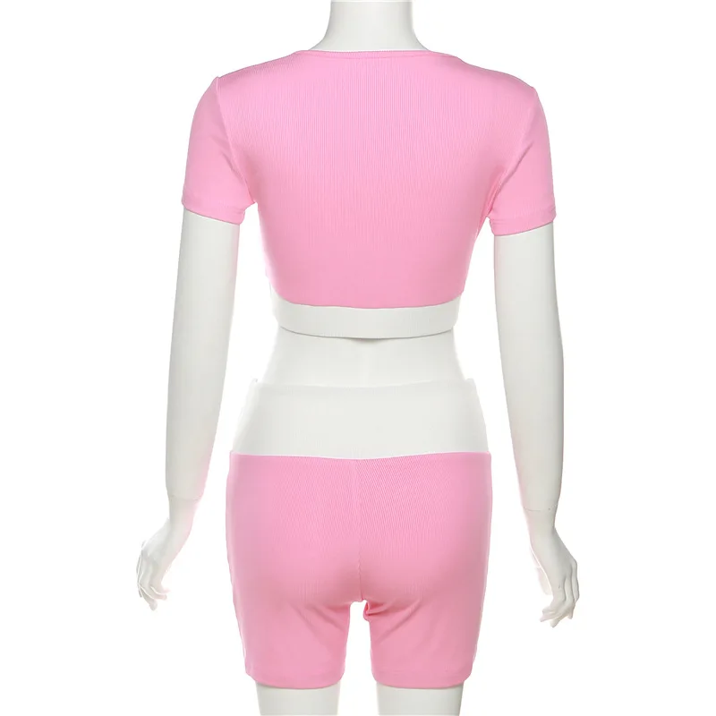 CM.YAYA Streetwear Knit Patchwork Women 2 Piece Set Outfits Short Sleeve Mini T-shirt and Shorts Set 2023 Yoga Fitness Tracksuit