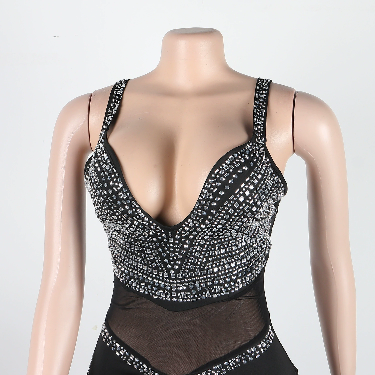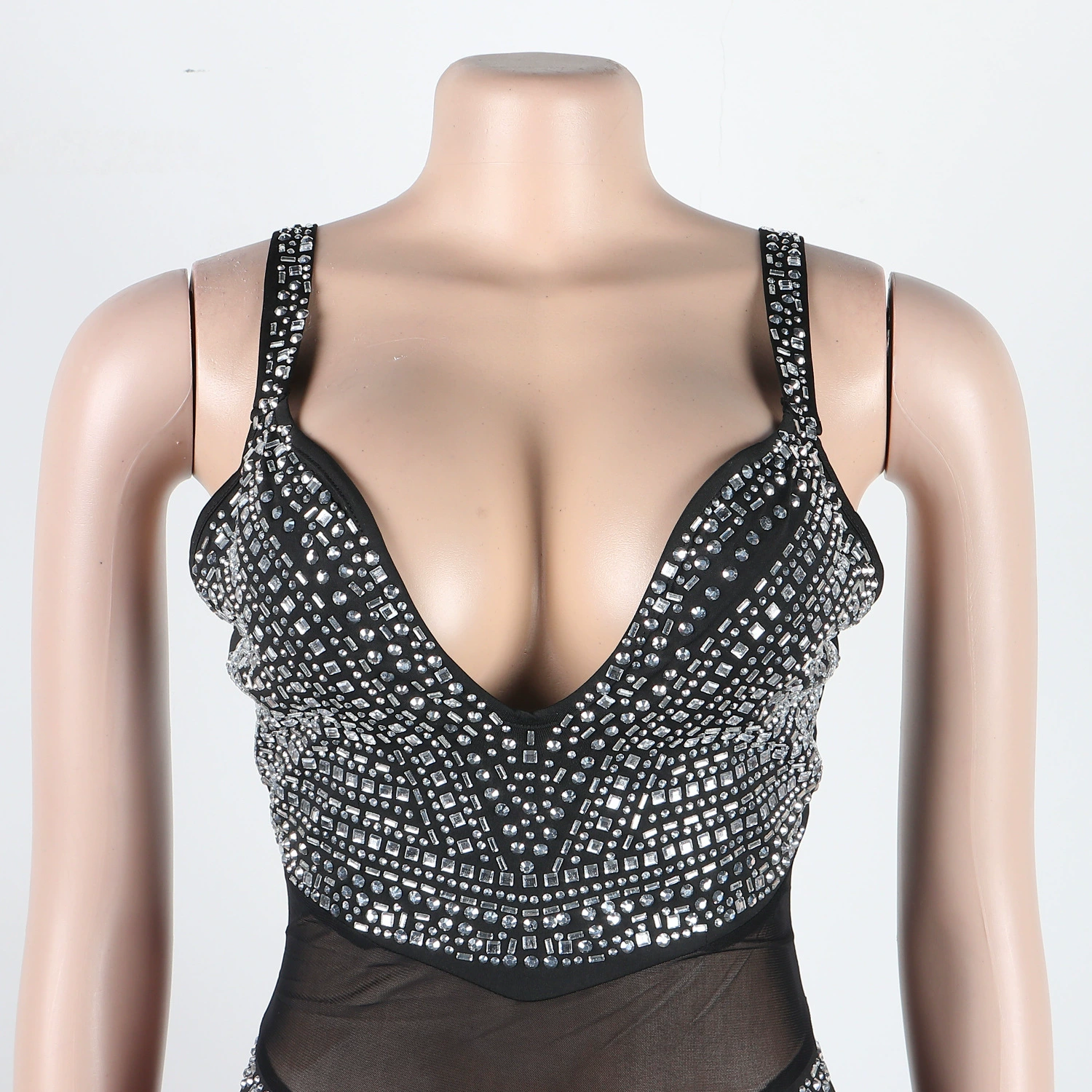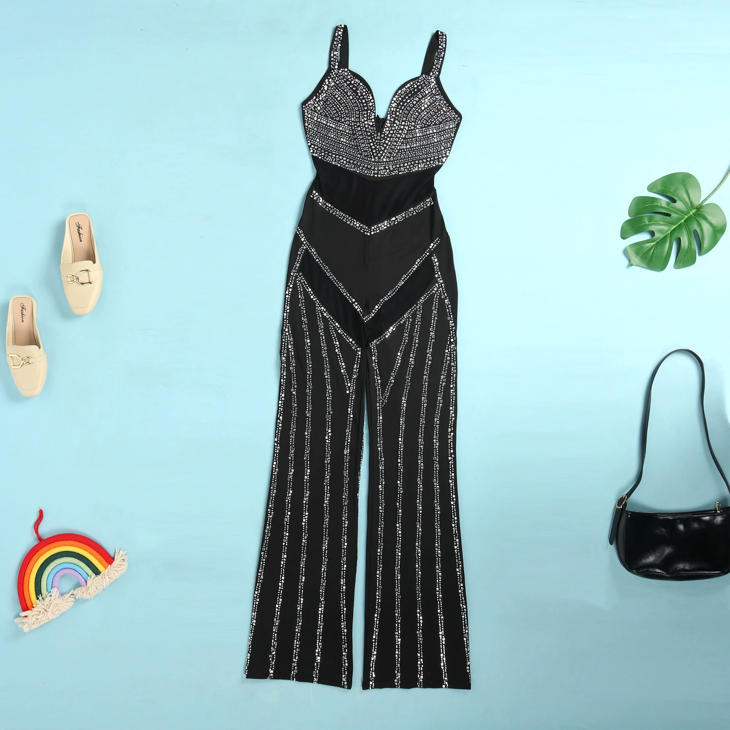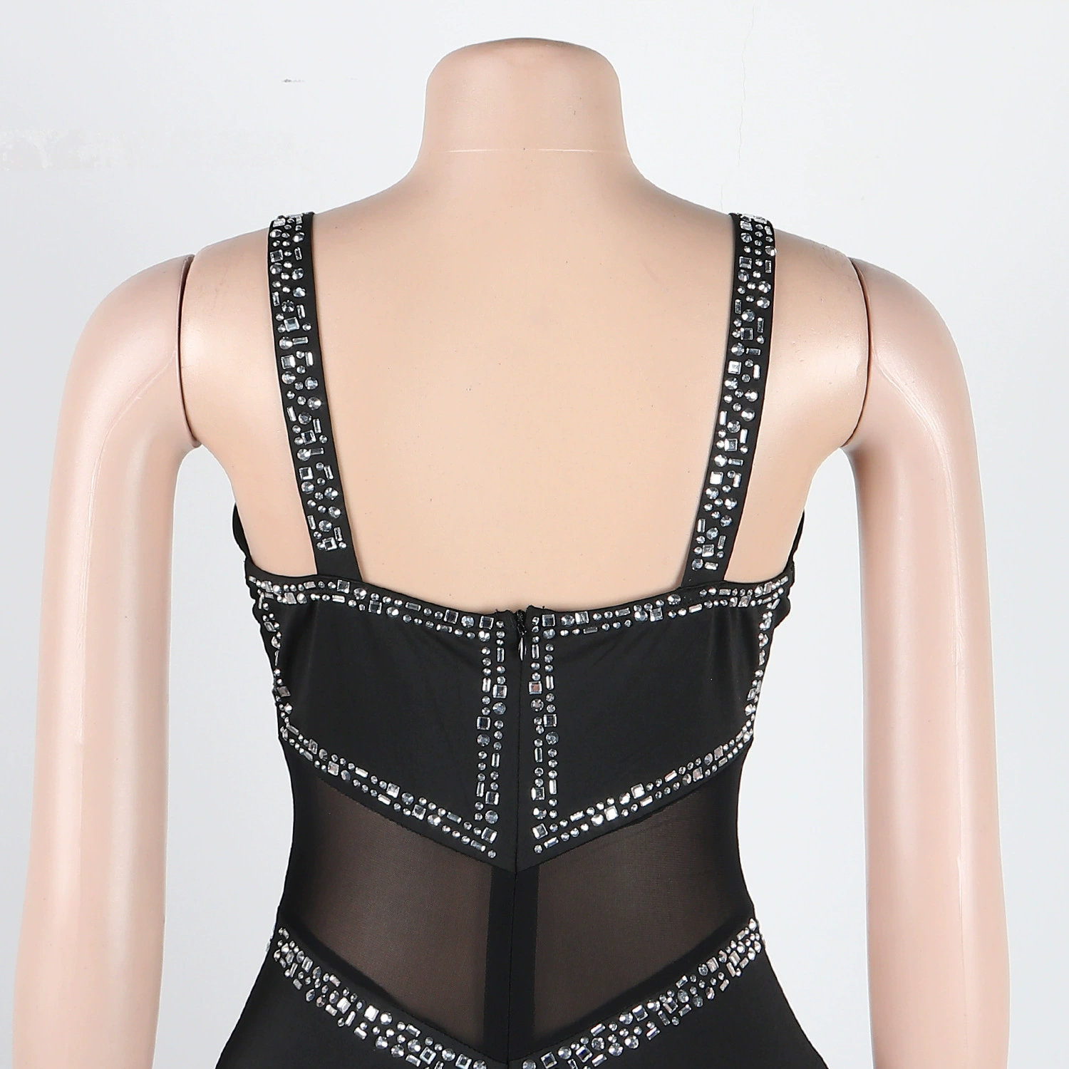 CM.YAYA Vintage Women Diamonds Hot Rhinestones Spaghetti Strap V-neck Mesh Patchwork Straight Jumpsuit Sexy Party Club Romper