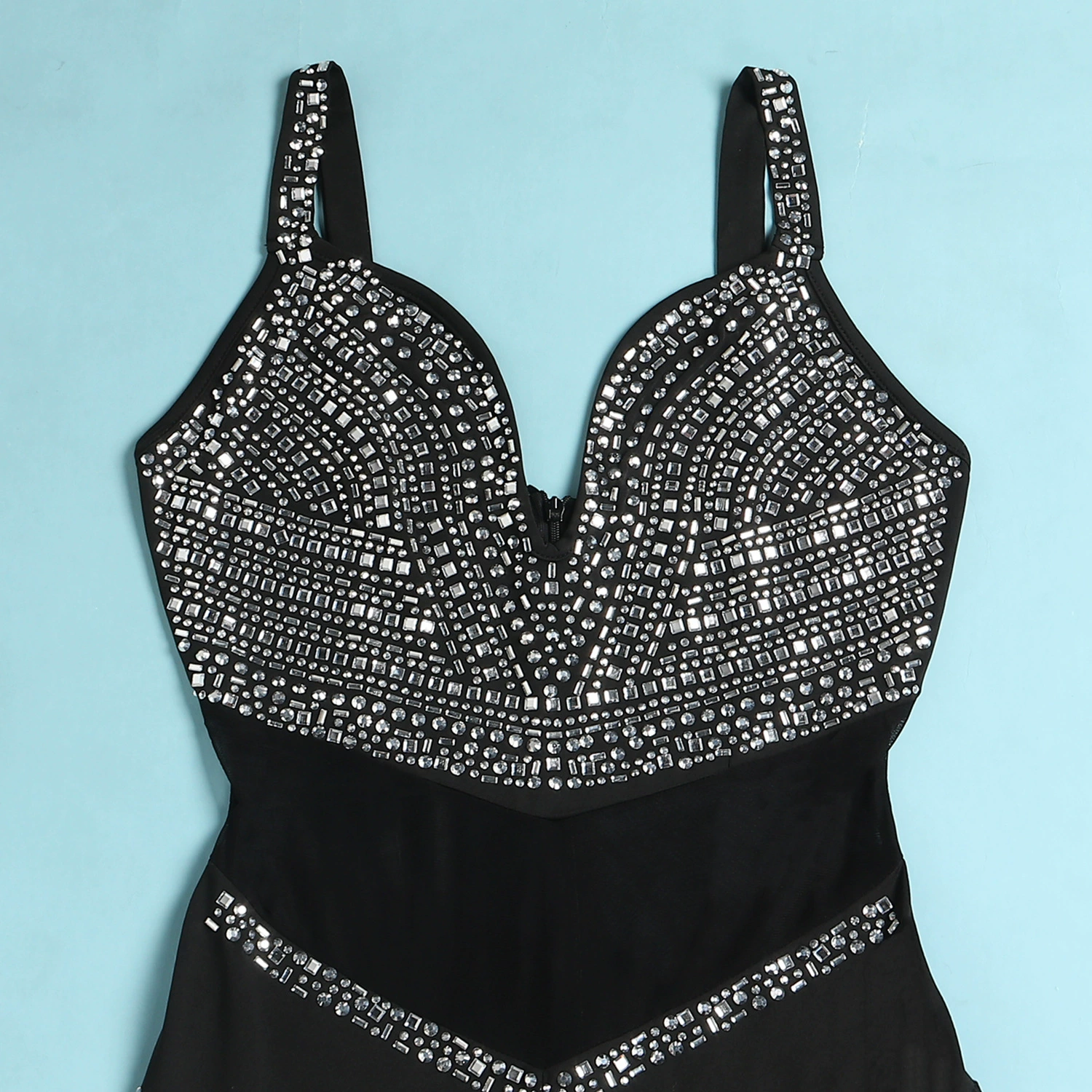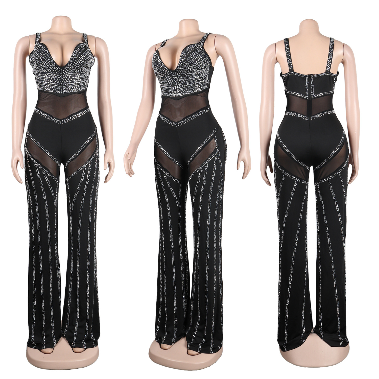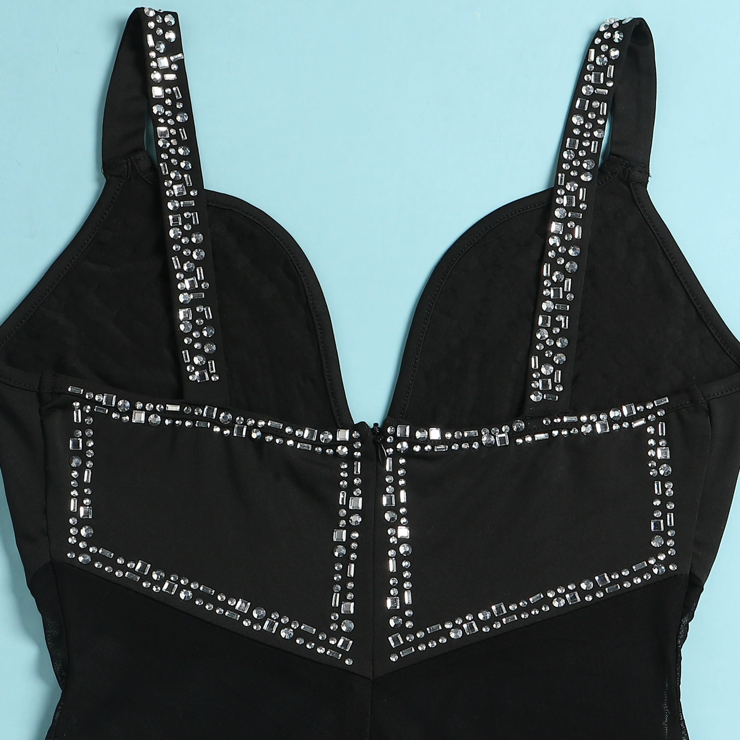 CM.YAYA Vintage Women Diamonds Hot Rhinestones Spaghetti Strap V-neck Mesh Patchwork Straight Jumpsuit Sexy Party Club Romper