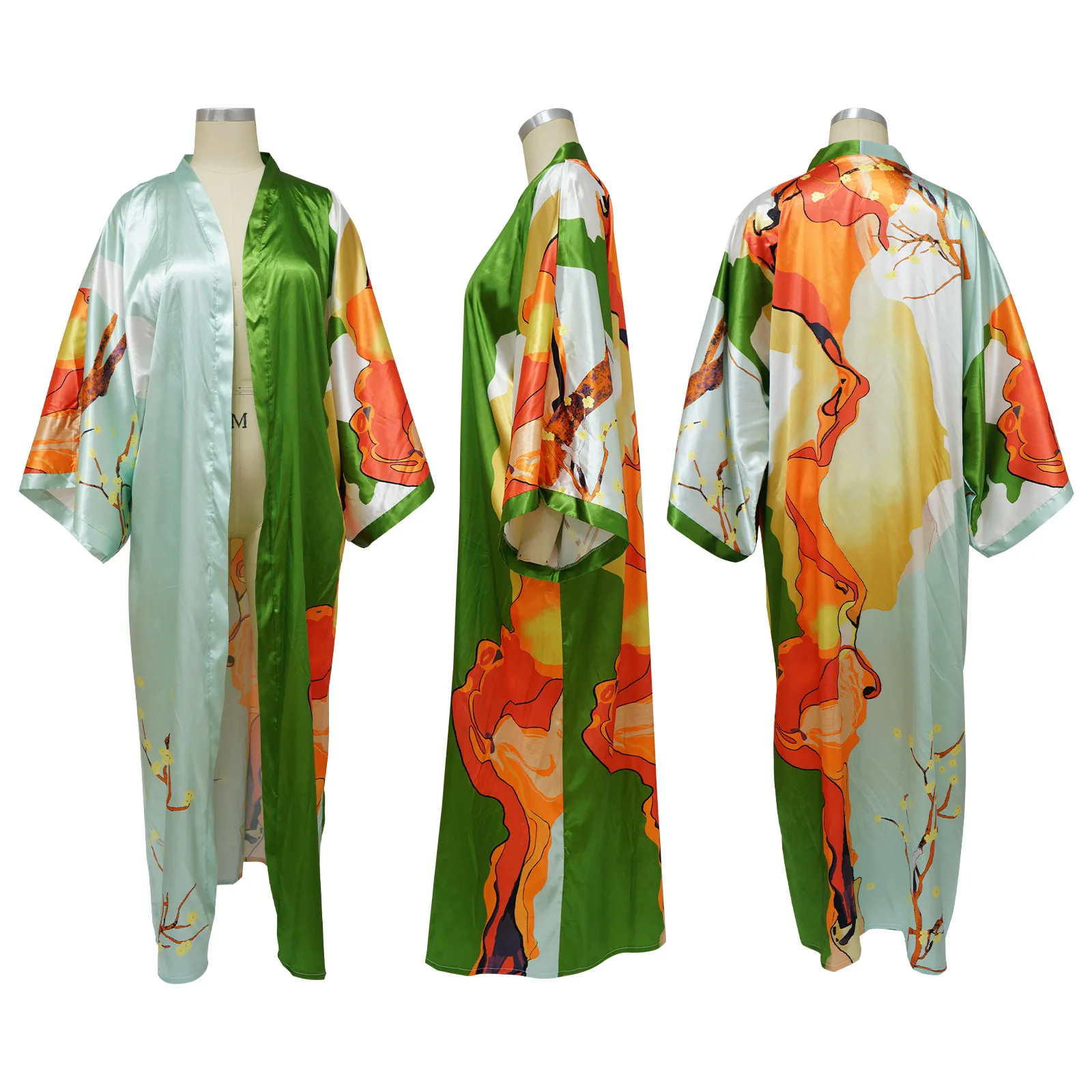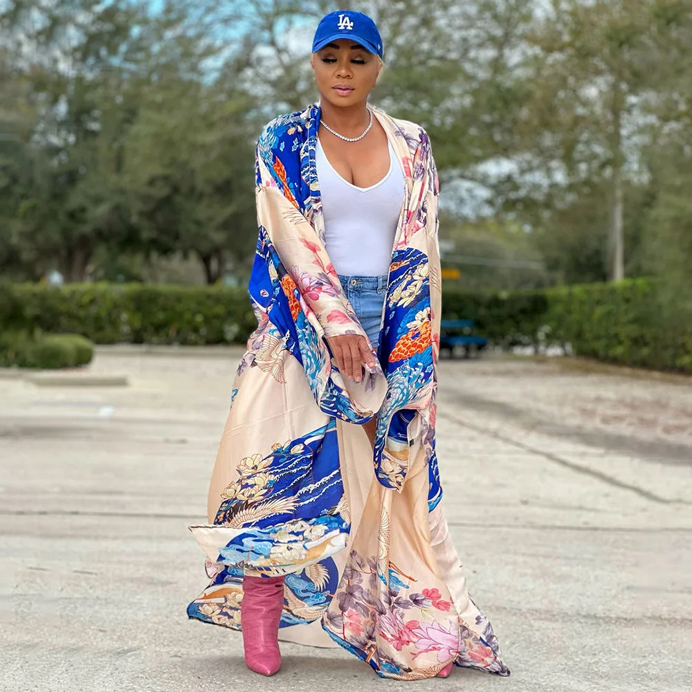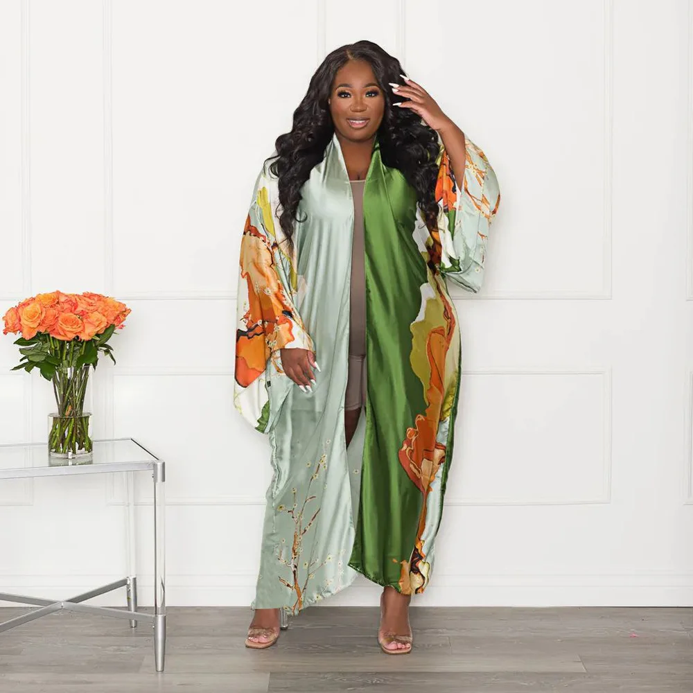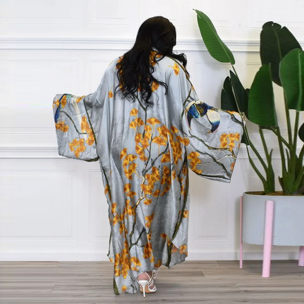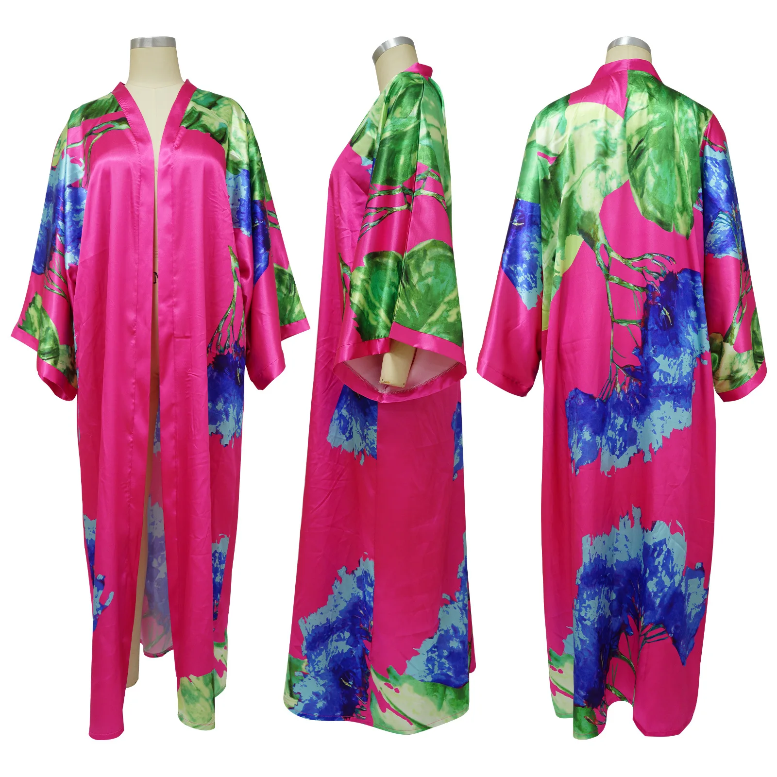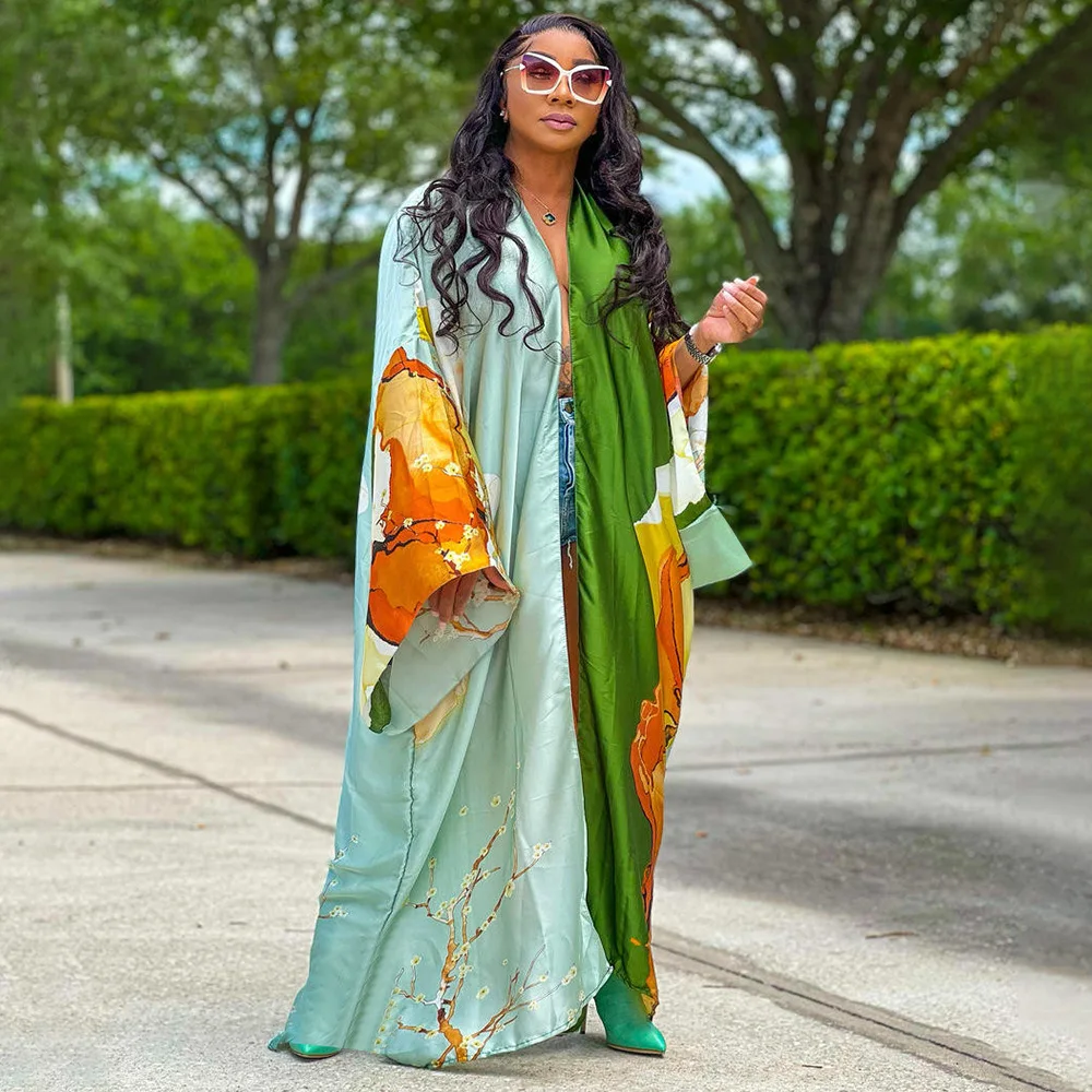 CM.YAYA Vintage Women Floral Printed Fake Silk Open Stitch Long Sleeve Loose Maxi Cover Up 2023 Summer Beach Long Robe Dresses