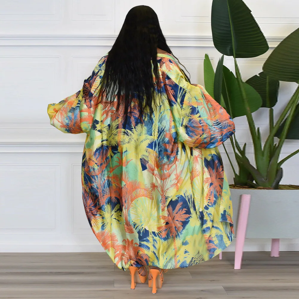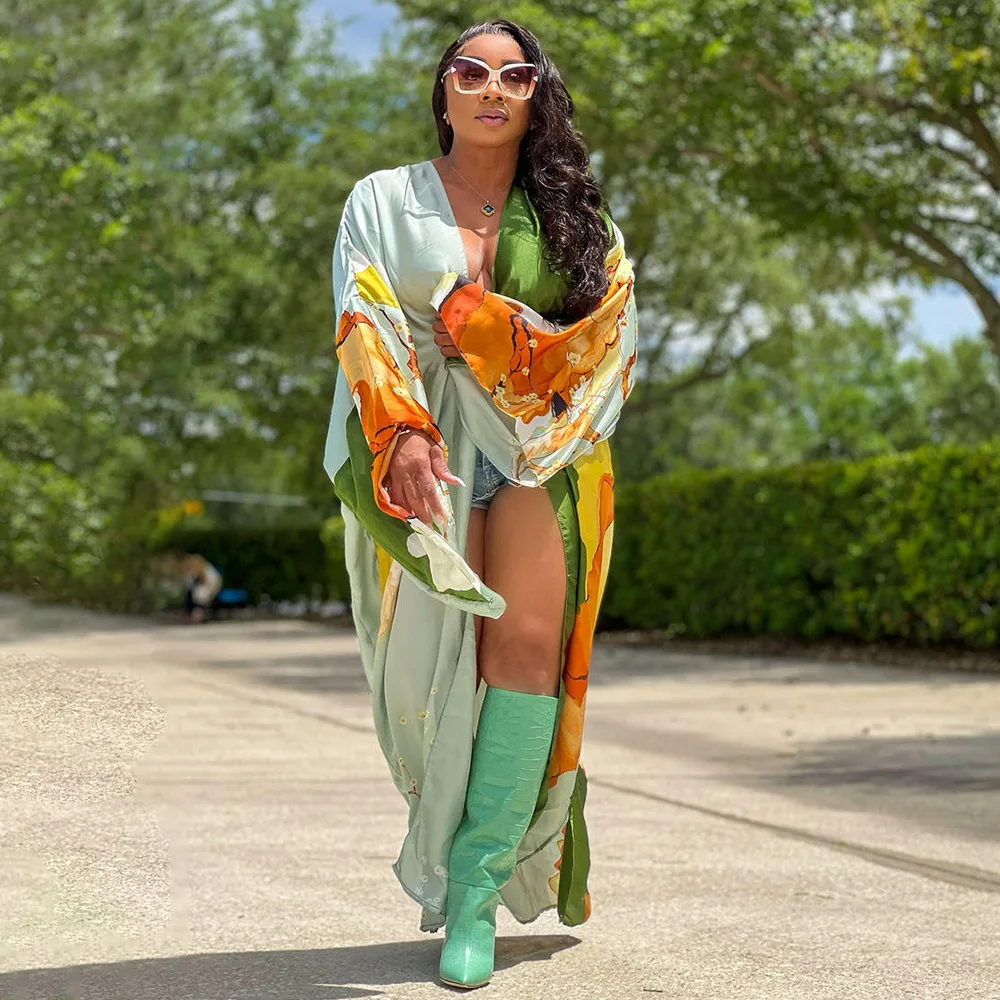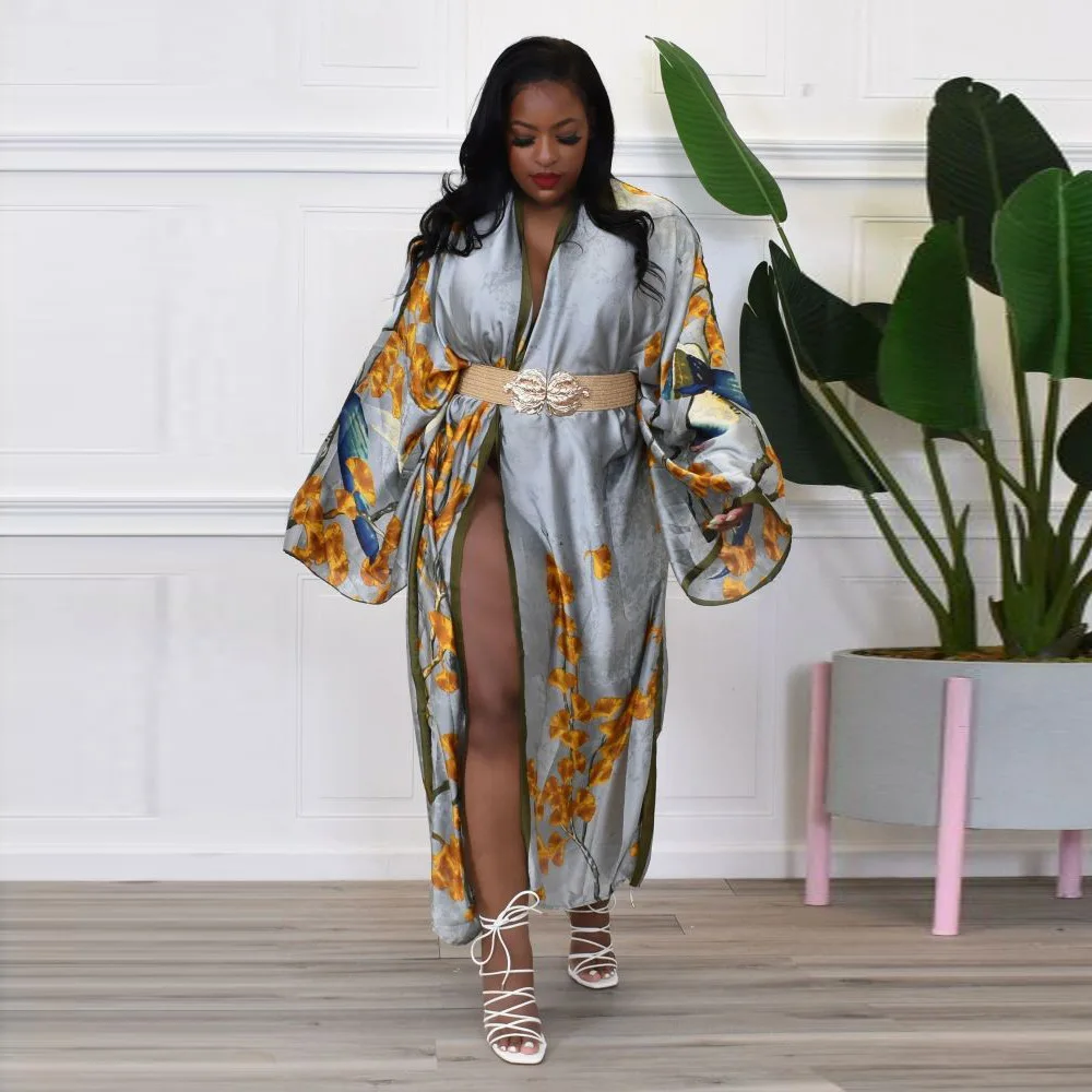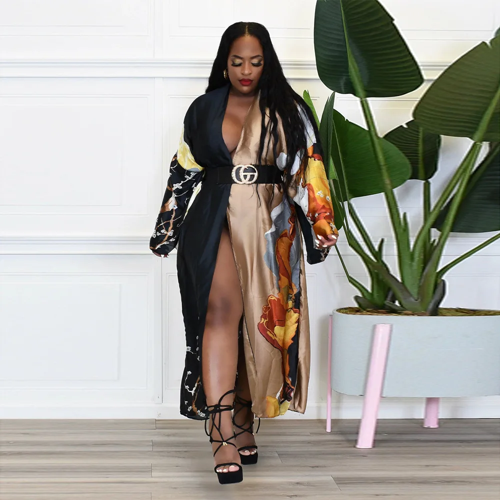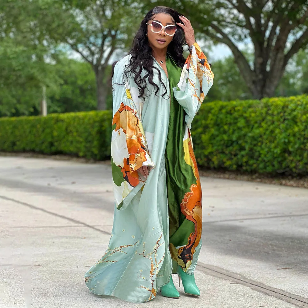 CM.YAYA Vintage Women Floral Printed Fake Silk Open Stitch Long Sleeve Loose Maxi Cover Up 2023 Summer Beach Long Robe Dresses