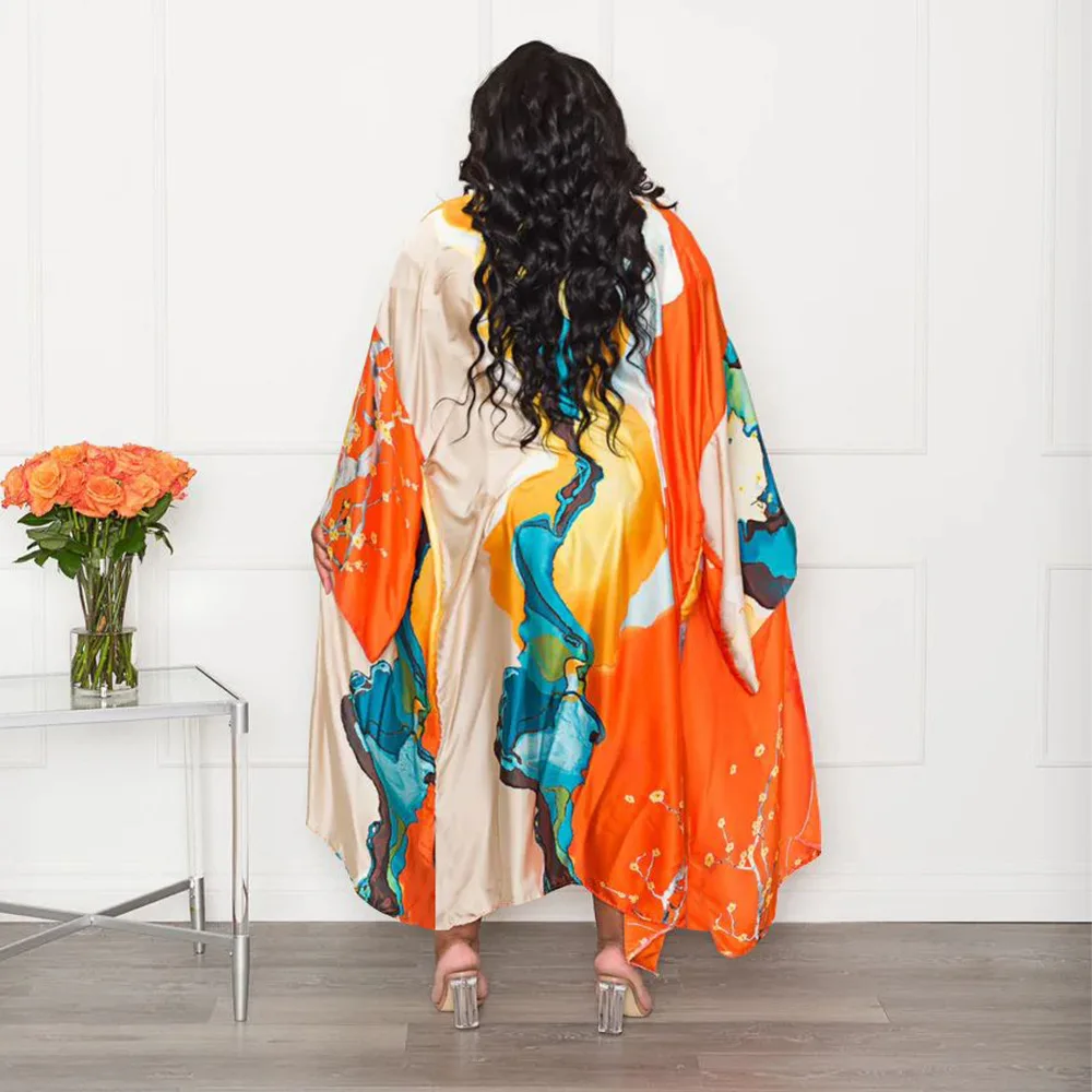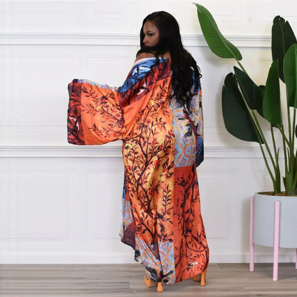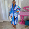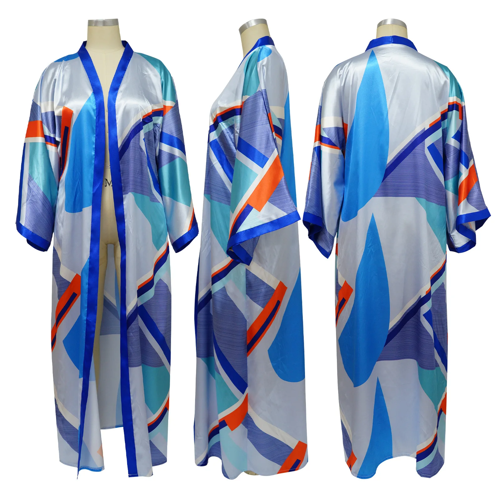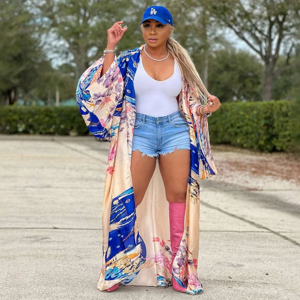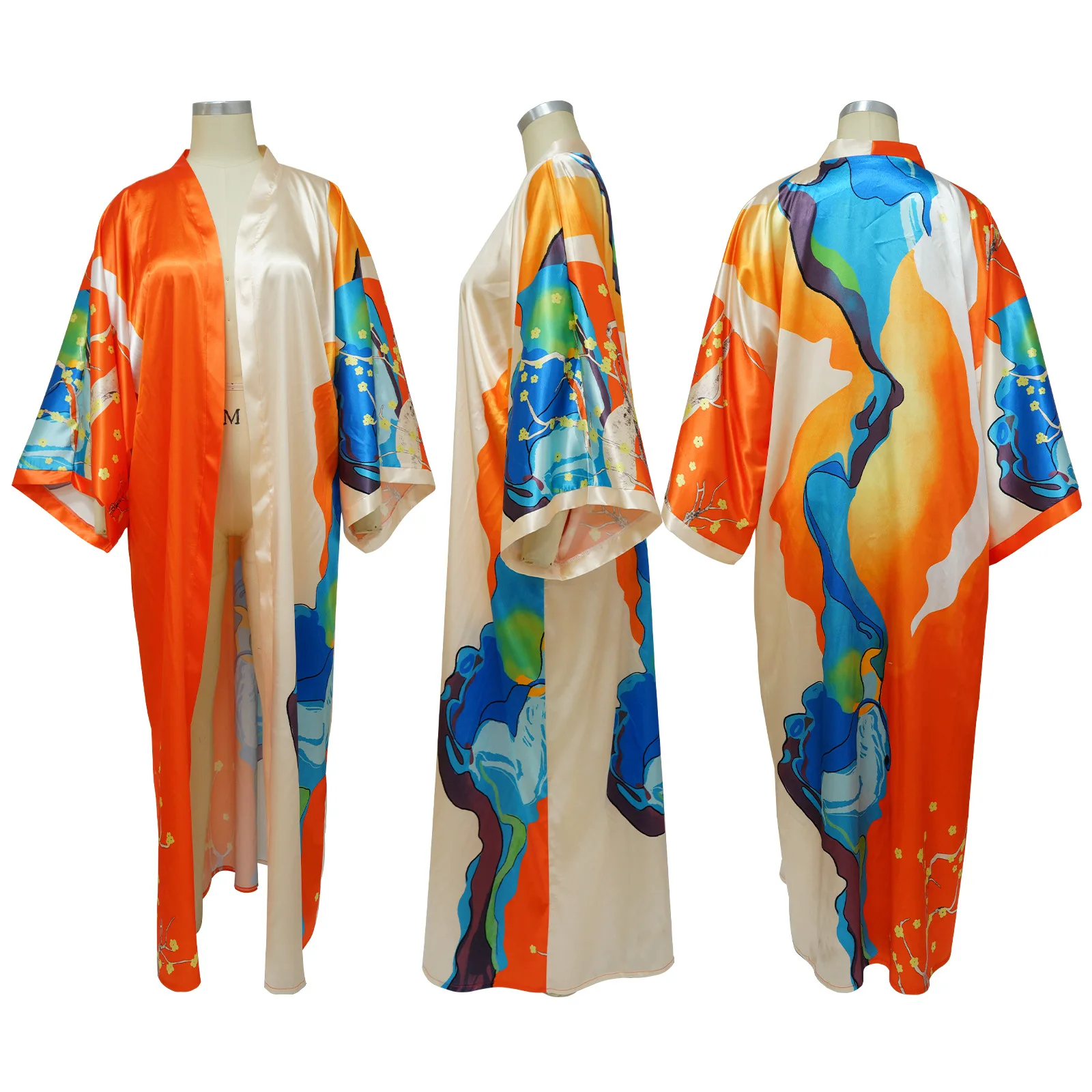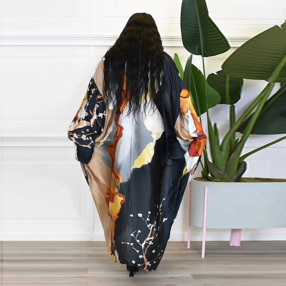 CM.YAYA Vintage Women Floral Printed Fake Silk Open Stitch Long Sleeve Loose Maxi Cover Up 2023 Summer Beach Long Robe Dresses