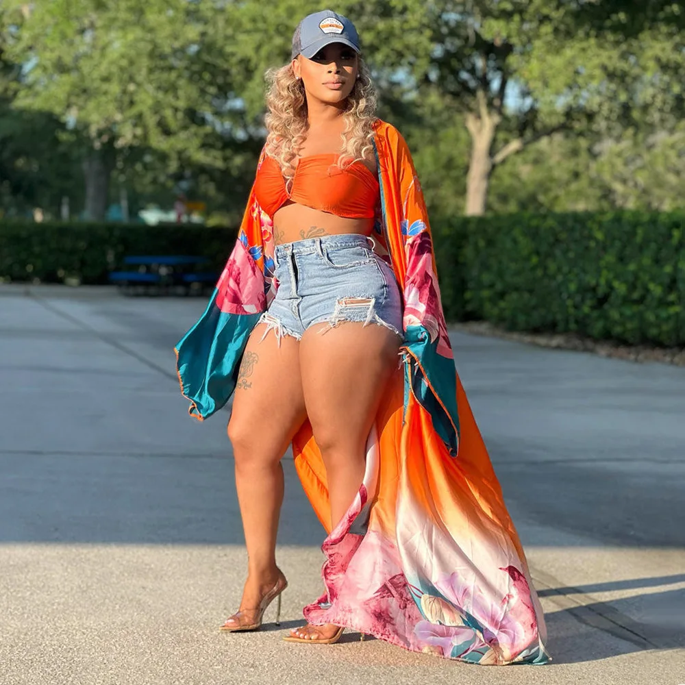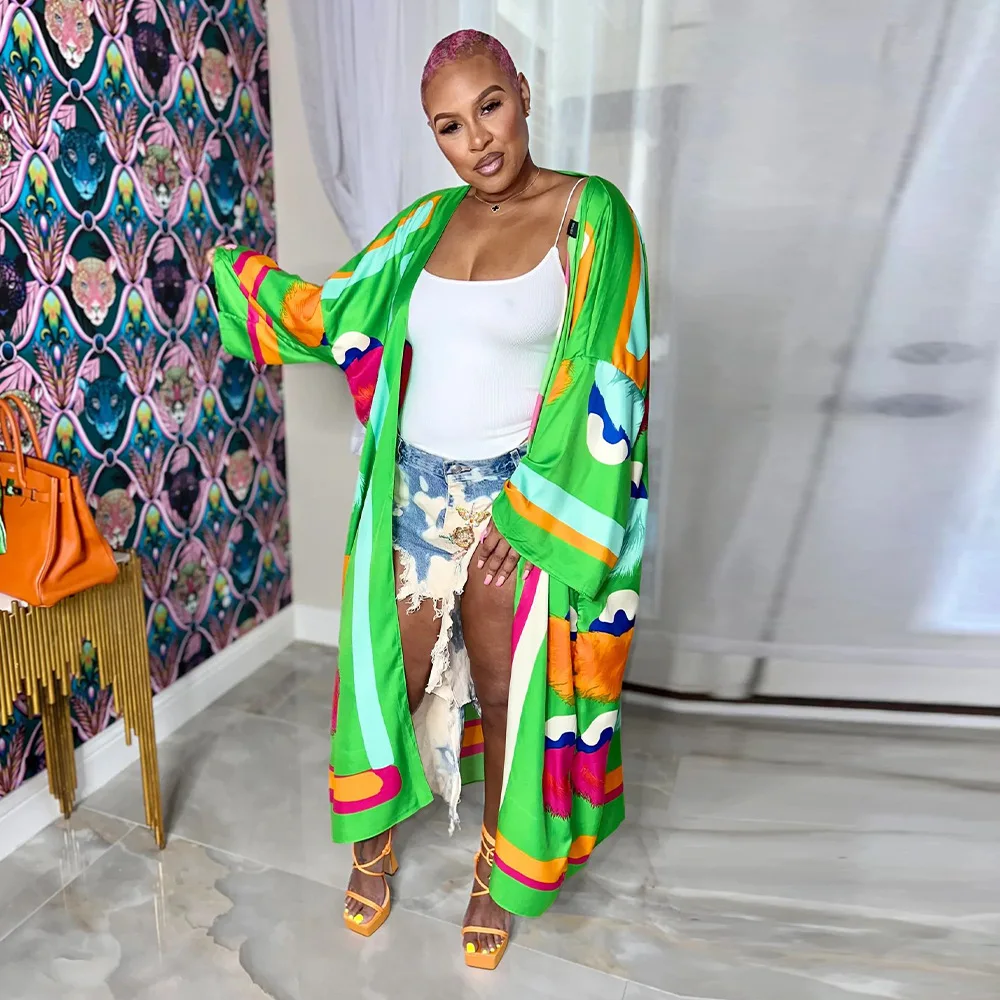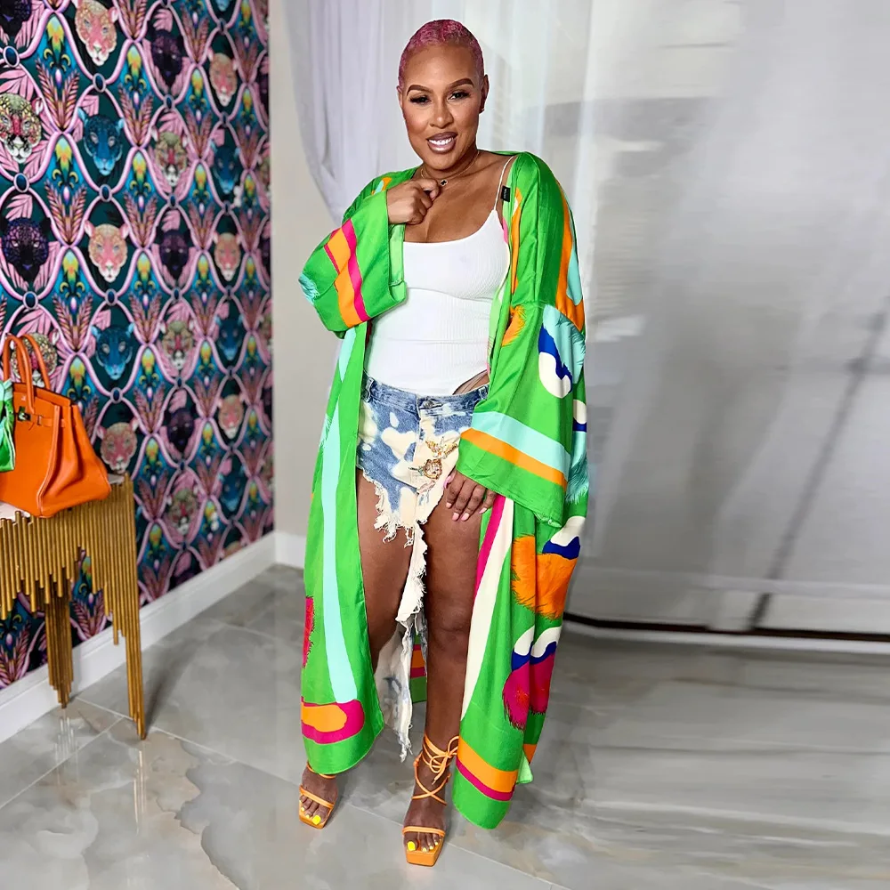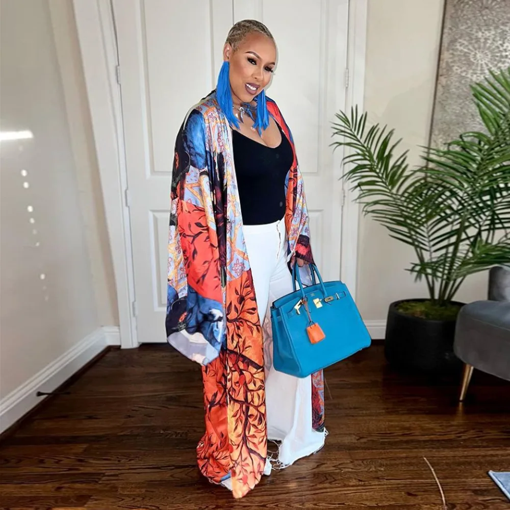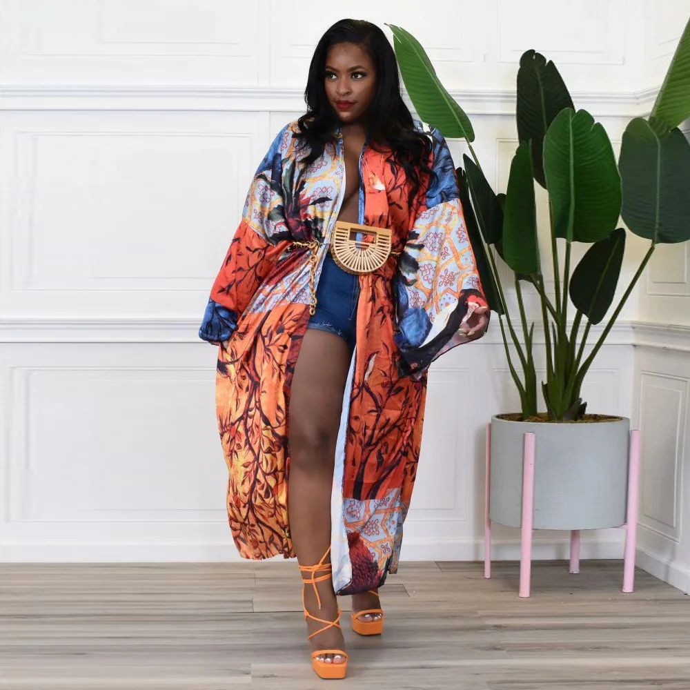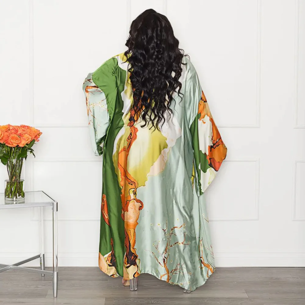 CM.YAYA Vintage Women Floral Printed Fake Silk Open Stitch Long Sleeve Loose Maxi Cover Up 2023 Summer Beach Long Robe Dresses