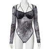CM.YAYA Vintage Women Mesh See Through Print Long Sleeve Strapless Bodysuit 2025 Fall Femalle Sexy Party Streetwear T-shirt Tops