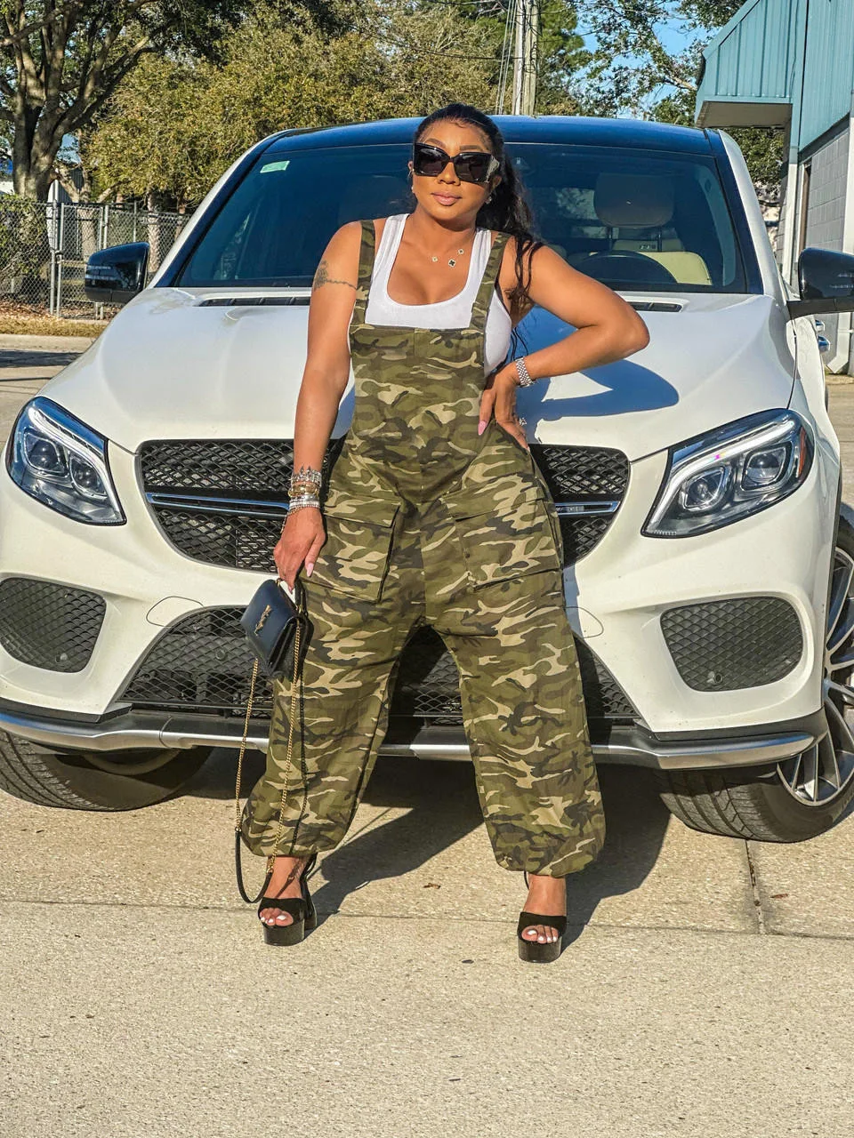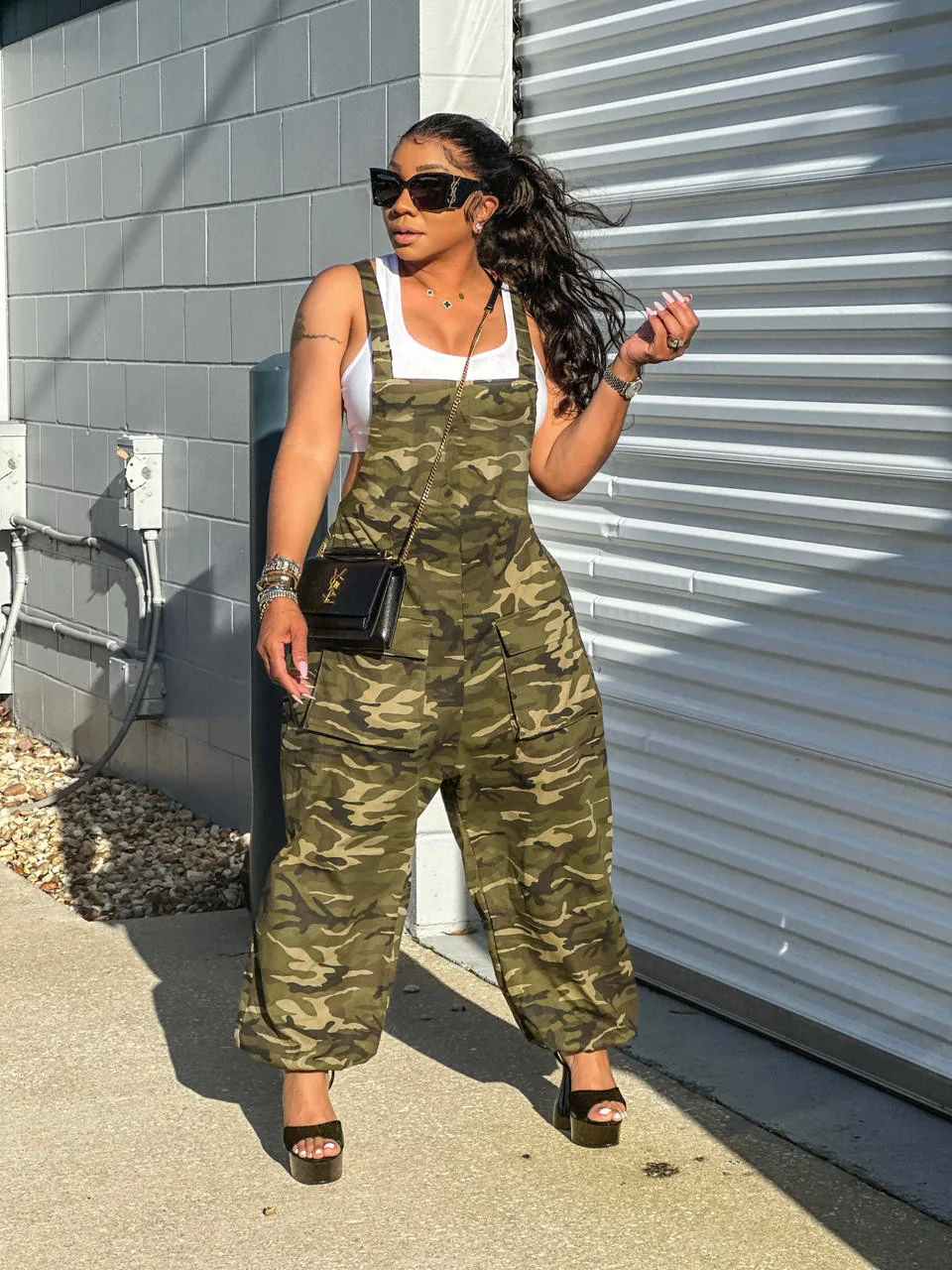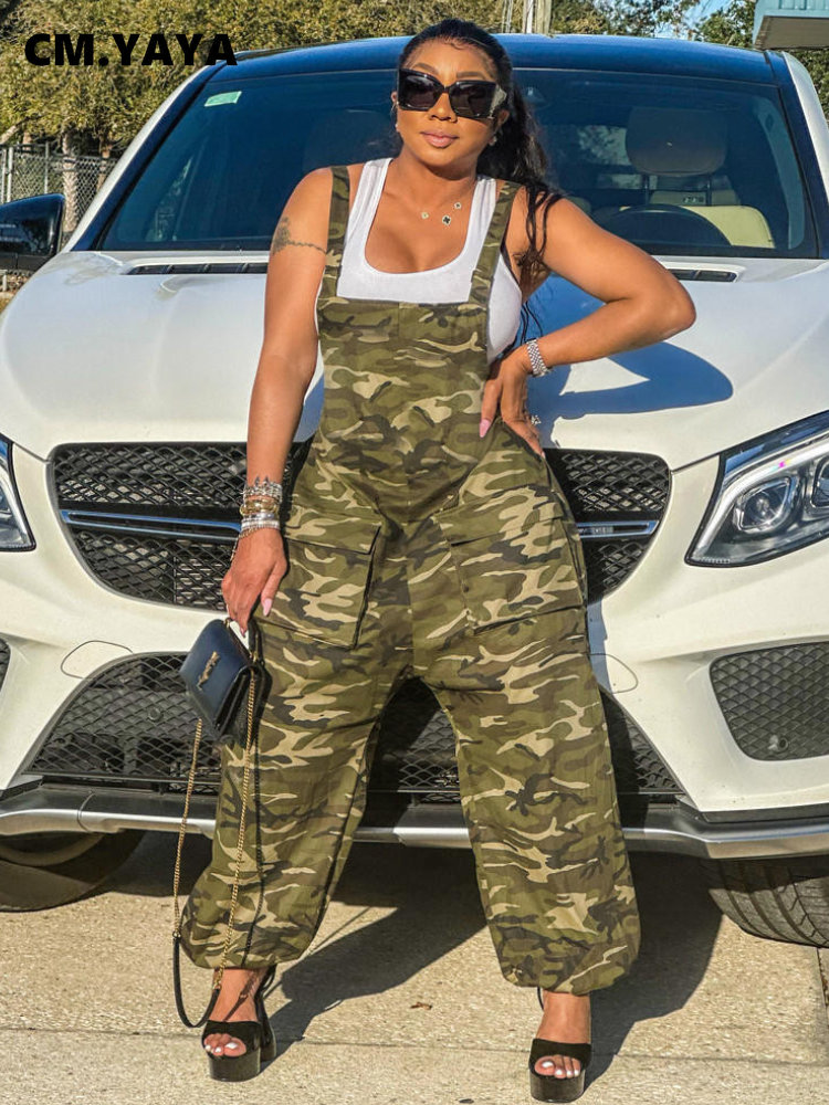 CM.YAYA Women Camouflage Spaghetti Strap Pocket Front Cargo Romper Pants Sleeveless Jumpsuit Street INS Playsuit One Piece Set