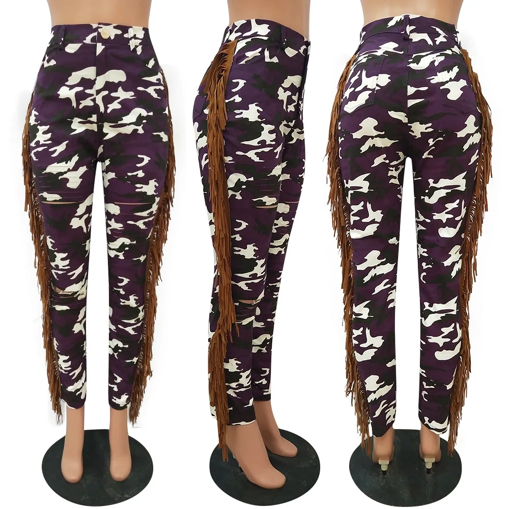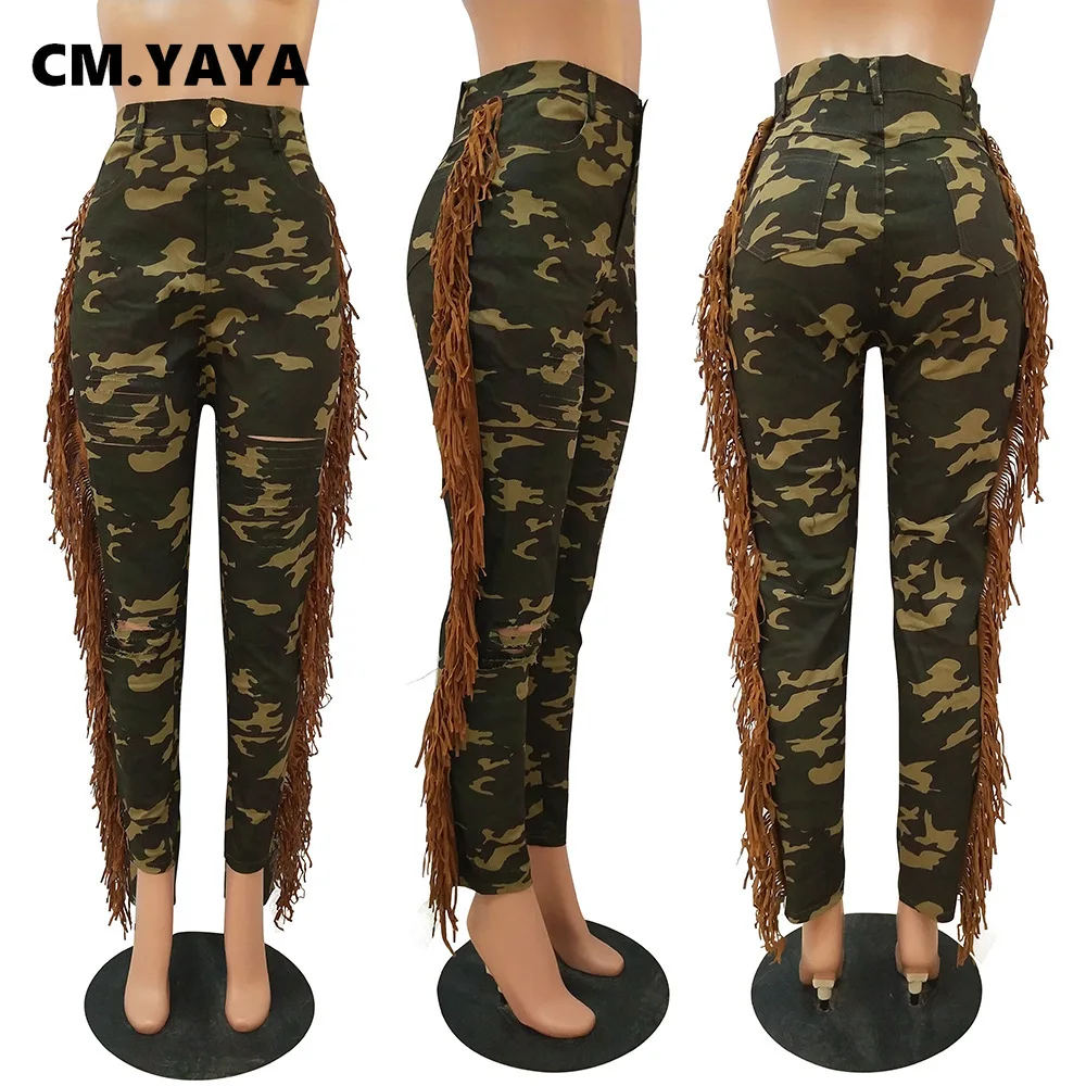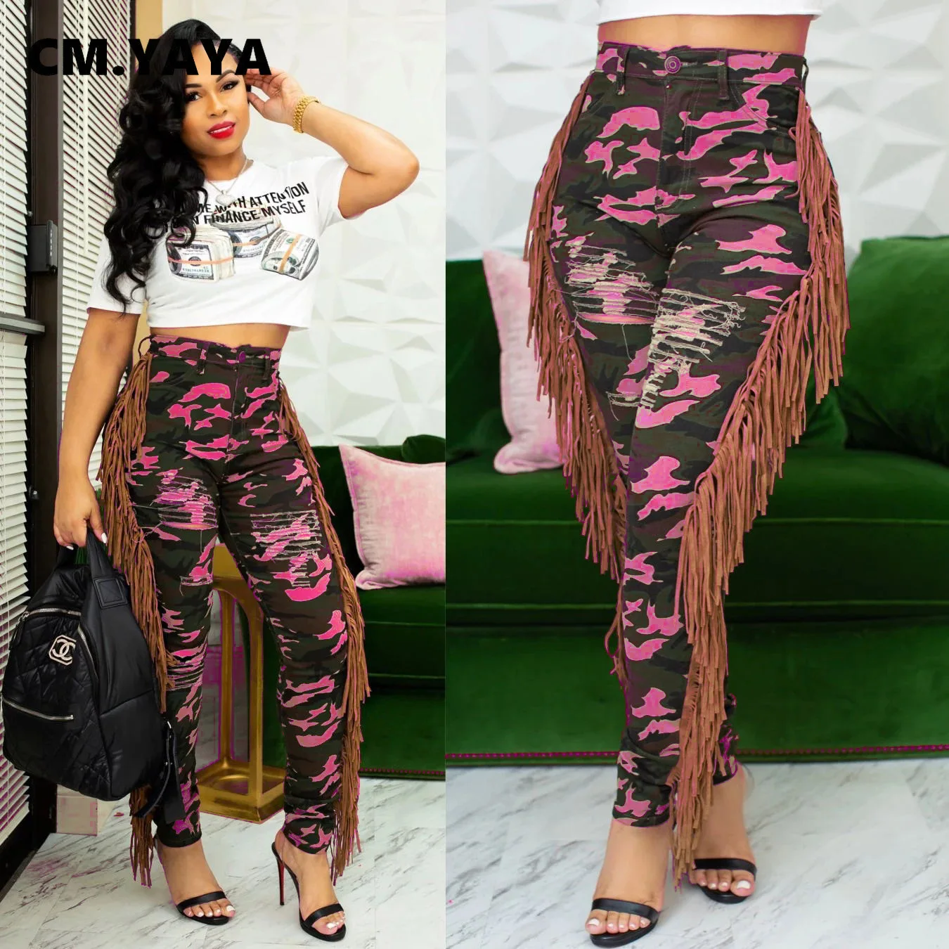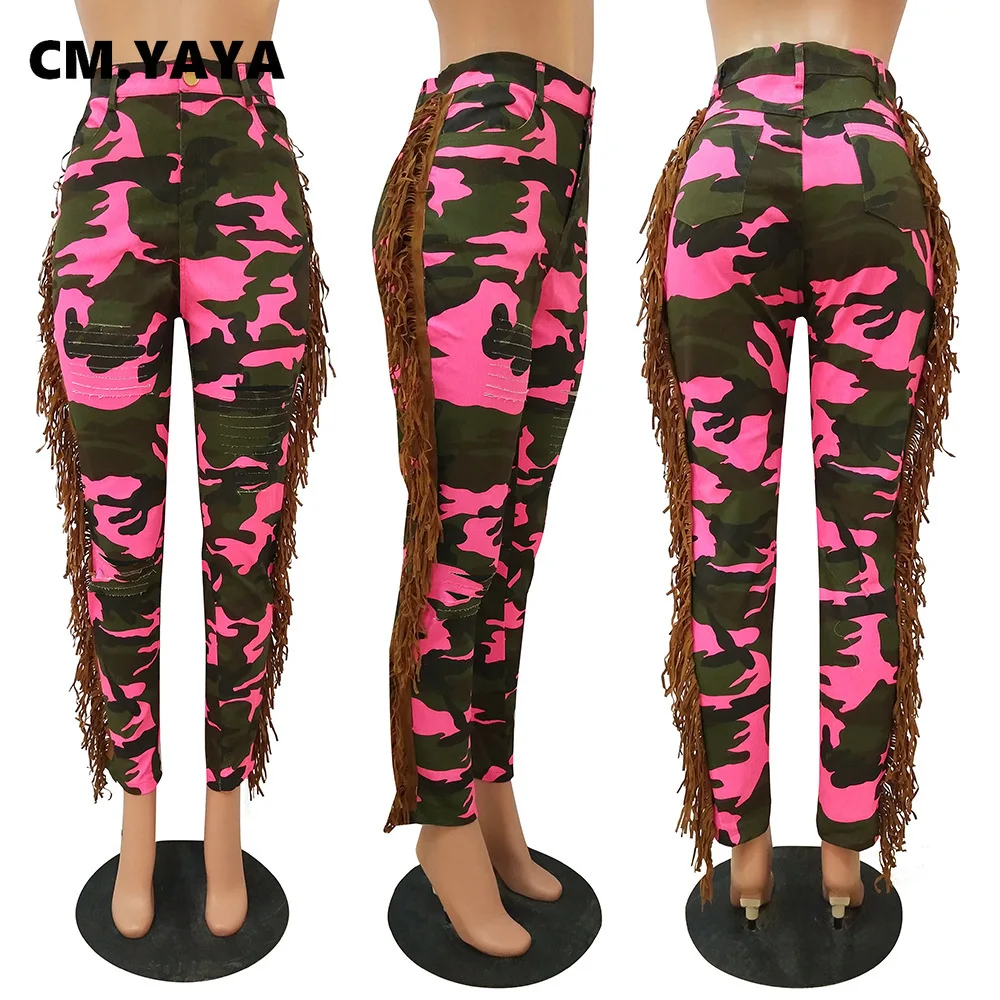 CM.YAYA Women Camouflage Tassel Side Splicing Zipper Fly Ripped Jeans Elegant Fashion High Waist Denim Trousers Pants
