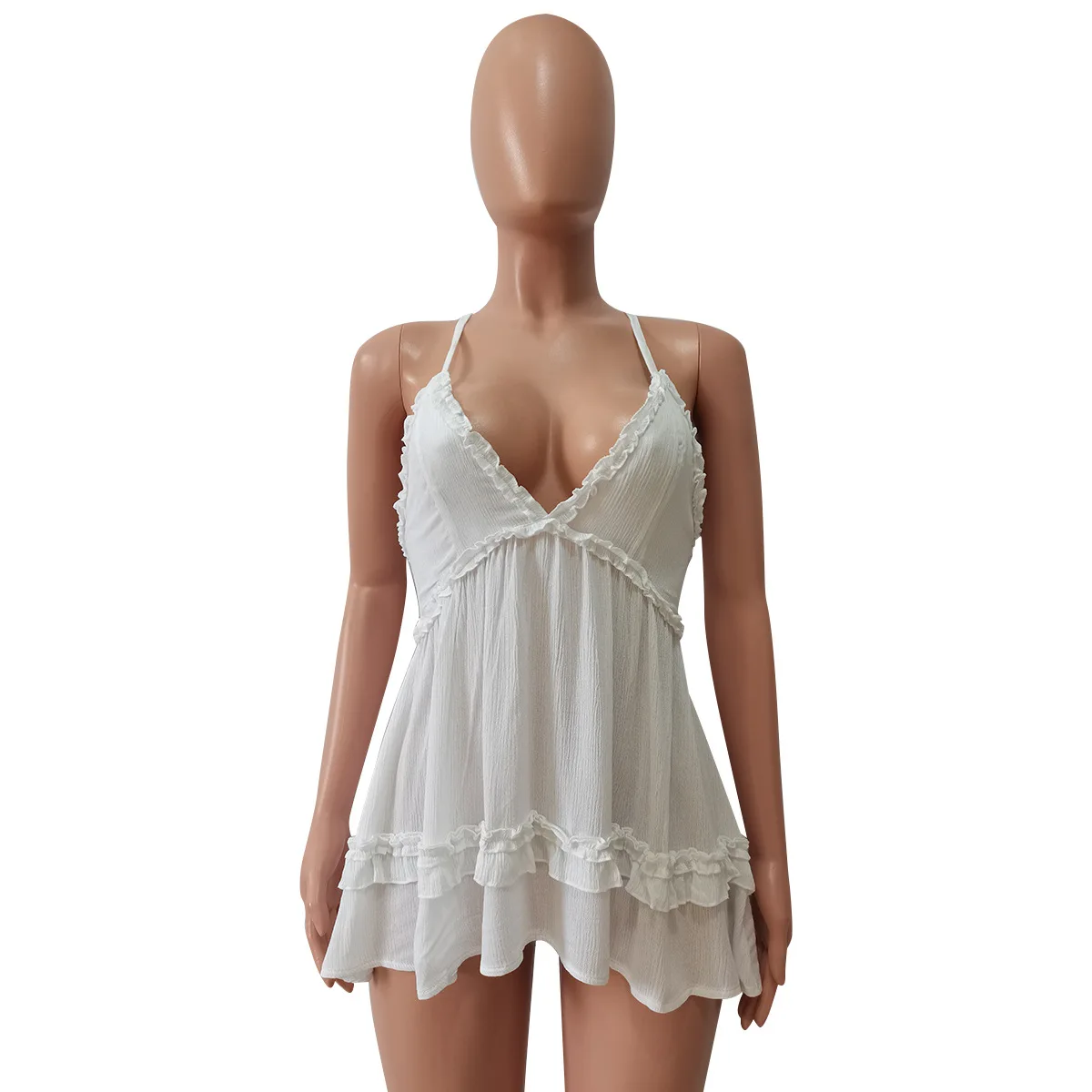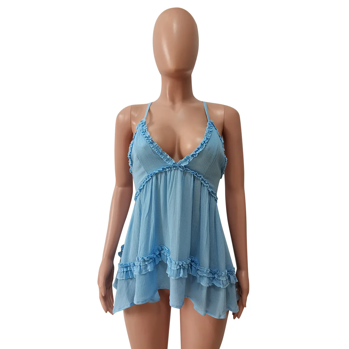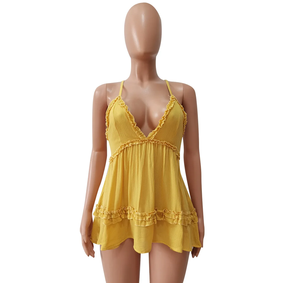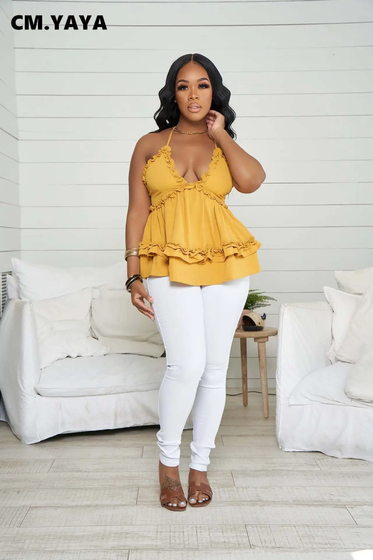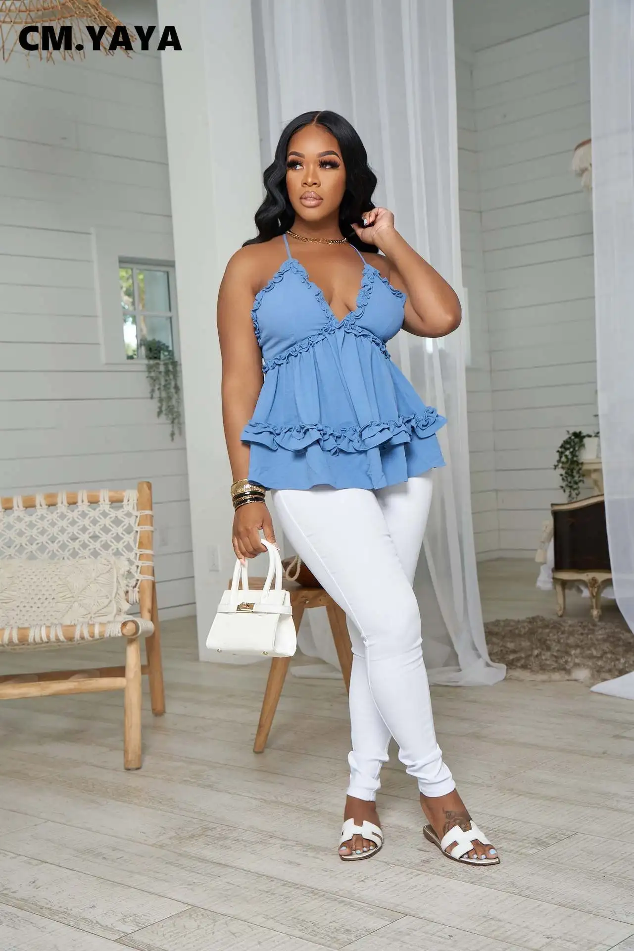 CM.YAYA Women Cascading Ruffles Hem Spaghetti Strap V-neck Backless Shirt Top 2022 Summer Elegant Blouses Pink Mini Dress