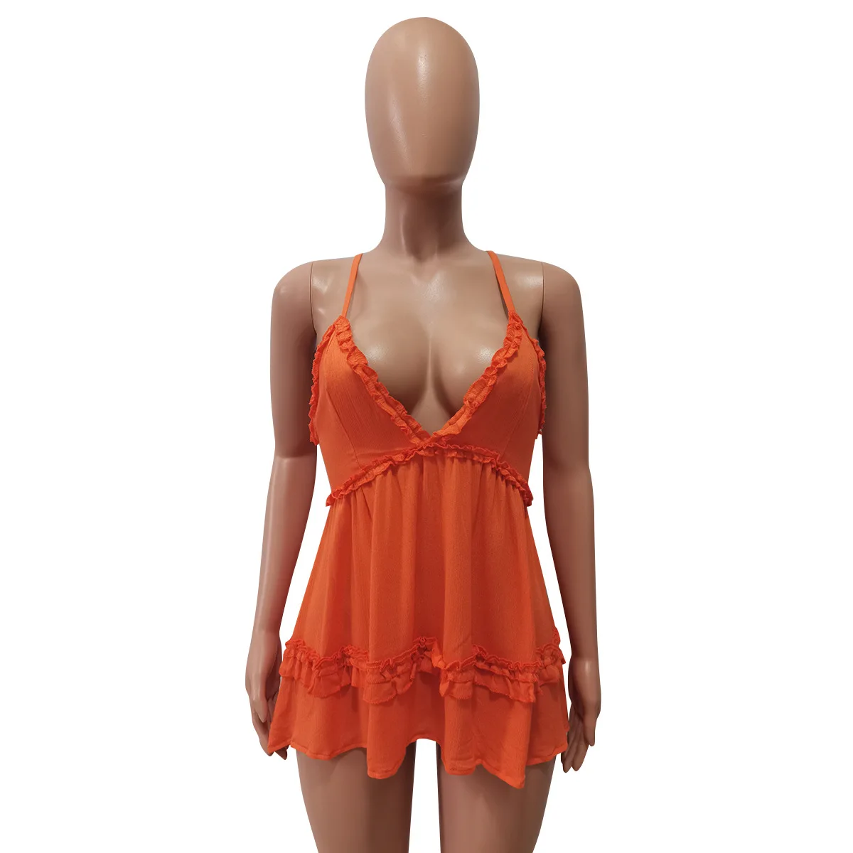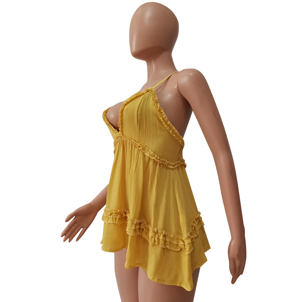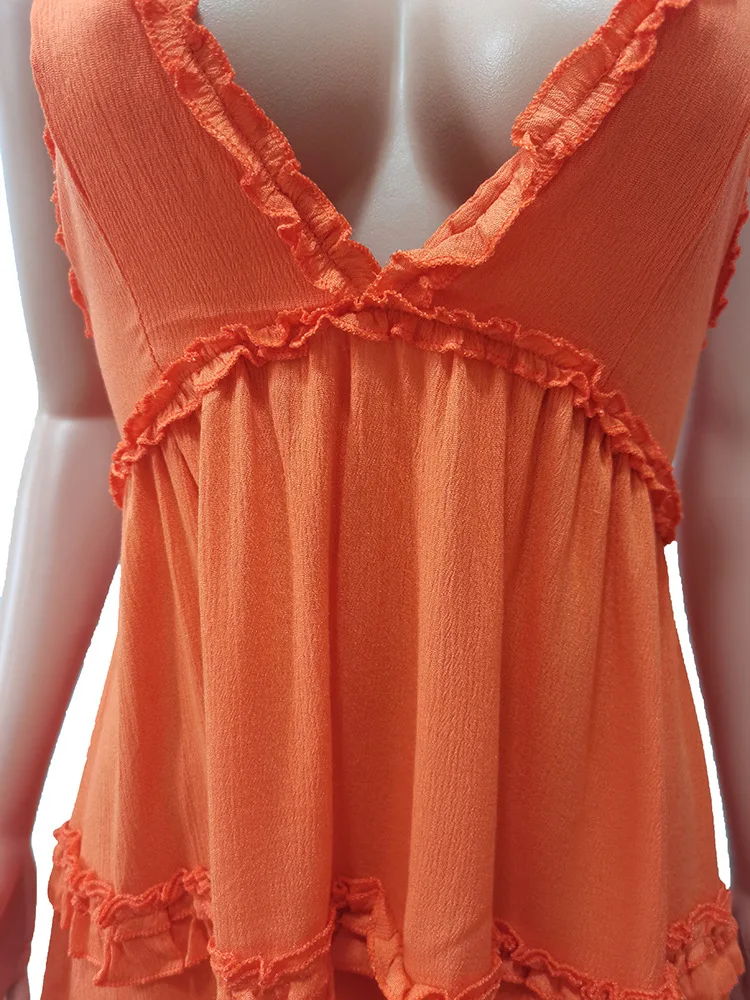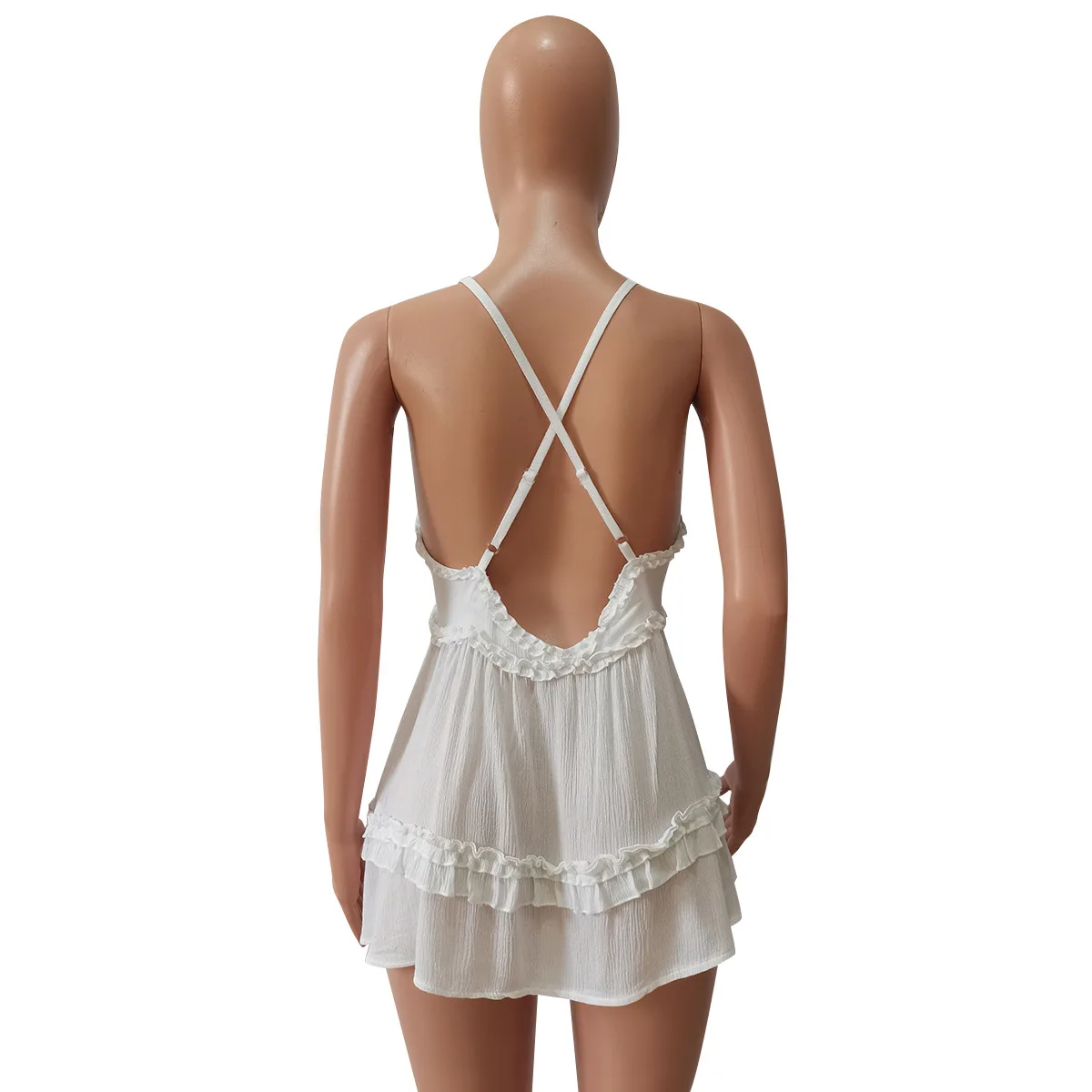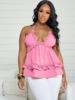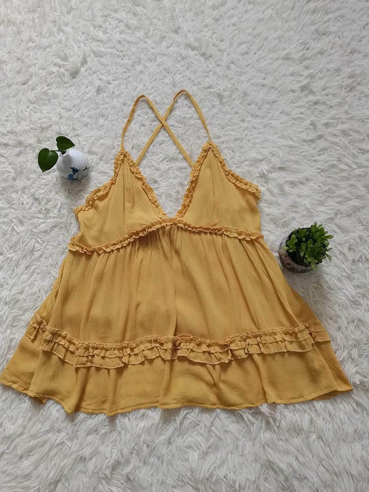 CM.YAYA Women Cascading Ruffles Hem Spaghetti Strap V-neck Backless Shirt Top 2022 Summer Elegant Blouses Pink Mini Dress
