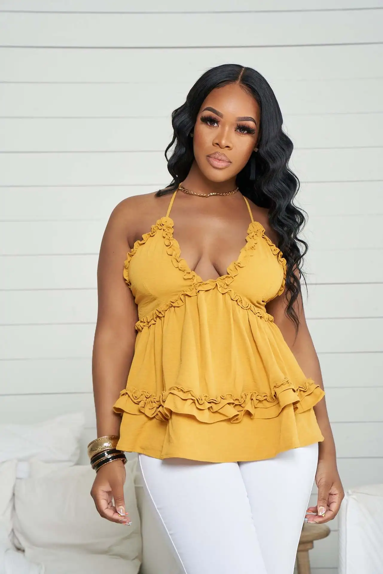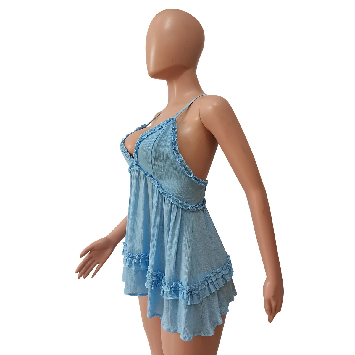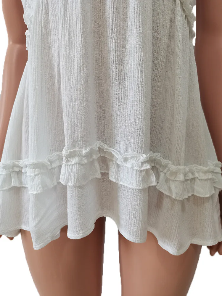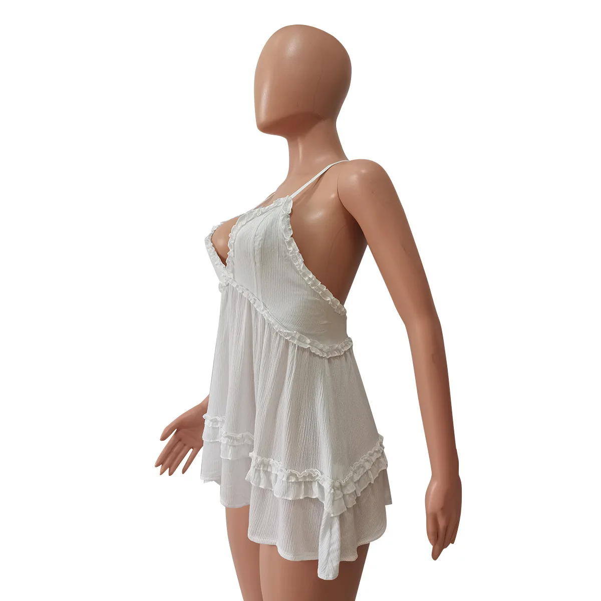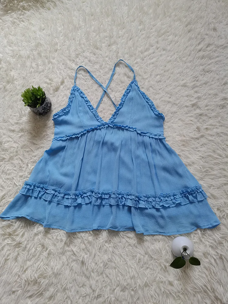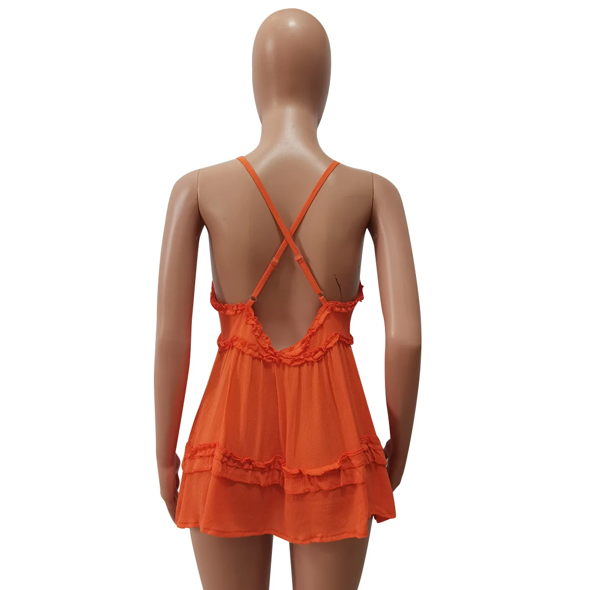 CM.YAYA Women Cascading Ruffles Hem Spaghetti Strap V-neck Backless Shirt Top 2022 Summer Elegant Blouses Pink Mini Dress