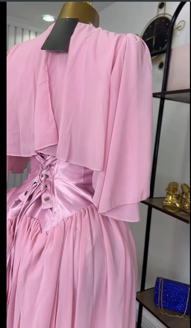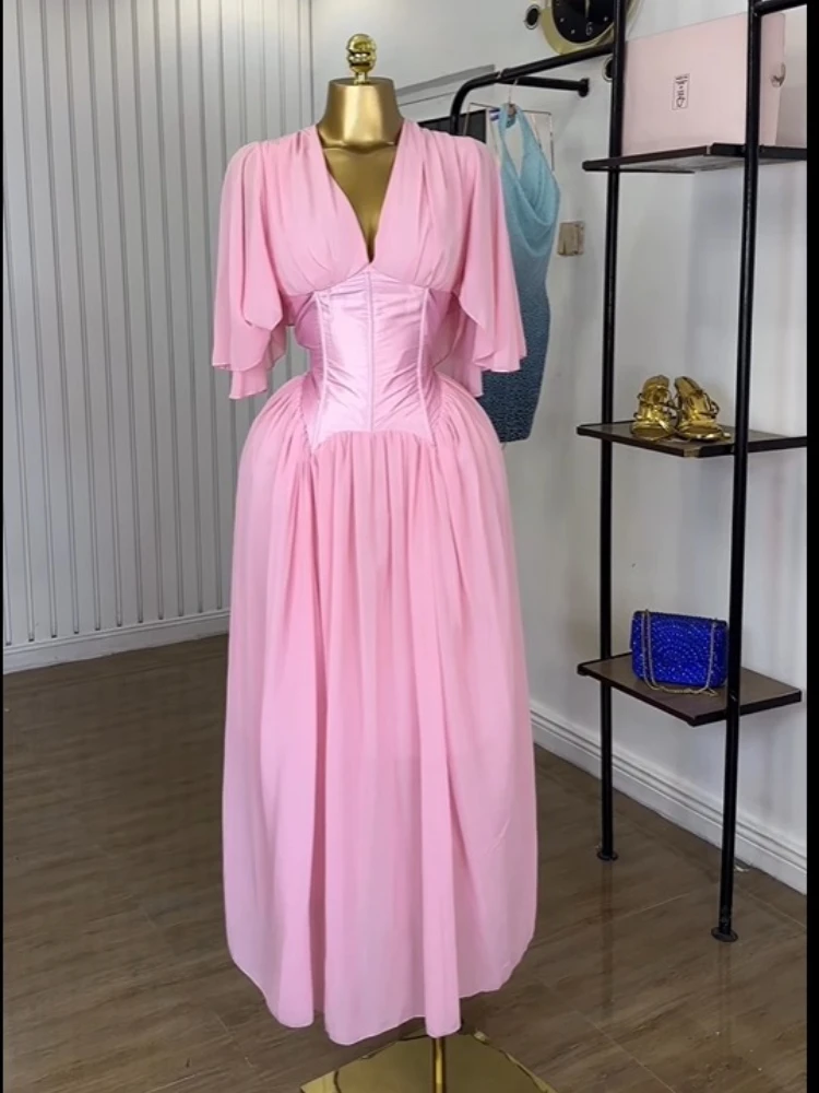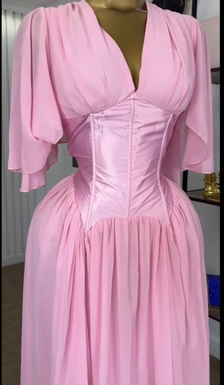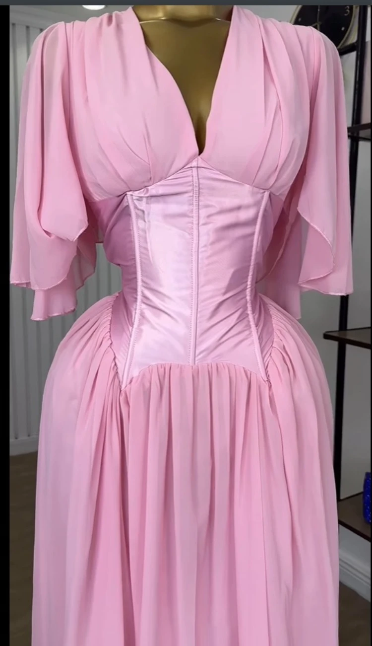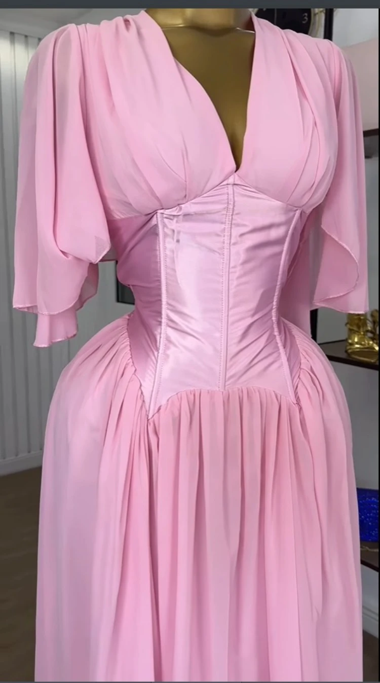 CM.YAYA Women Chiffon Flare Half Sleeve V-neck Tunic High Waist Lace Up Back Maxi Long Dress Birthday Vacation Beach Dresses