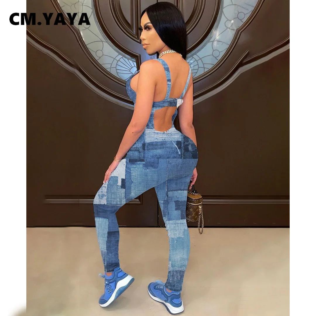 CM.YAYA Women Cut Out Fake Jeans Print Jumpsuit Sexy Sleeveless Skinny Active One piece Overall Bodycon Romper Outfit Playsuit