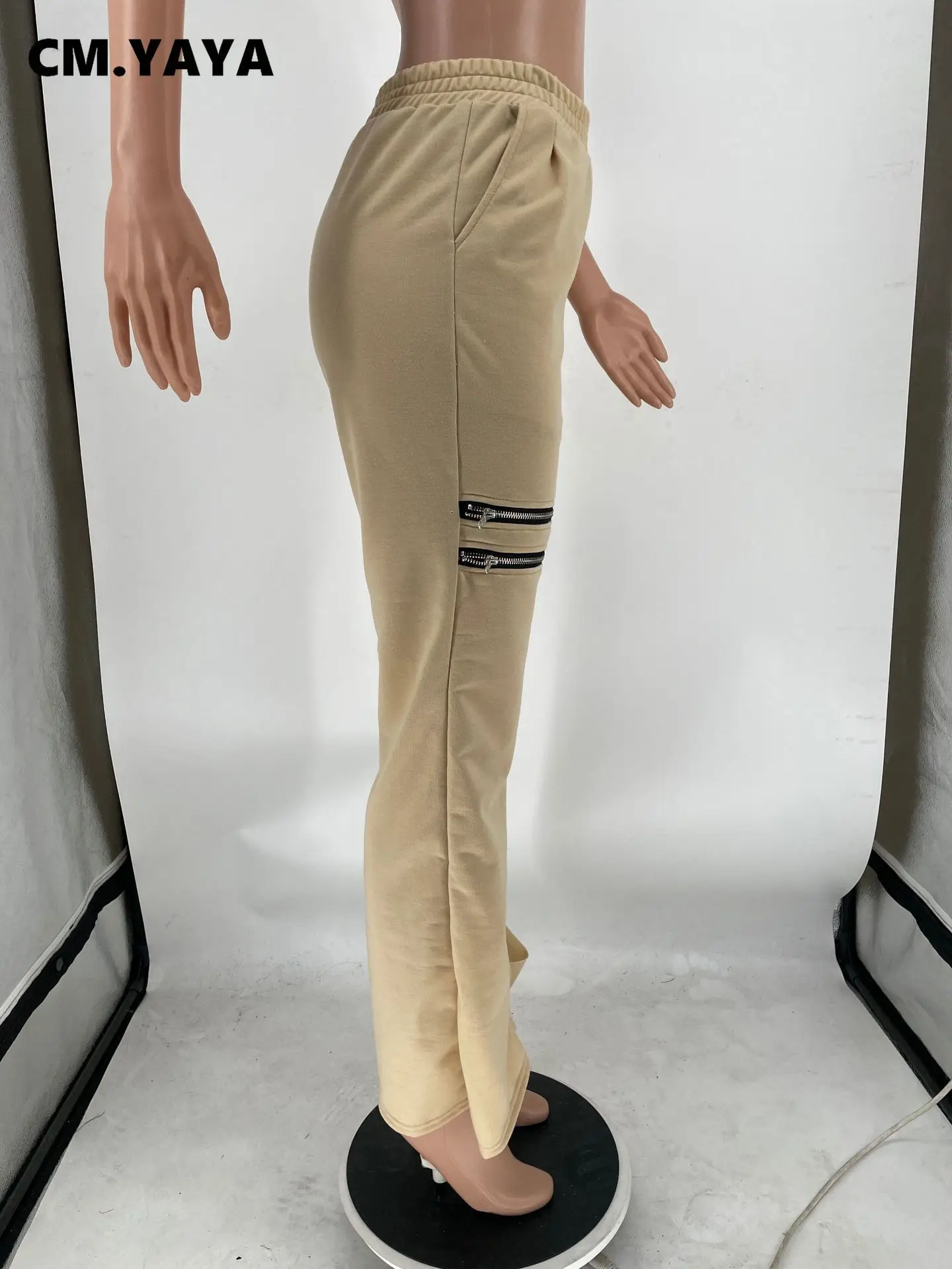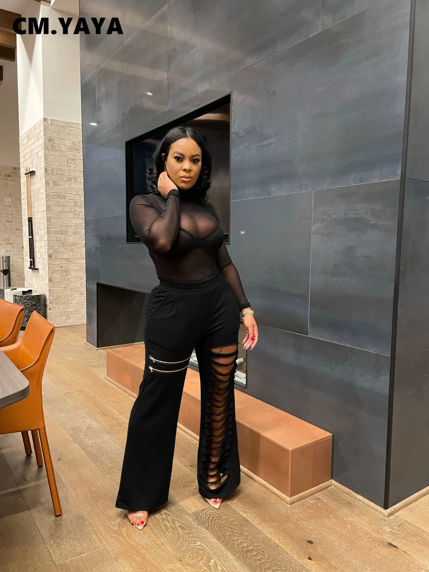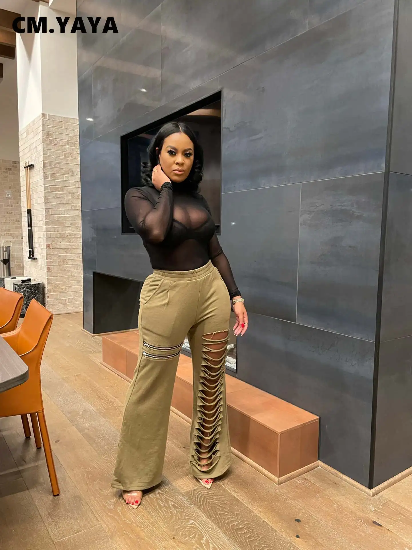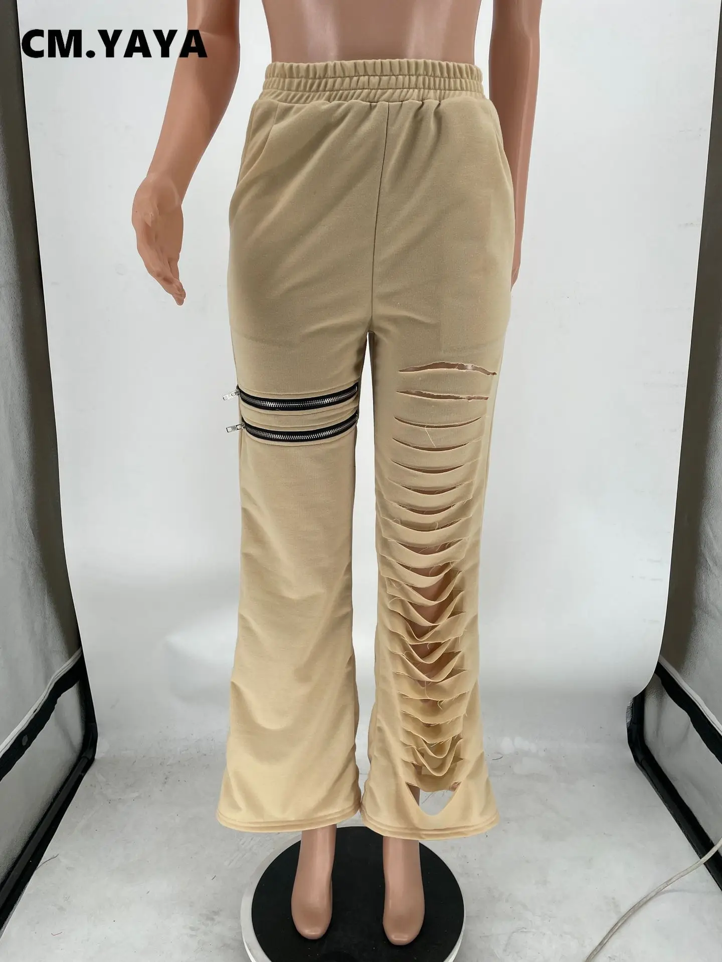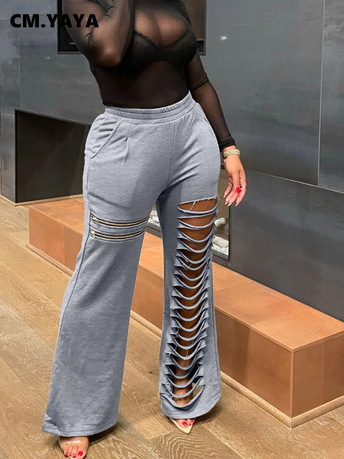 CM.YAYA Women Cut Out Hole Ripped Zipper Patchwork Straight Pants 2022 Summer Spring Streetwear Sport Basic Fashion Trousers