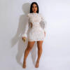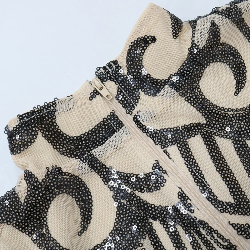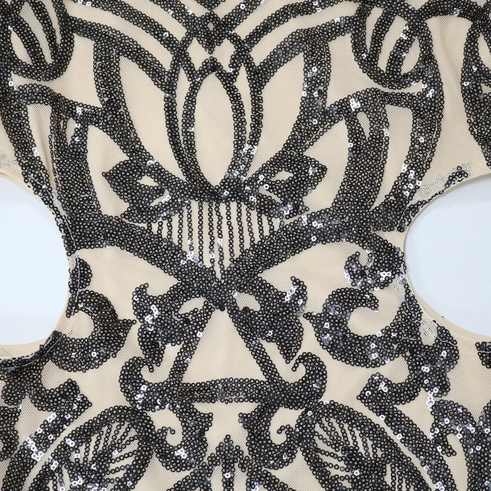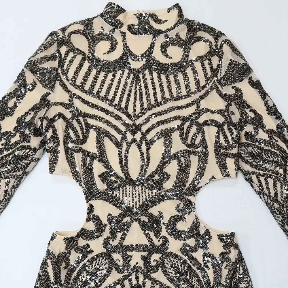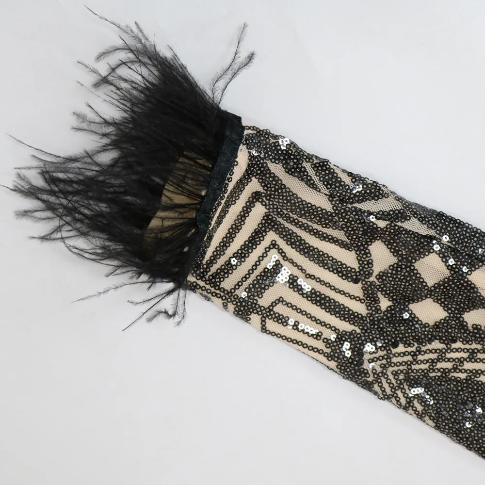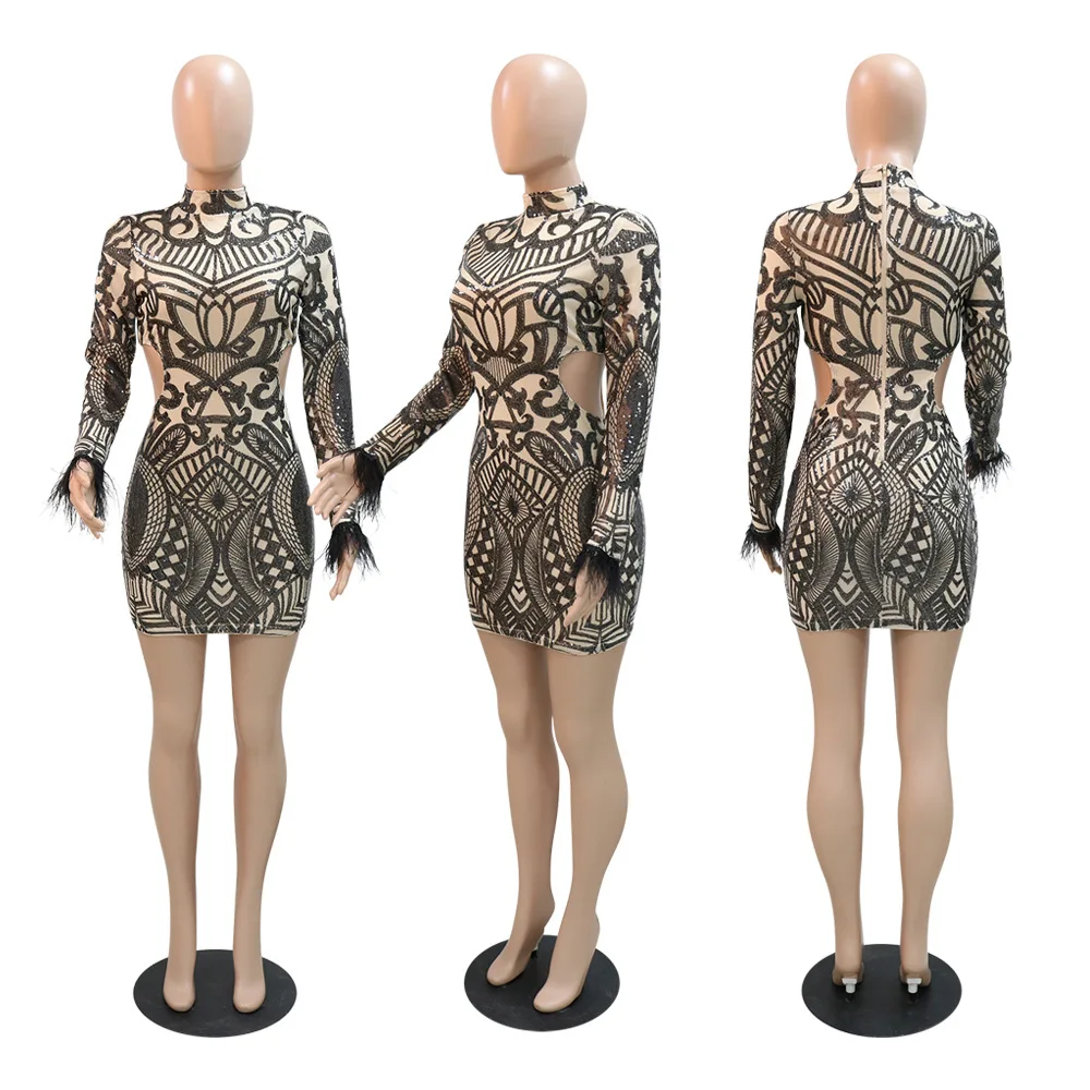 CM.YAYA Women Cutout Waist Mesh Sequined Paisley Fur Hem Long Sleeve Bodycon Midi Dress 2023 INS Evening Sexy Party Club Dresses