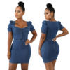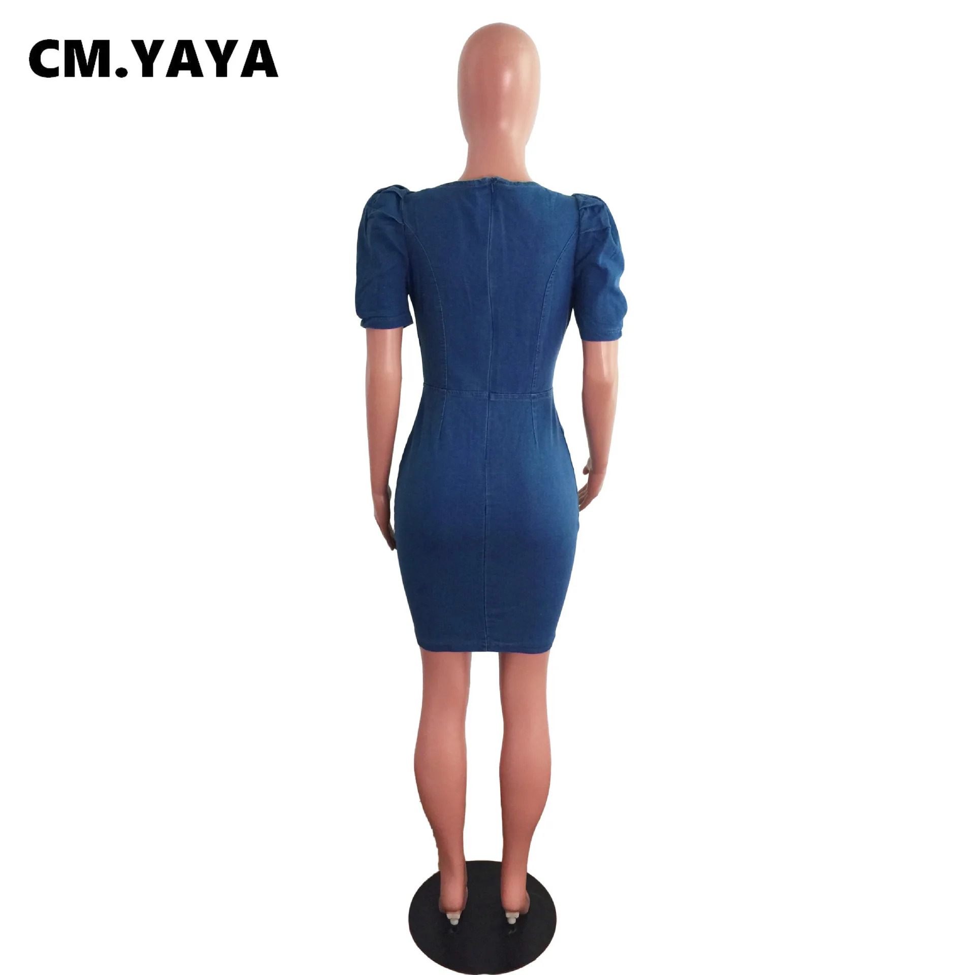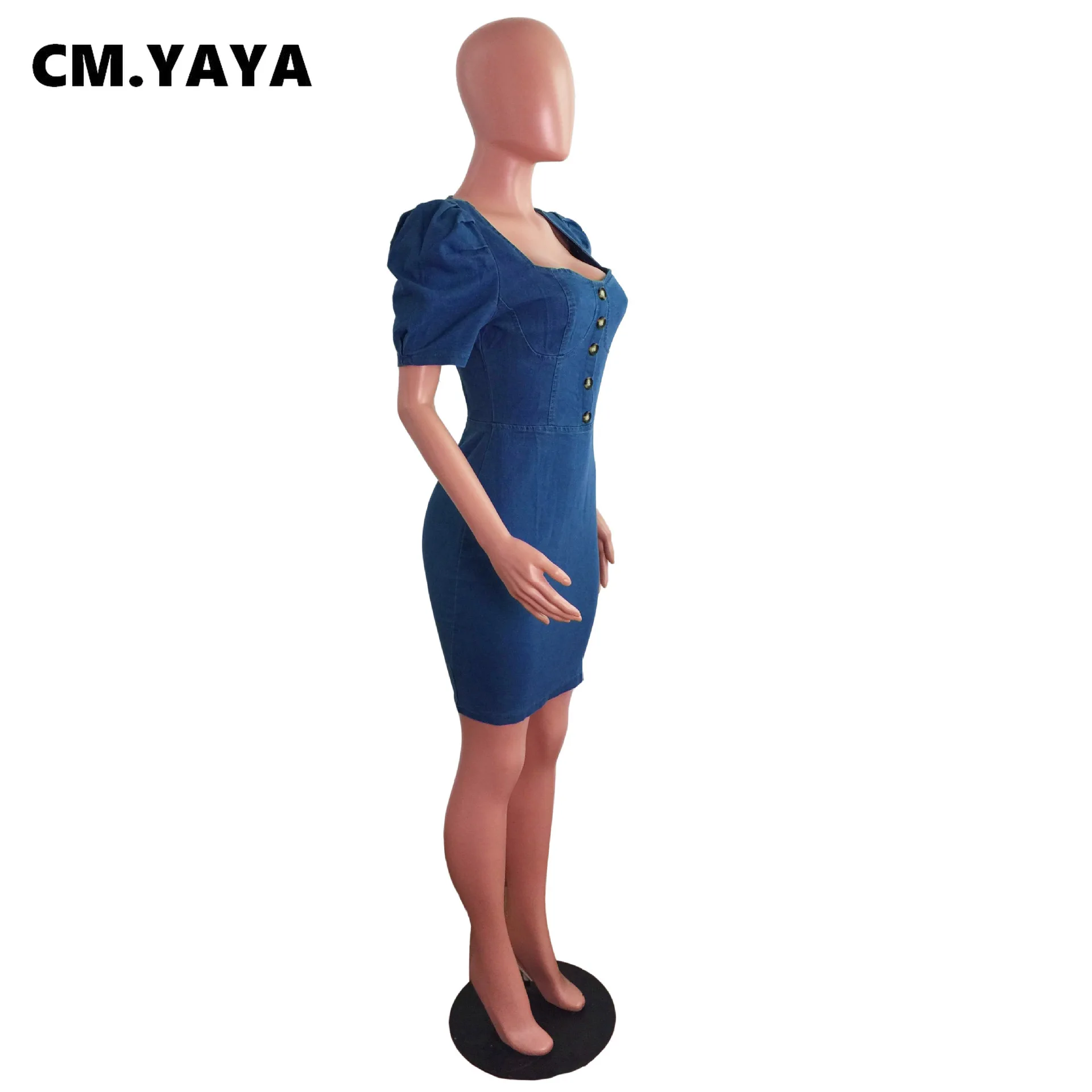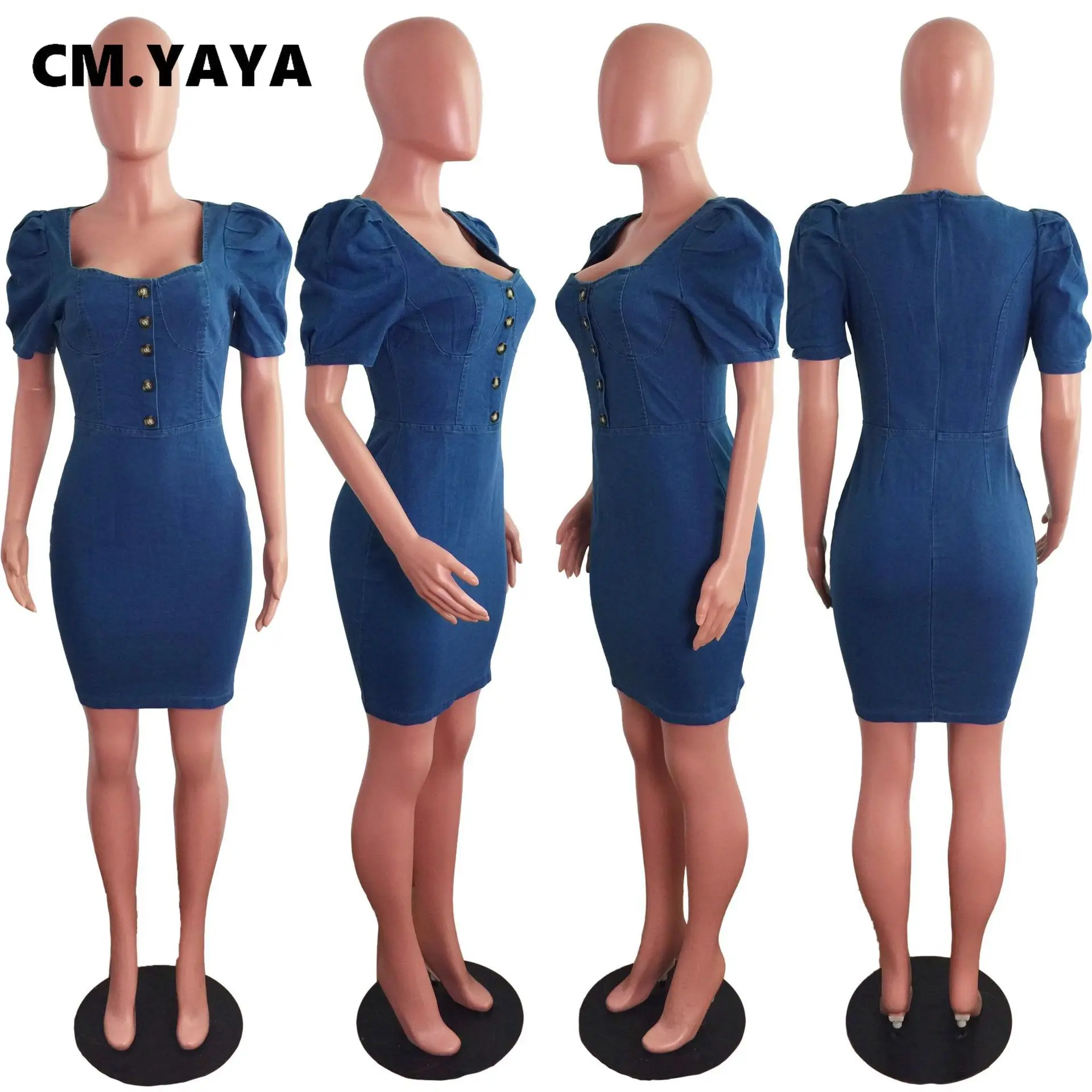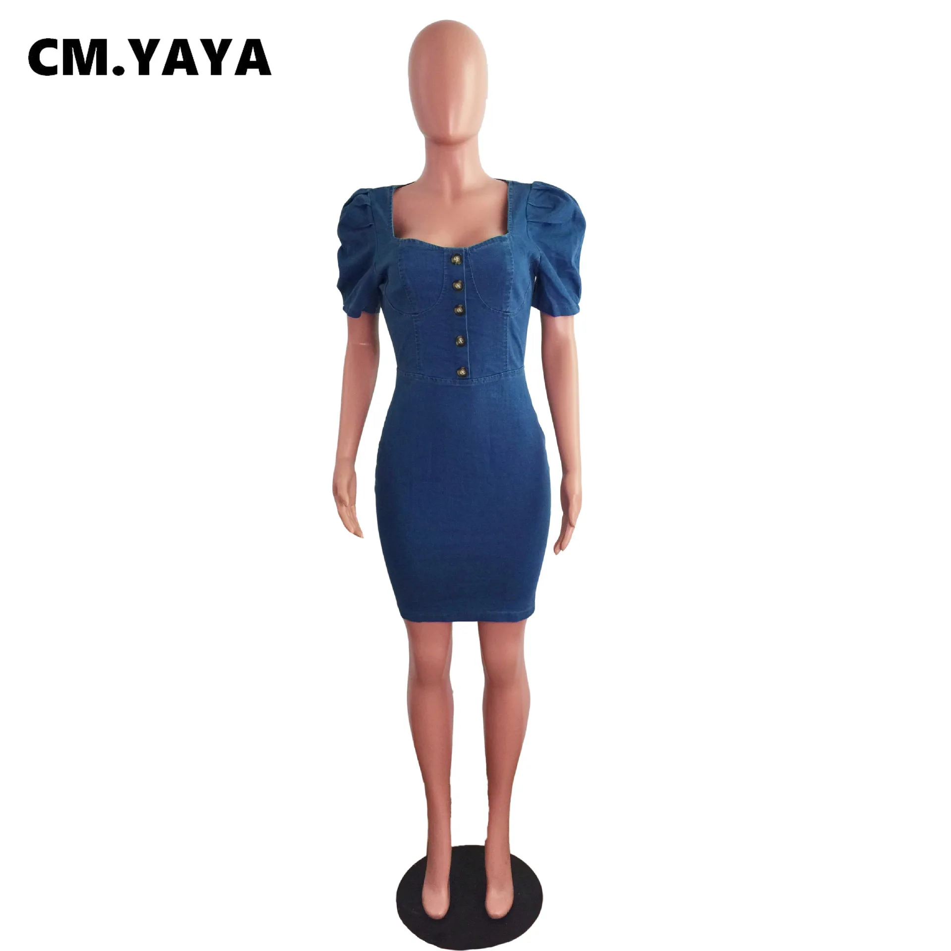 CM.YAYA Women Denim Dress Solid Short Puff Sleeve Square Collar Single Breasted Bodycon Mini Dresses Fashion Vestidos Summer
