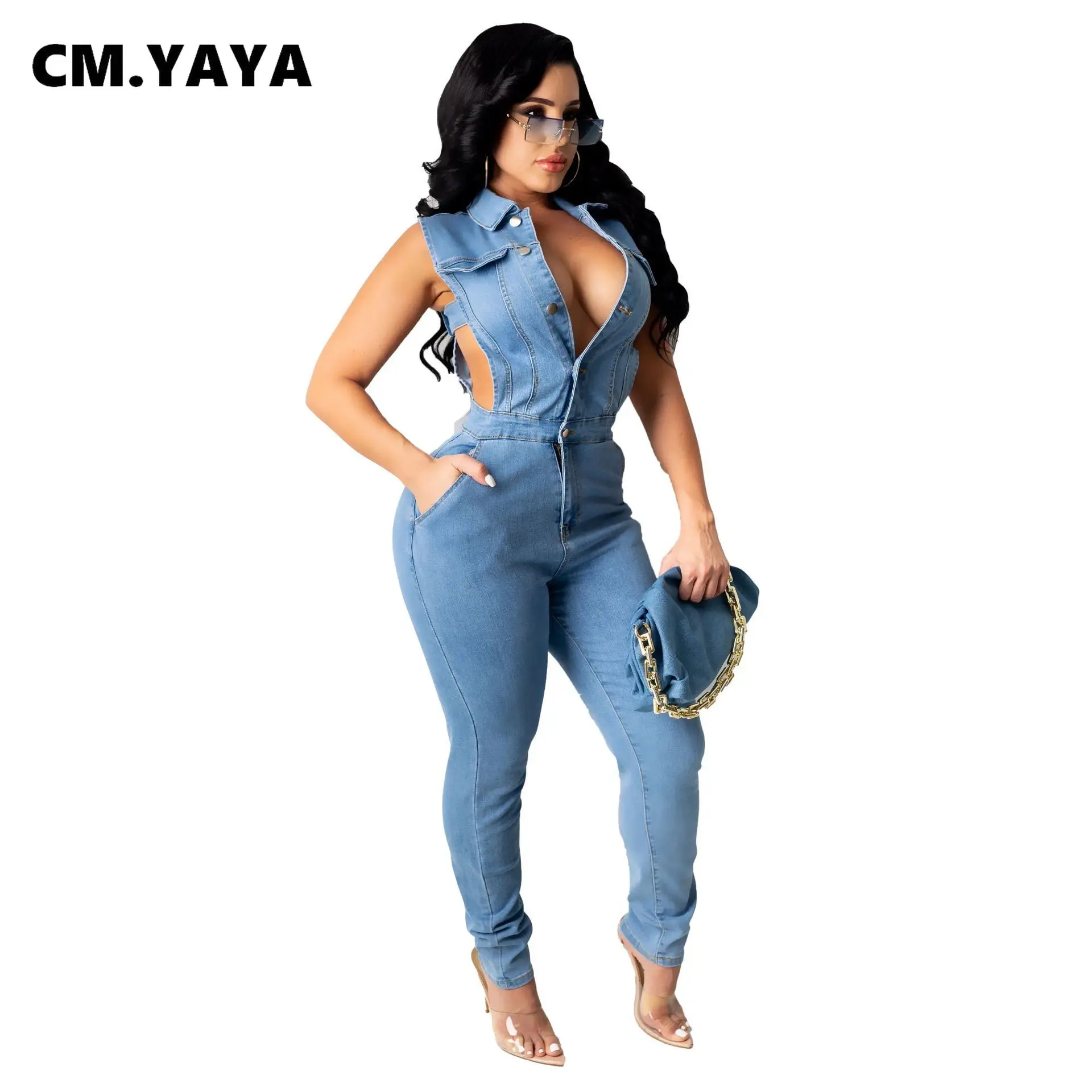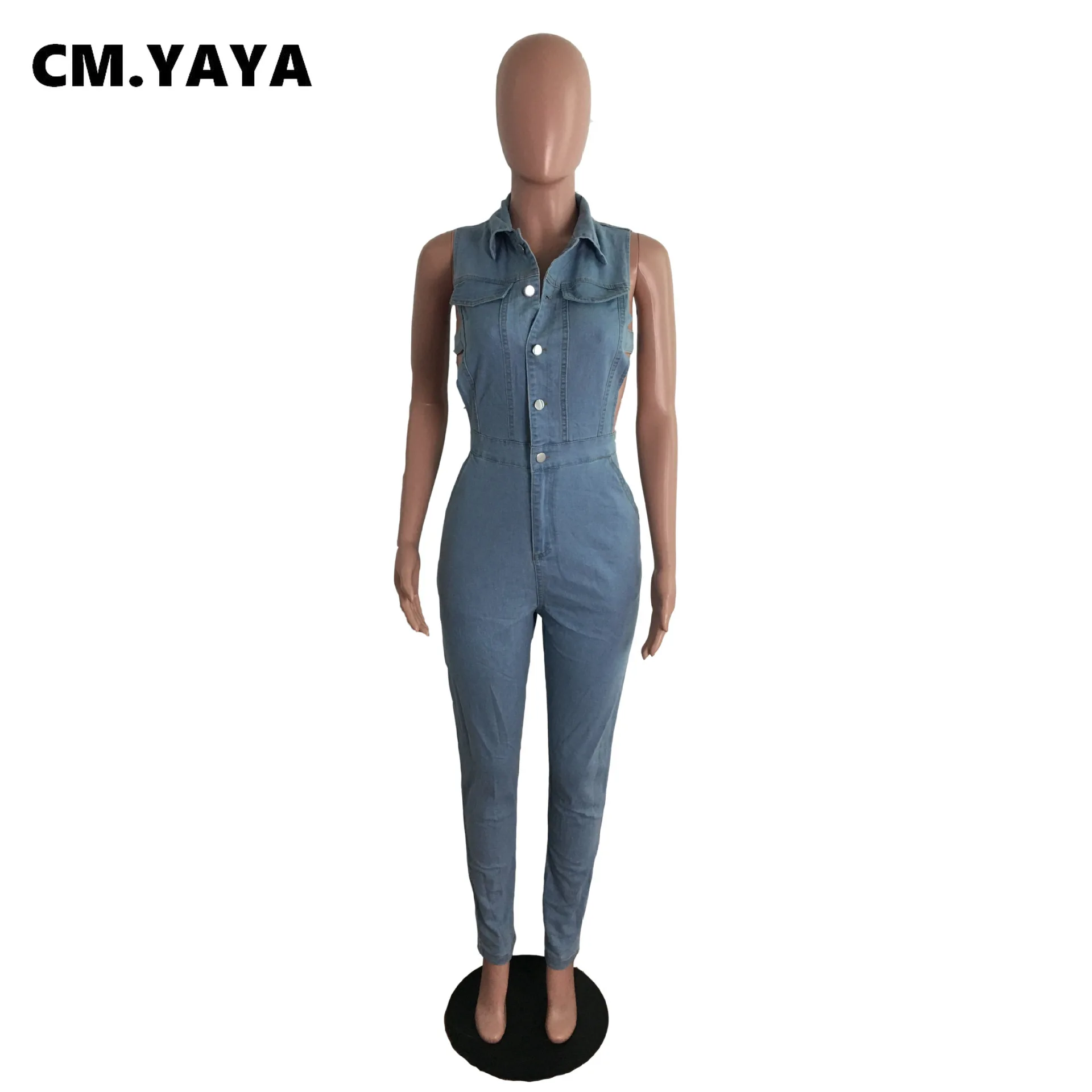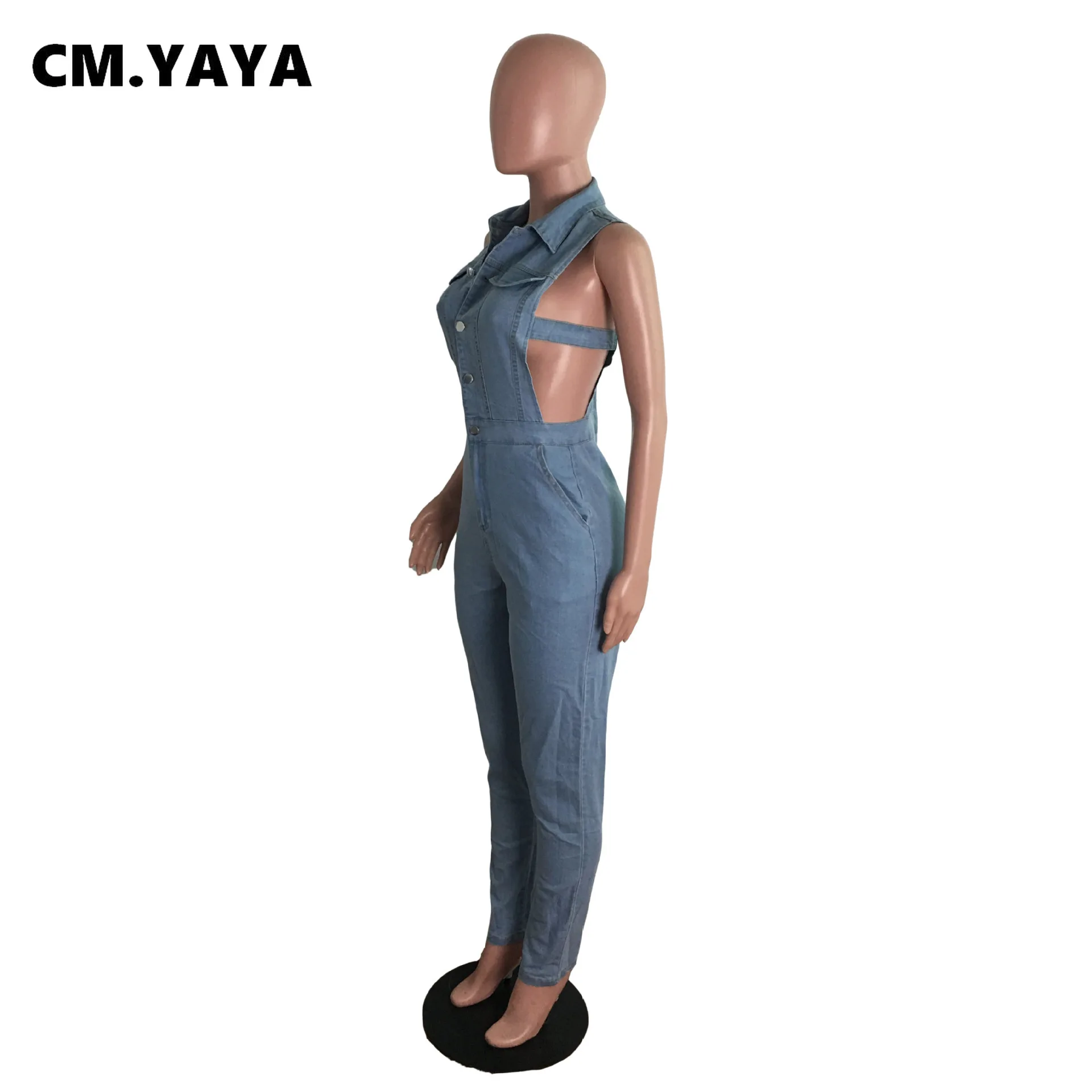 CM.YAYA Women Denim Jumpsuit Hollow Out Sleeveless Turn-down Collar Single Breasted Stretchy Jumpsuits Fashion Outfit Summer