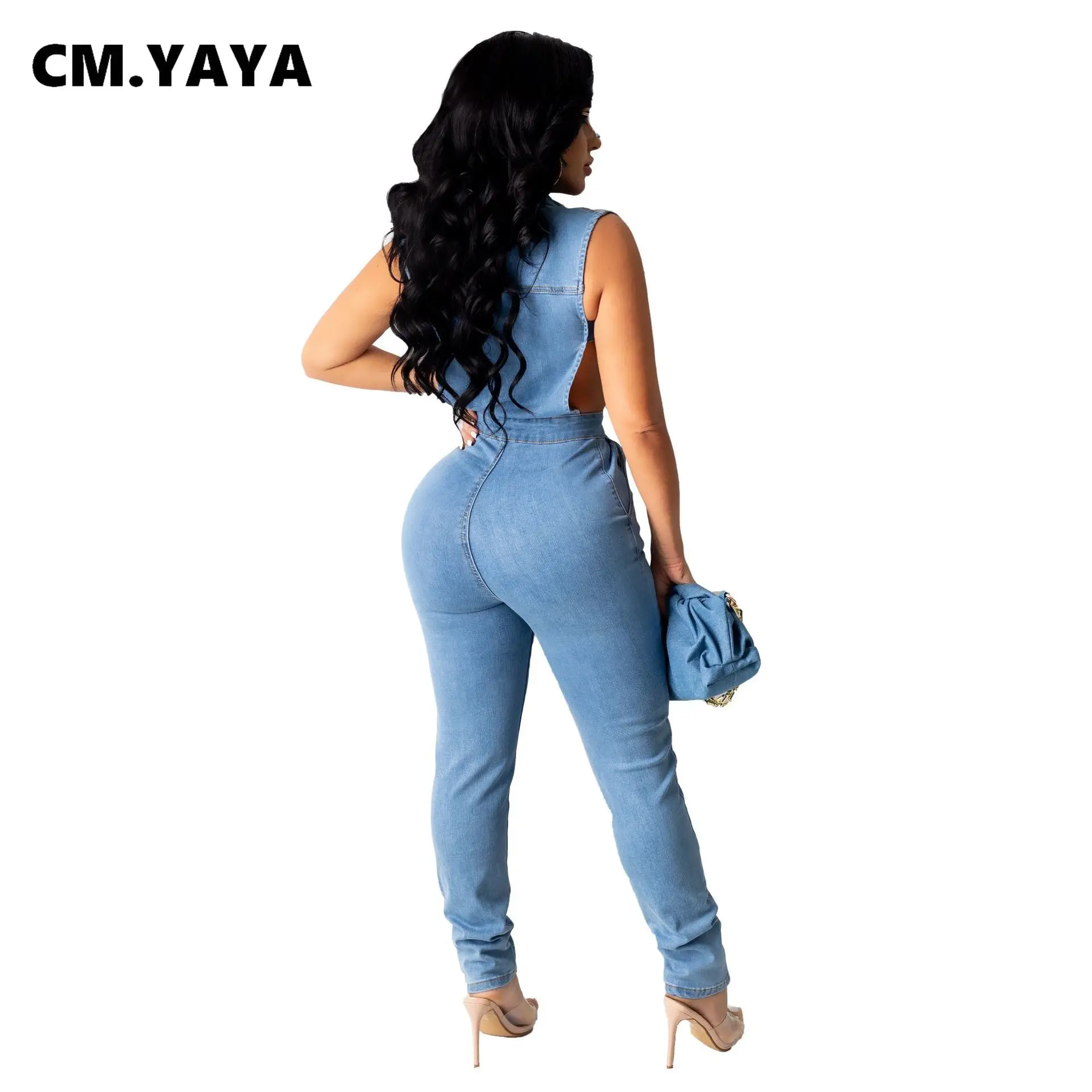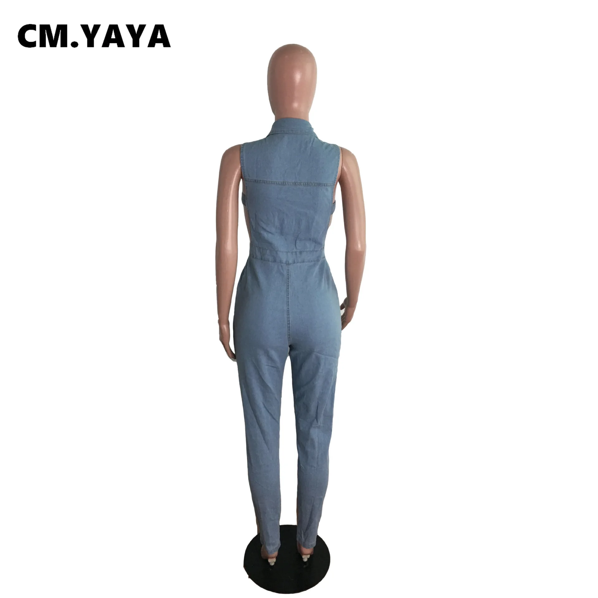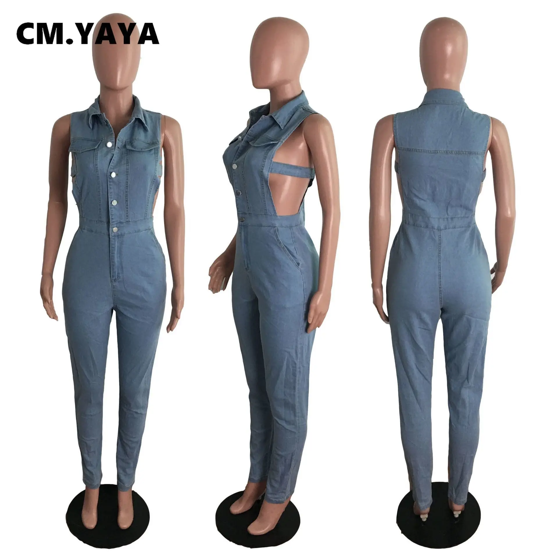 CM.YAYA Women Denim Jumpsuit Hollow Out Sleeveless Turn-down Collar Single Breasted Stretchy Jumpsuits Fashion Outfit Summer