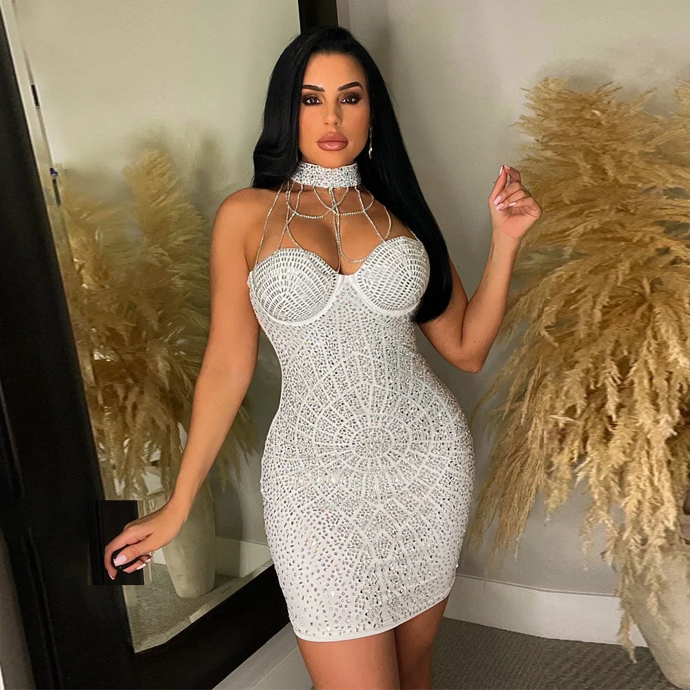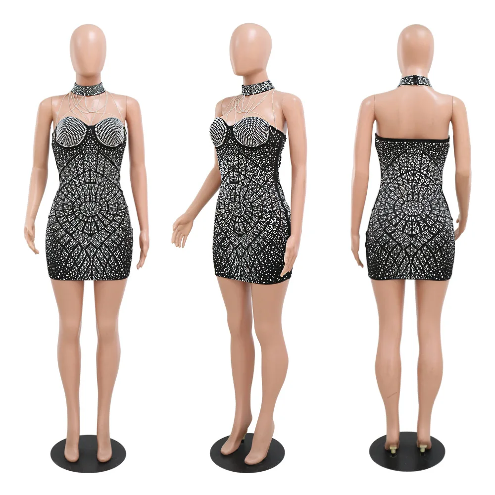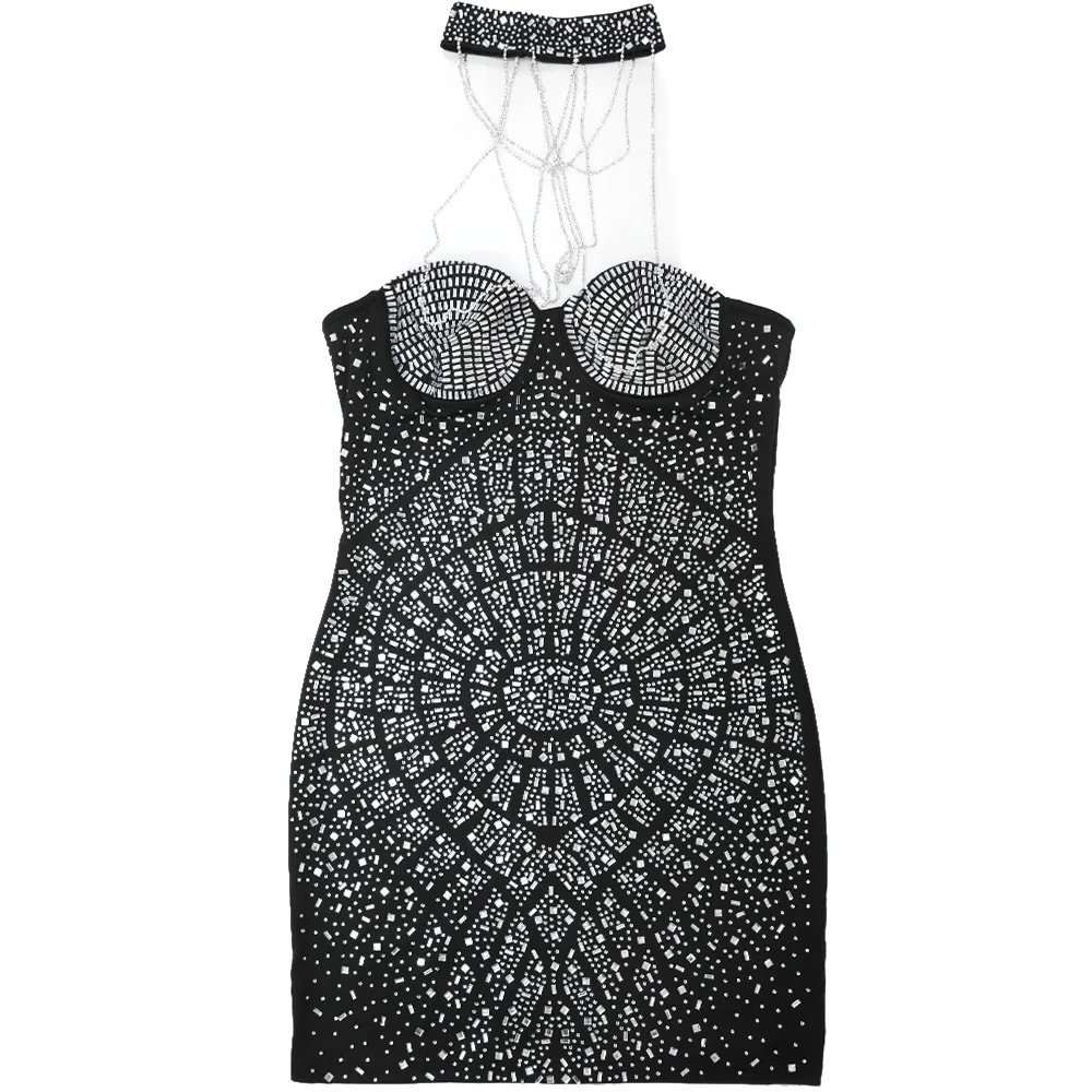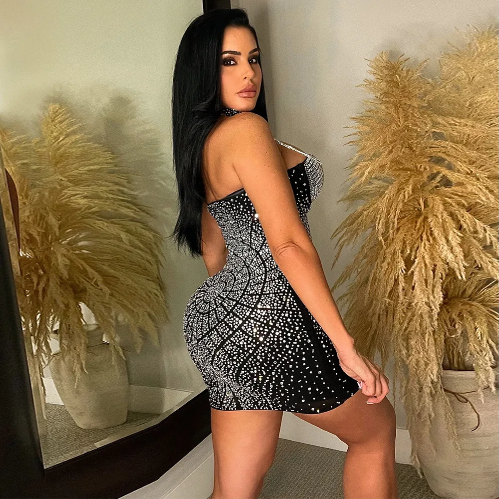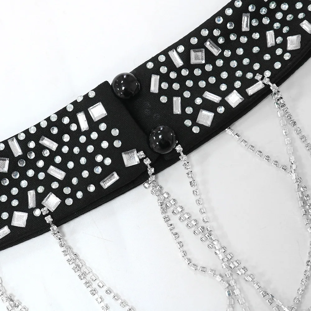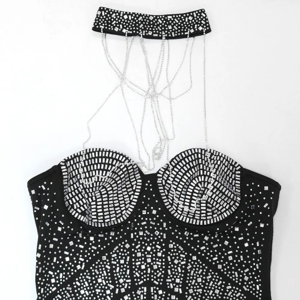 CM.YAYA Women Diamonds Hot Drill Black Hole Strapless with Tassel Scarf Bodycon Midi Dress Sexy Night Party Club Even Dresses