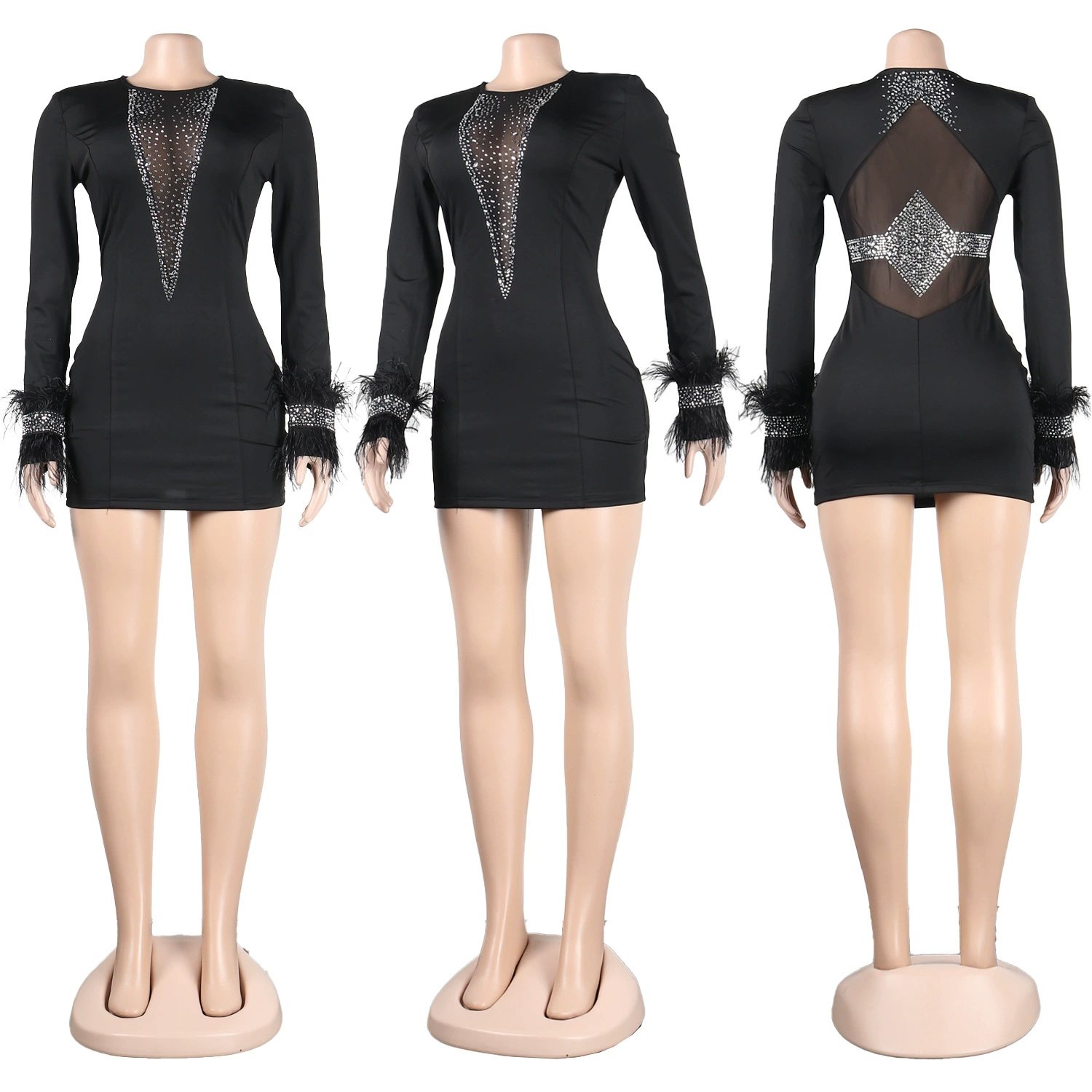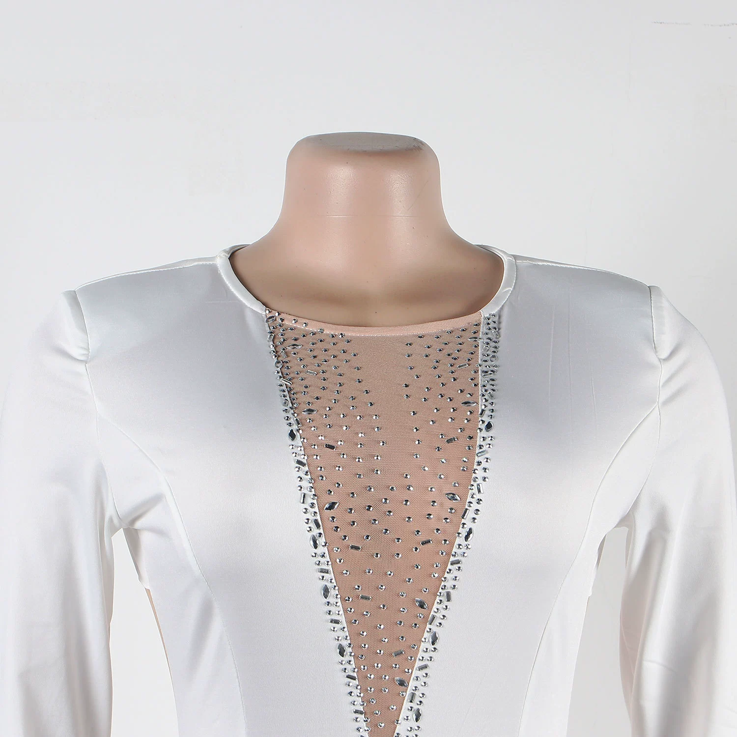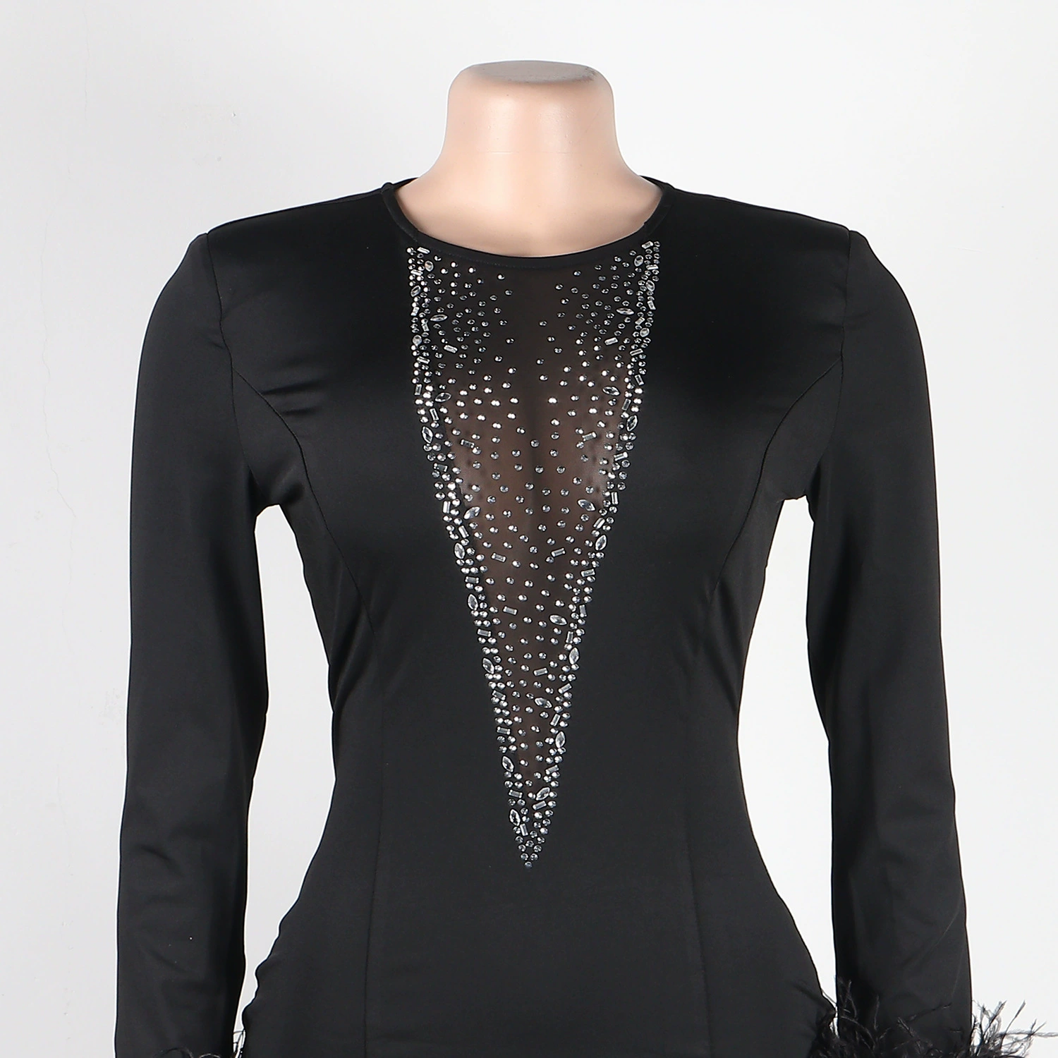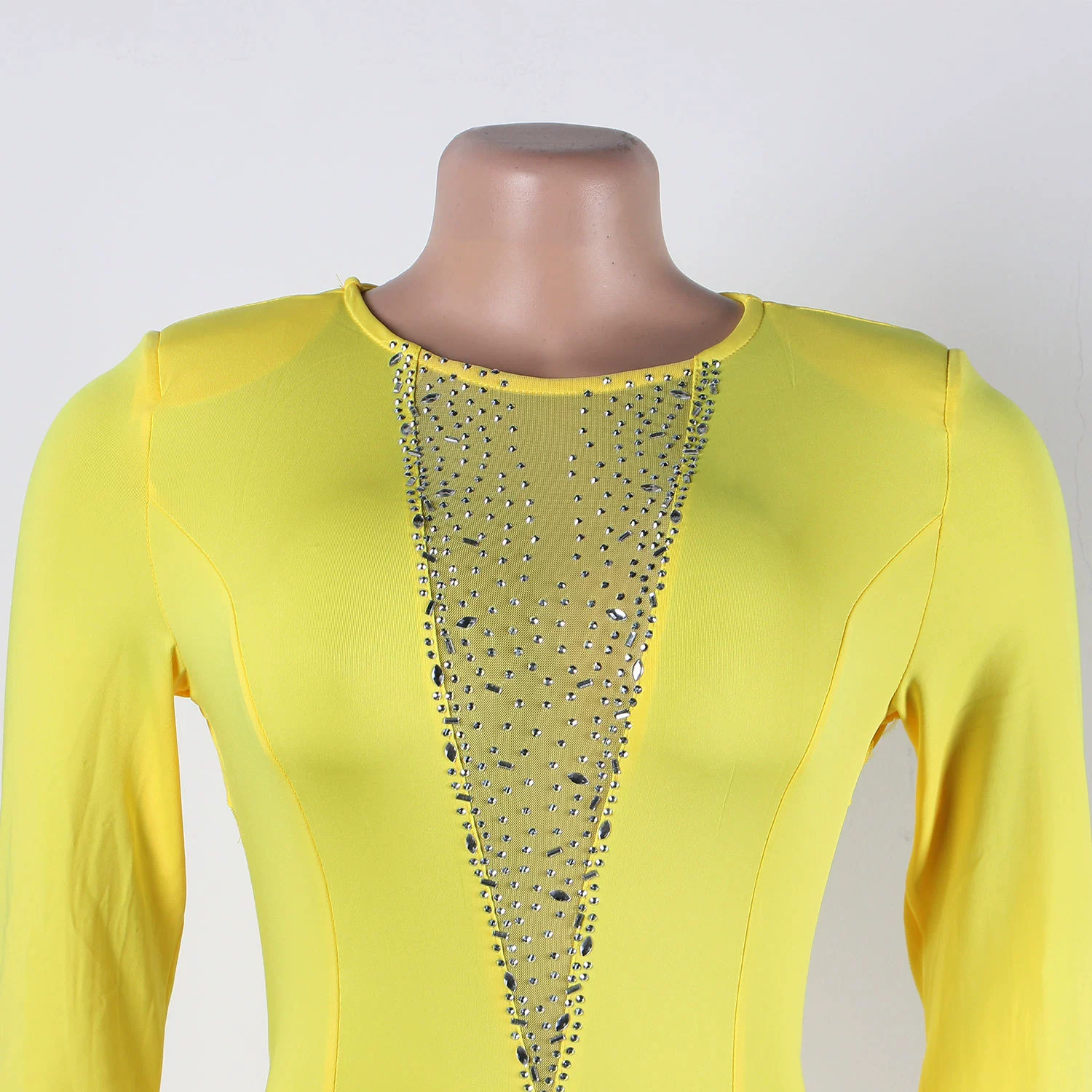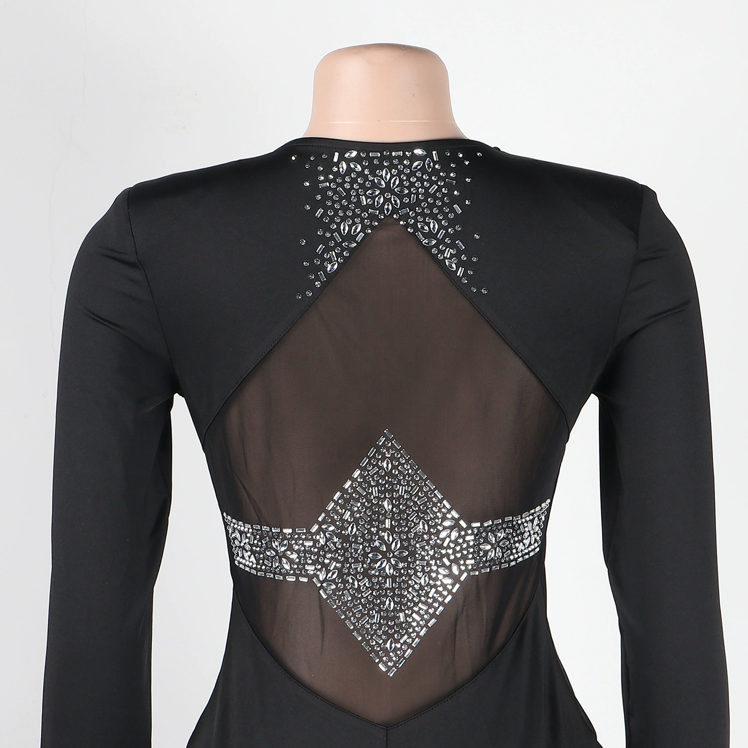 CM.YAYA Women Diamonds Hot Drill Mesh See Though Patchwork Long Sleeve Bodycon Midi Mini Dress Sexy Party Evening Prom Dresses