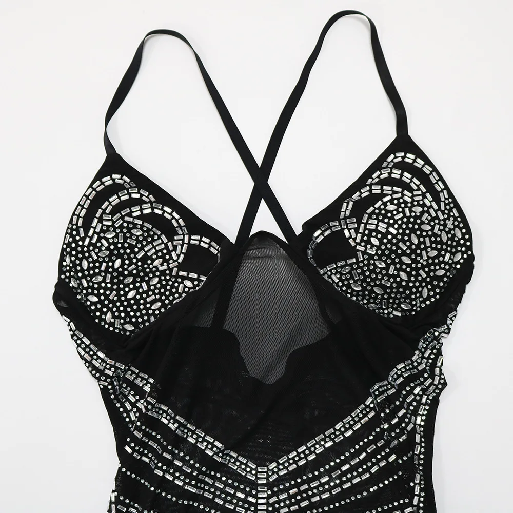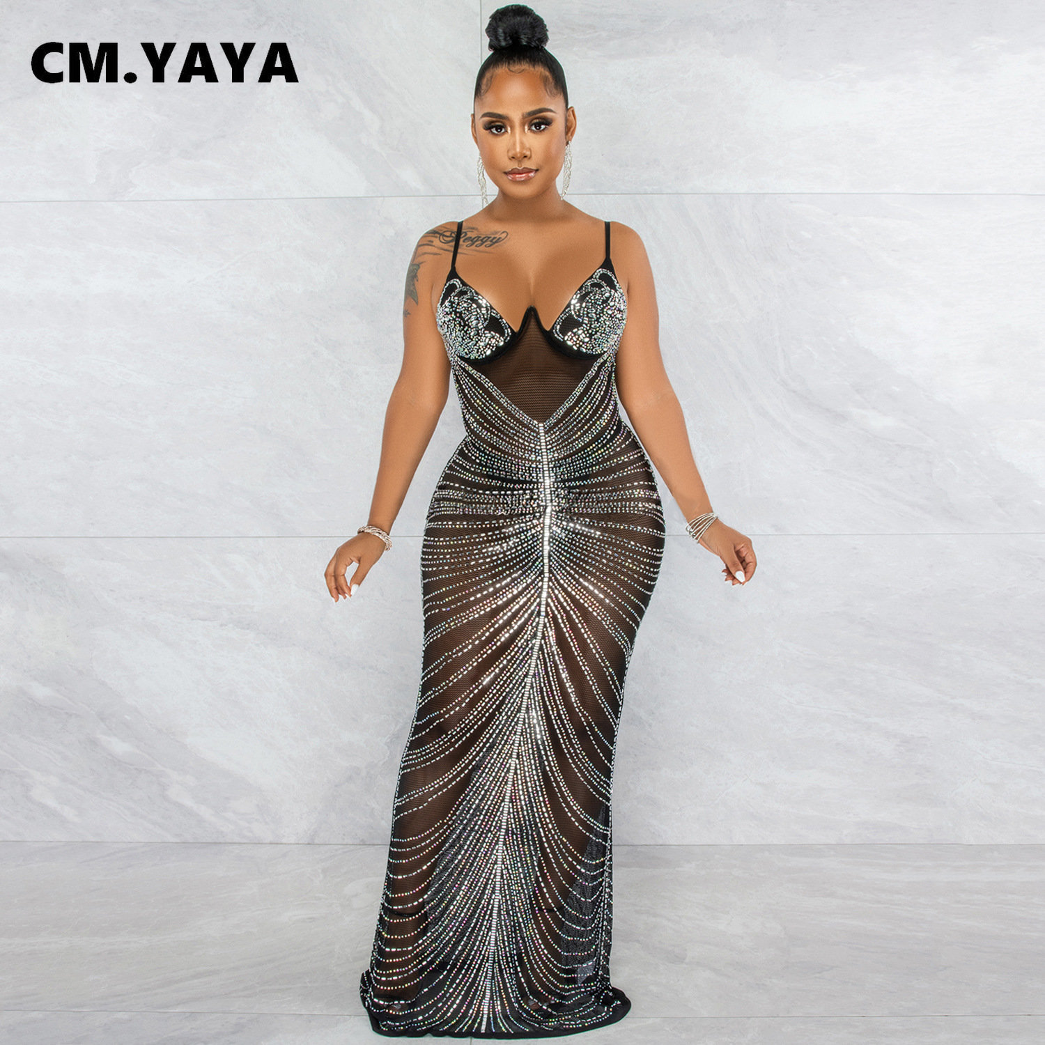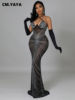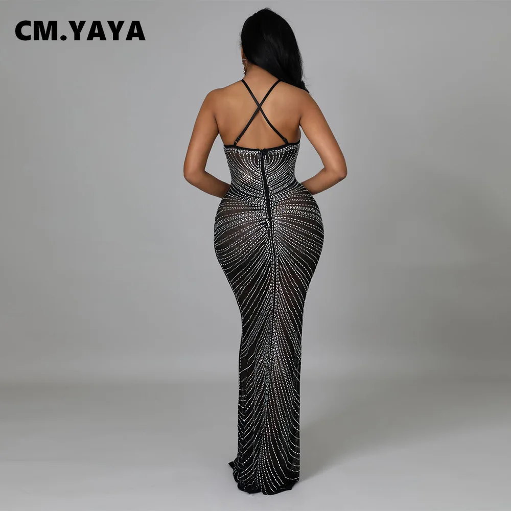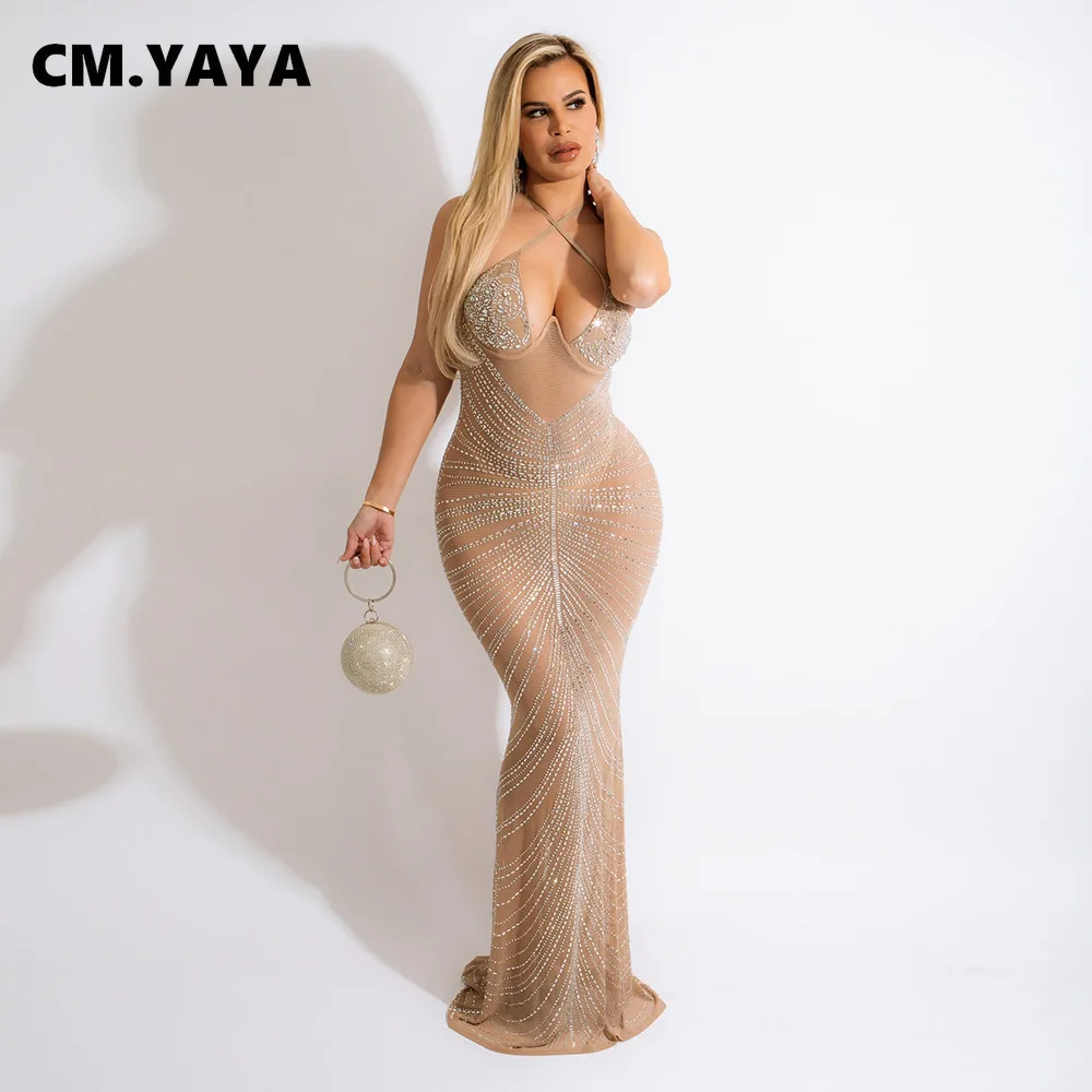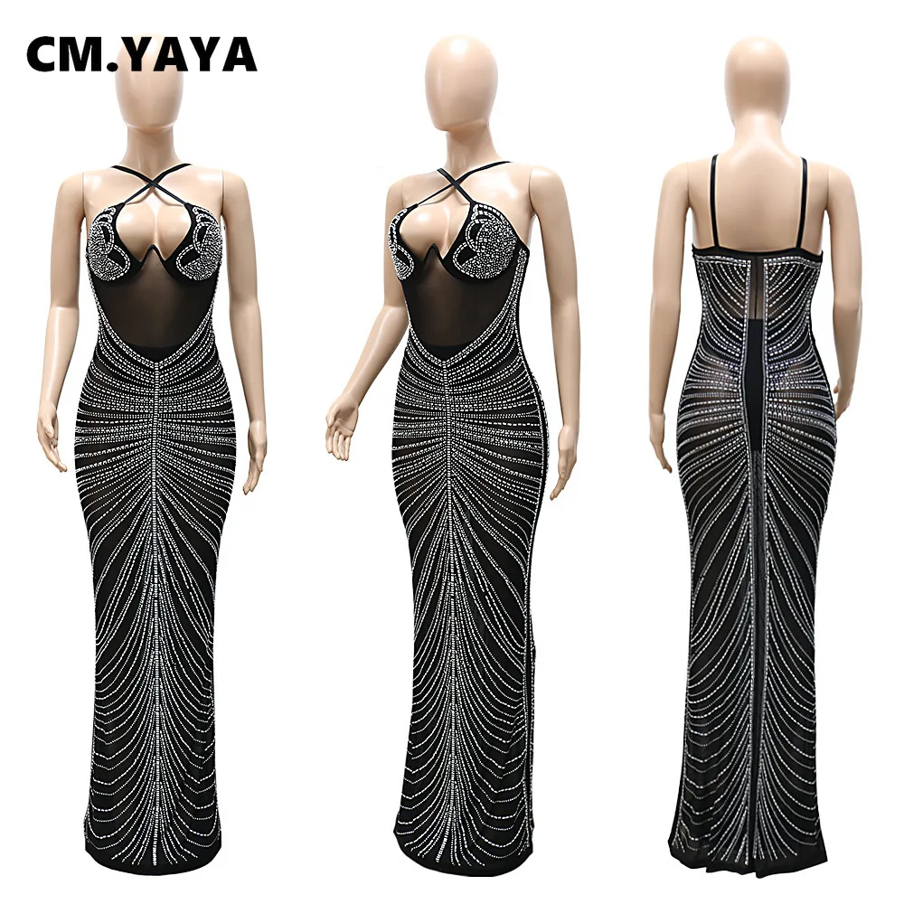 CM.YAYA Women Diamonds Hot Drill Sleeveless Halter Neck Sleeveless Mesh See Though Midi Maxi Dress Sexy Night Party Long Dresses