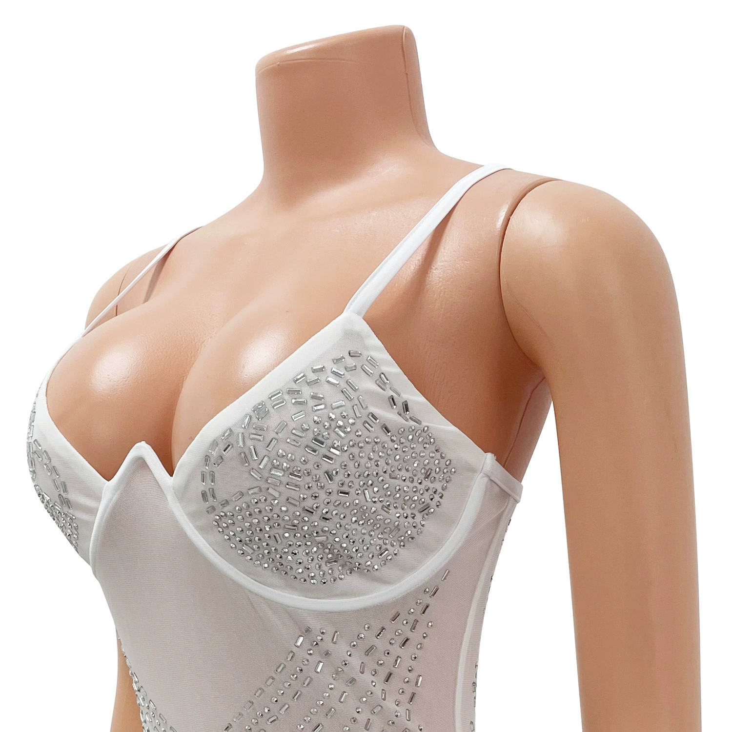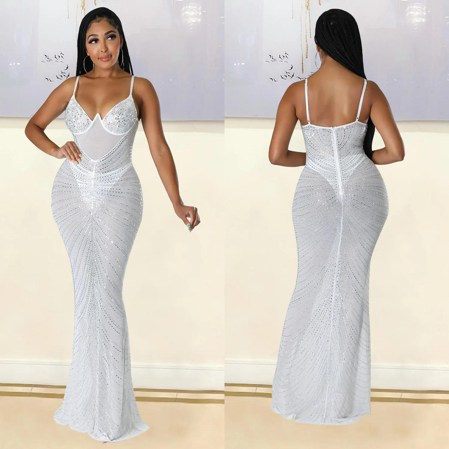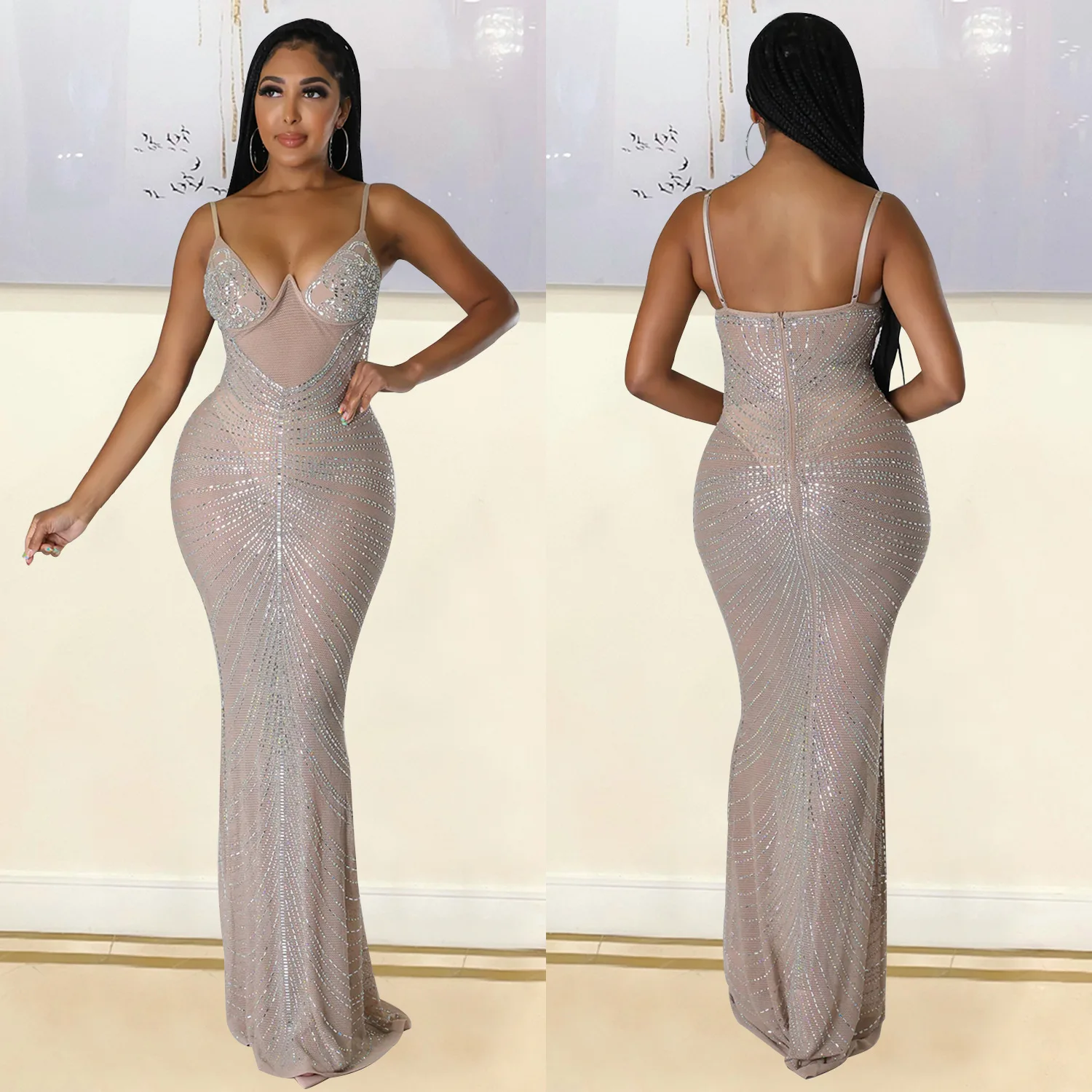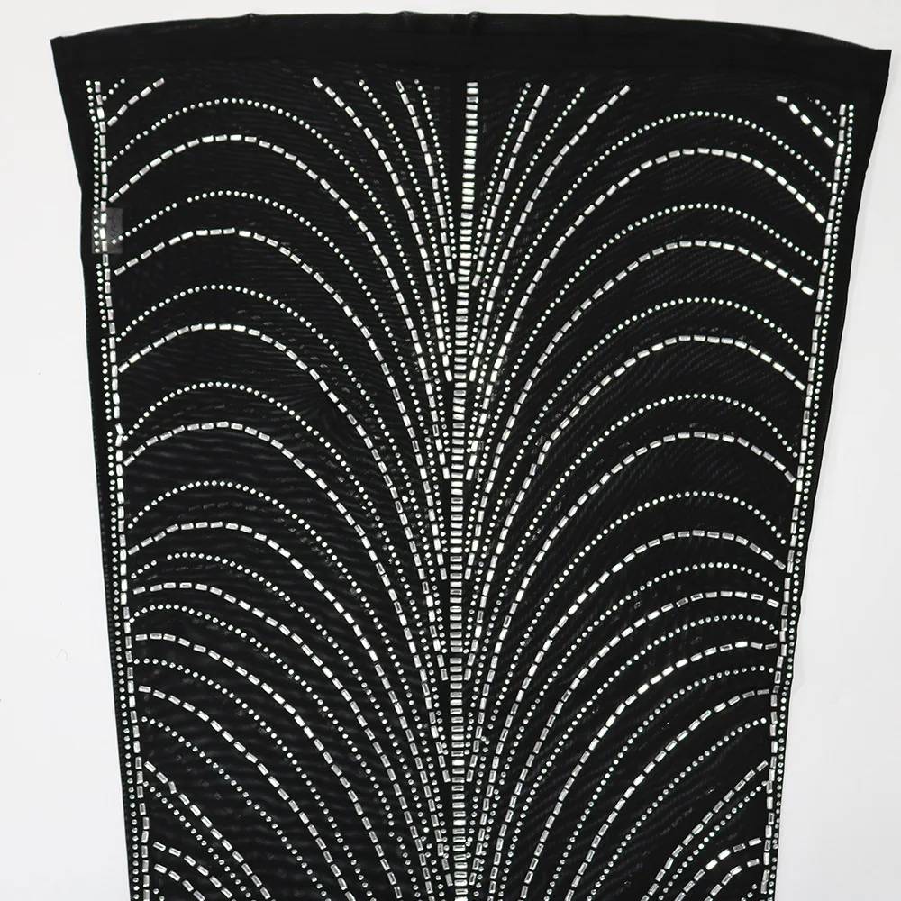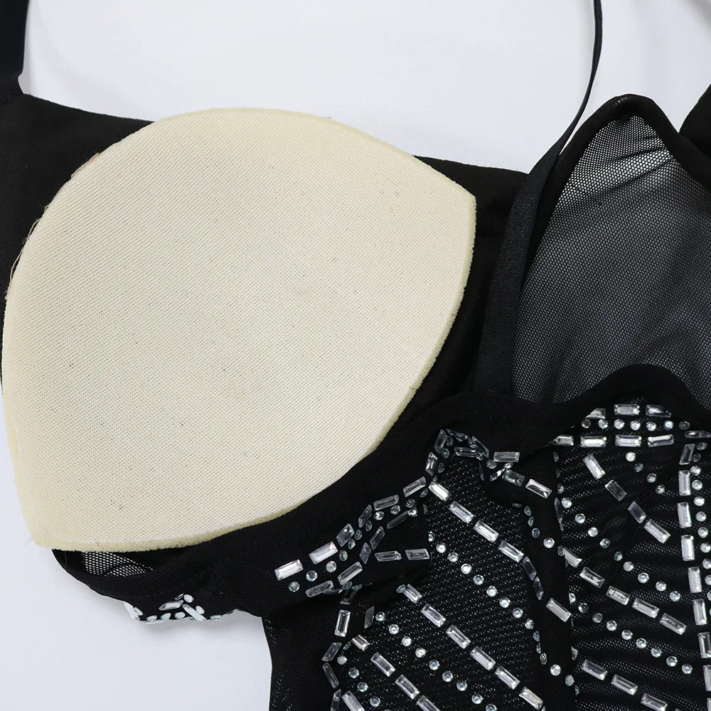 CM.YAYA Women Diamonds Hot Drill Sleeveless Halter Neck Sleeveless Mesh See Though Midi Maxi Dress Sexy Night Party Long Dresses