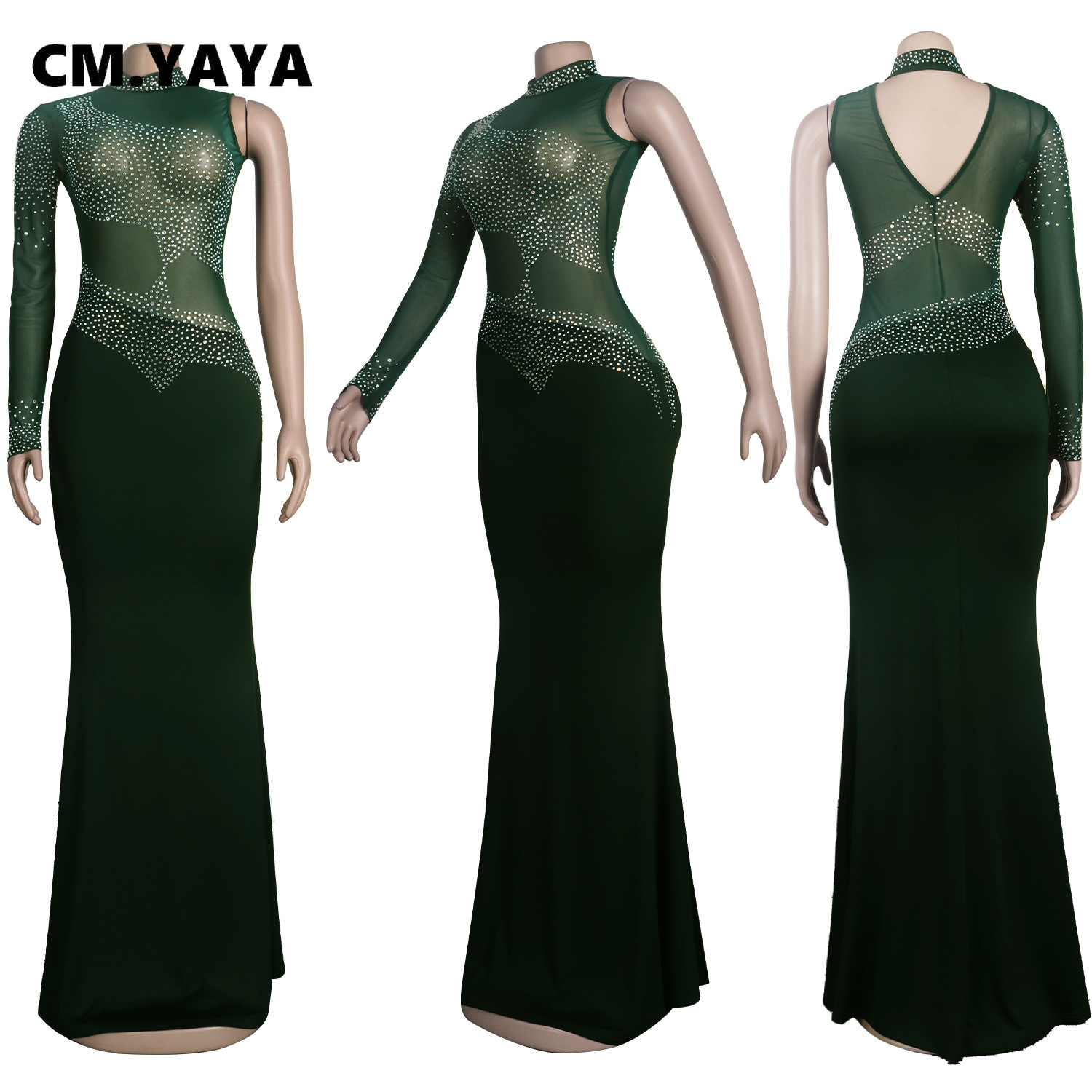 CM.YAYA Women Diamonds Hot Rhinestones Bodycon Midi Maxi Mermaid Dress Elegant Sexy Party Club One Long Sleeve Long Dresses