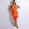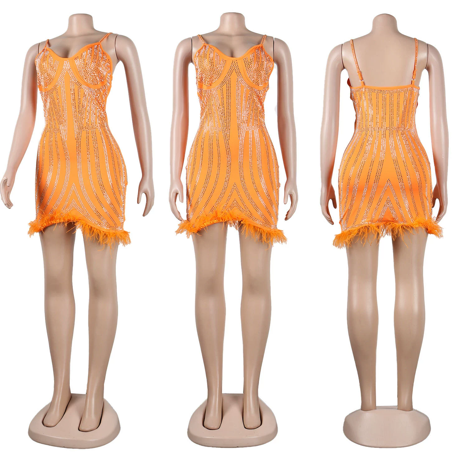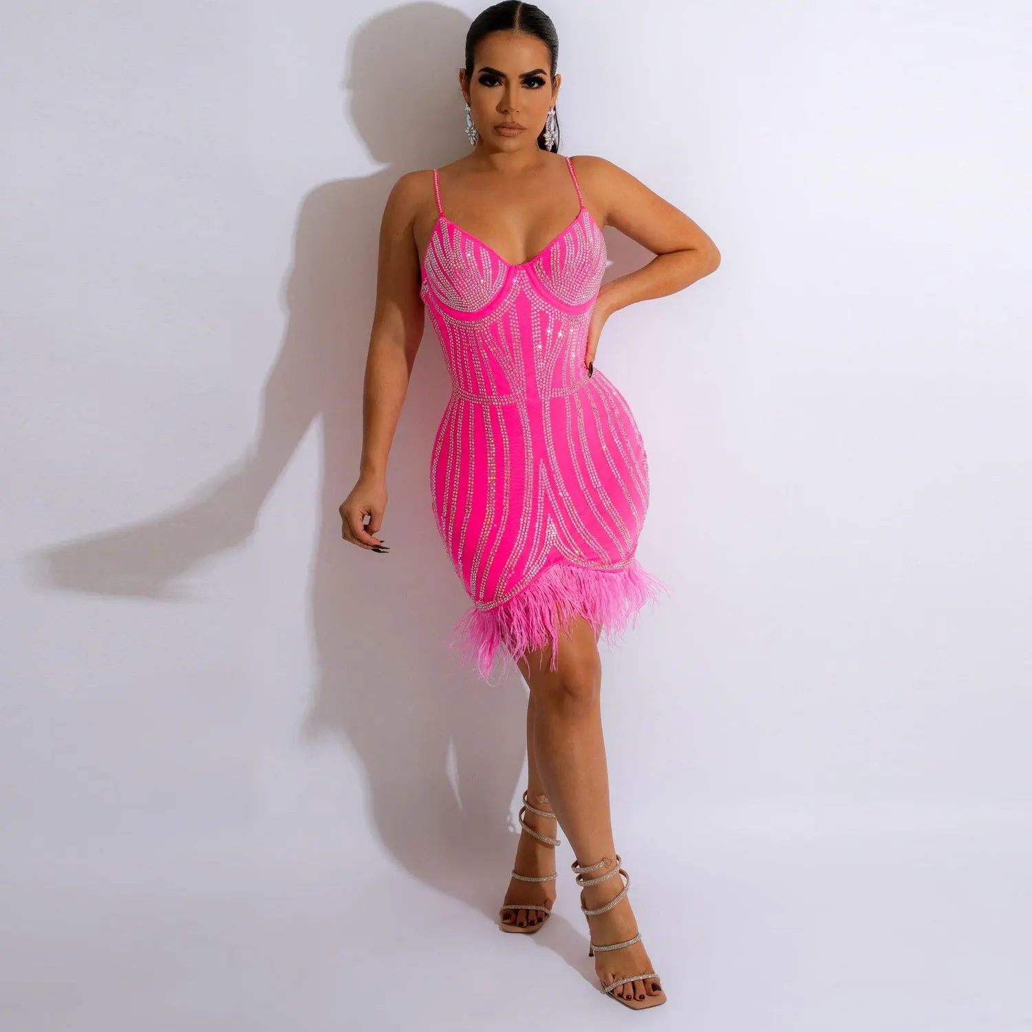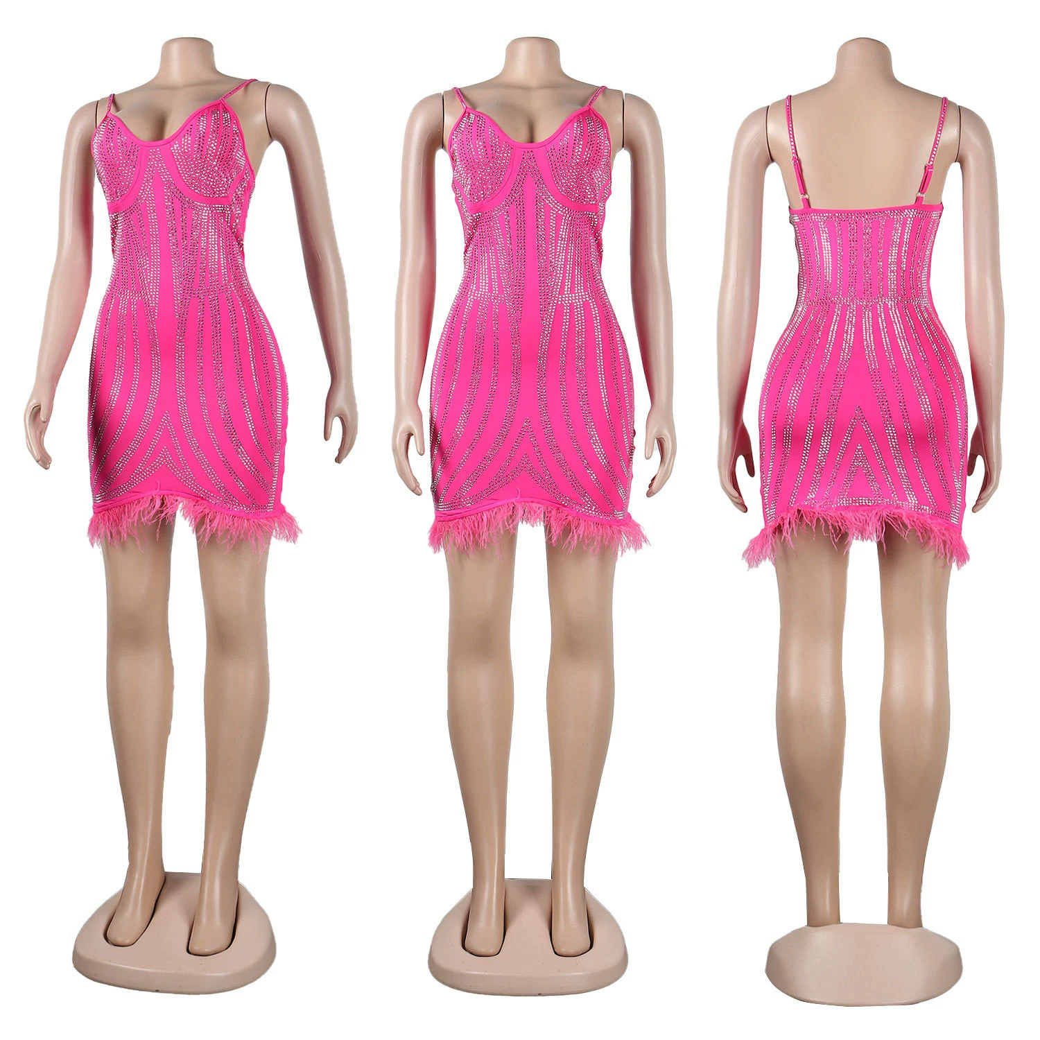 CM.YAYA Women Diamonds Hot Rhinestones Feather Tassel Hem Spaghetti Strap INS Bodycon Midi Sexy Party Club Prom Vestidos Dresses
