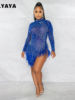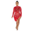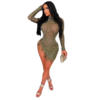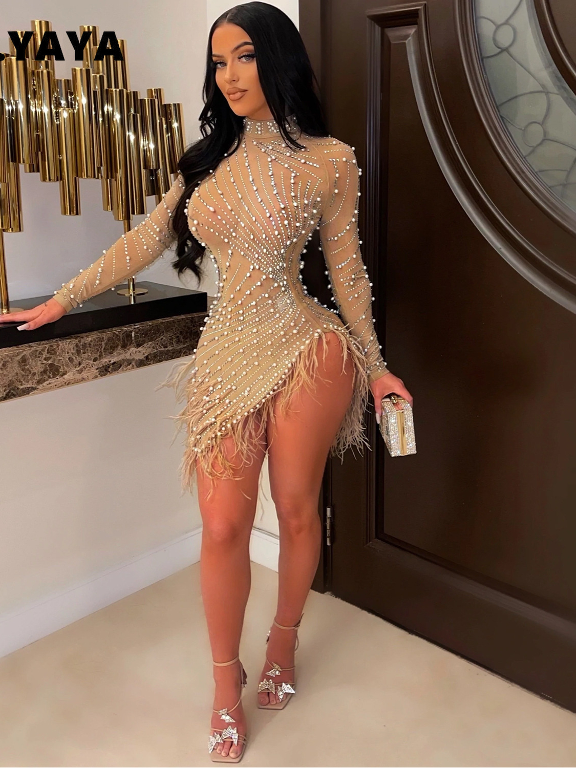 CM.YAYA Women Diamonds Hot Rhinestones Fur Hem Asymmetrical Long Sleeve Midi Dress Sexy Party Clubwear Night Bodycon Dresses
