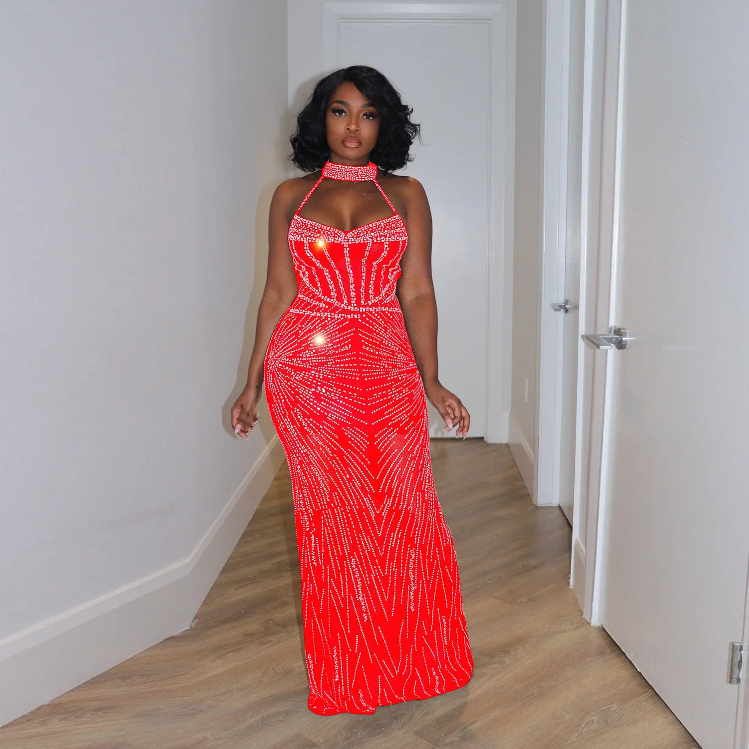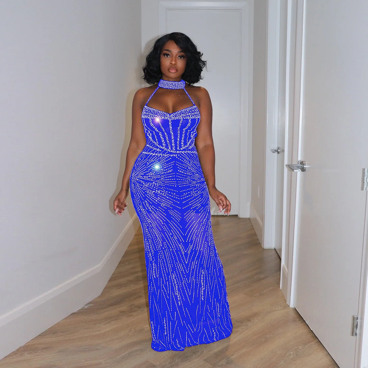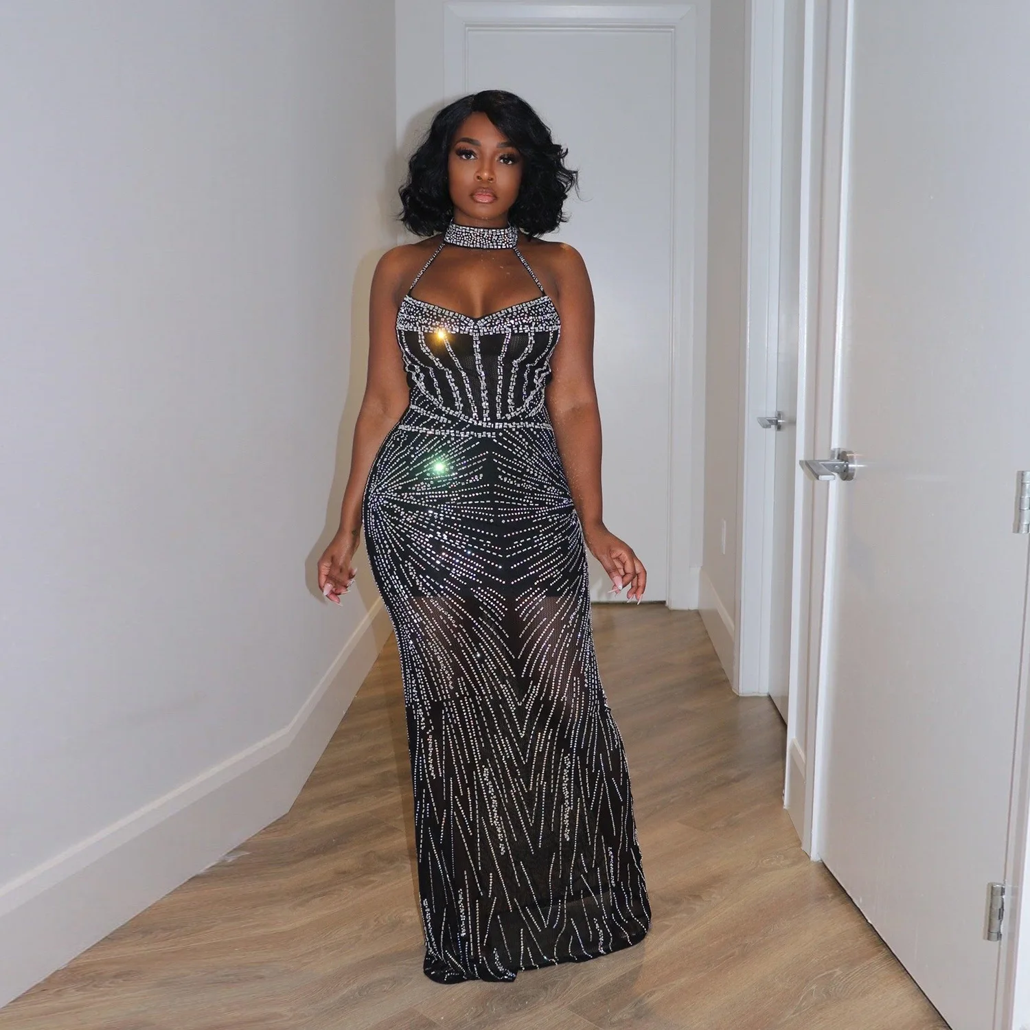 CM.YAYA Women Diamonds Hot Rhinestones Mesh See Though Halter Neck Floor Length Maxi Long Bodycon Midi Sexy Party Club Dresses
