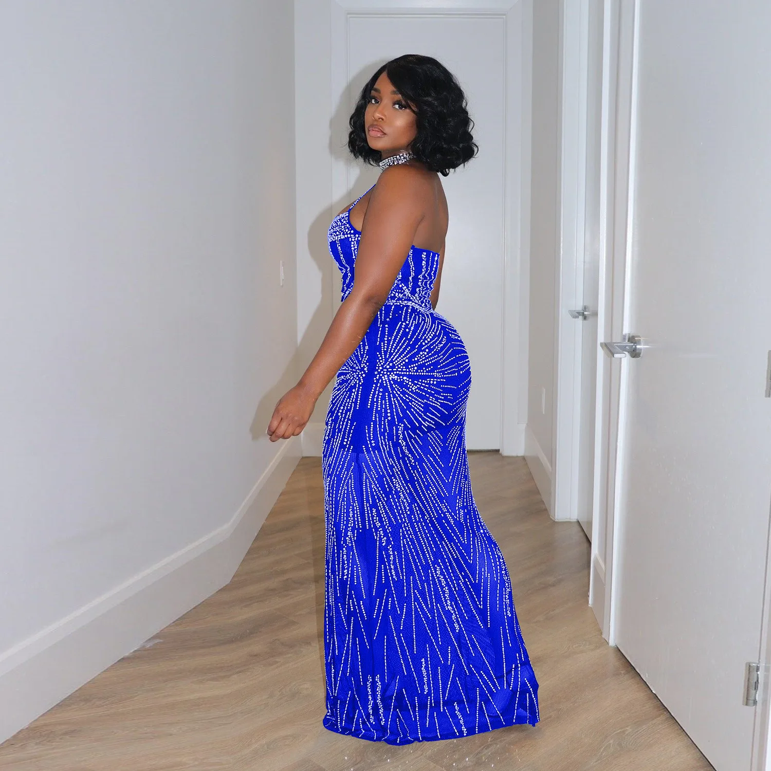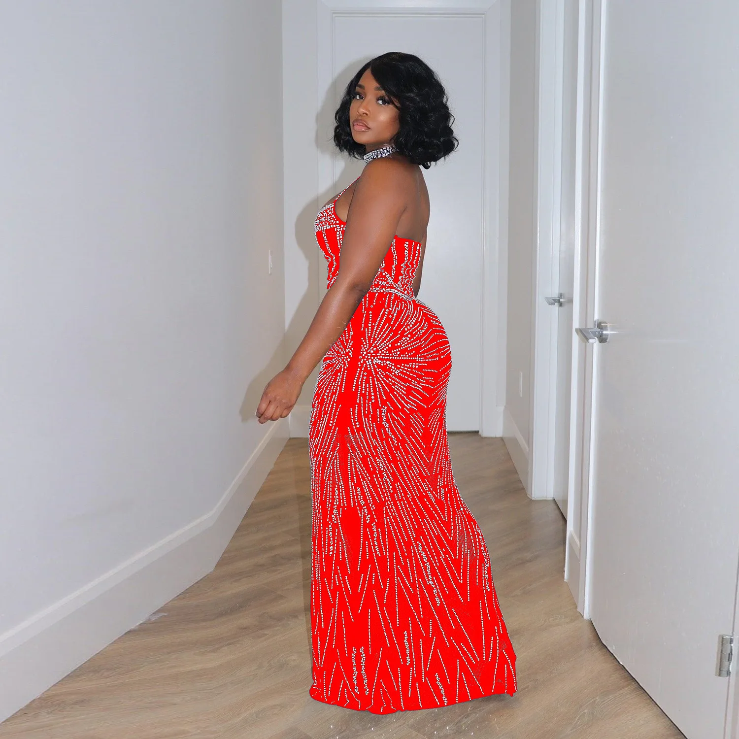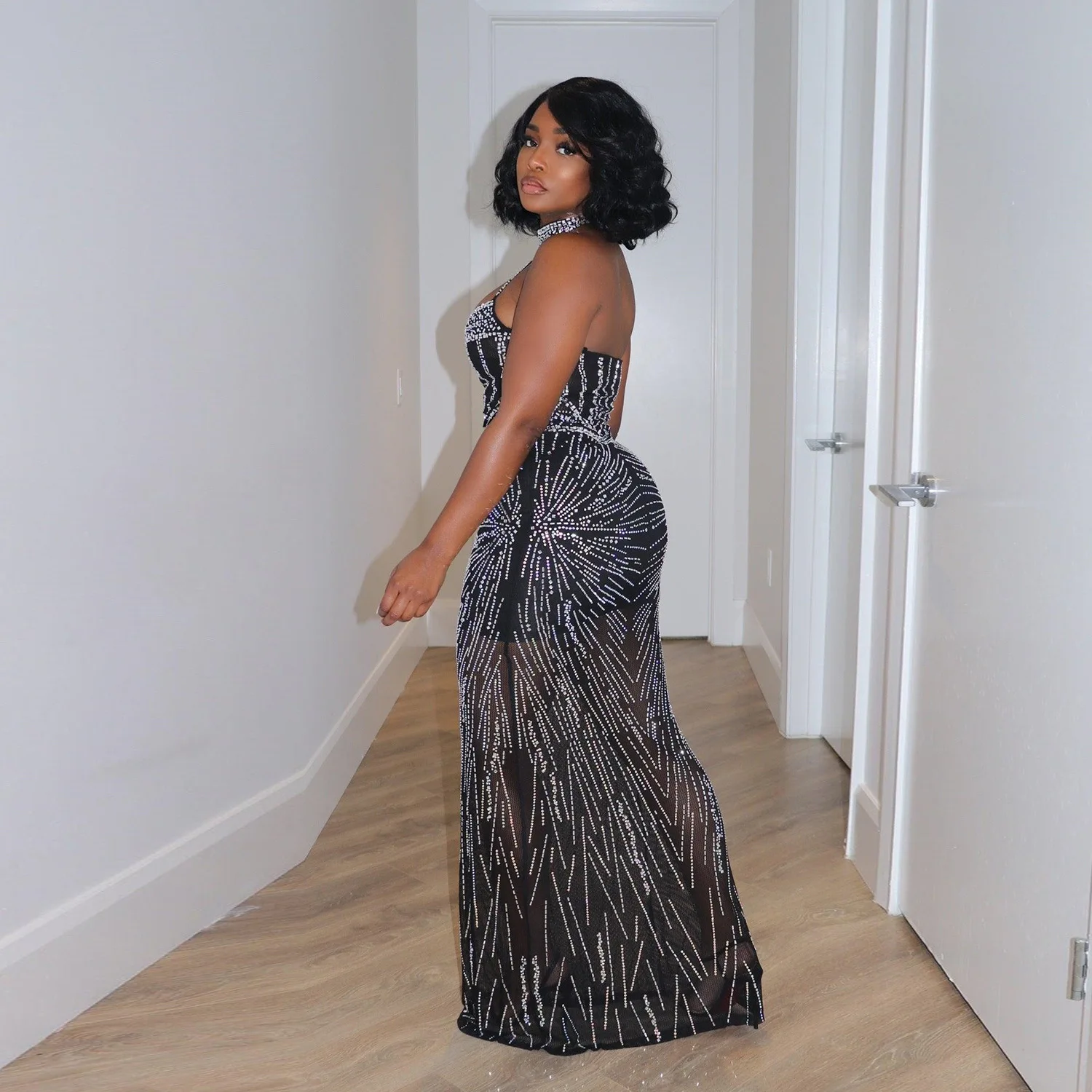 CM.YAYA Women Diamonds Hot Rhinestones Mesh See Though Halter Neck Floor Length Maxi Long Bodycon Midi Sexy Party Club Dresses