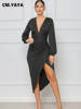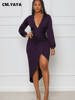 CM.YAYA Women Elegant Wraped V-neck Corset High Waist Ruched Up High Side Split Bodycon Asymmetrical Dresses Winter Autumn Dress