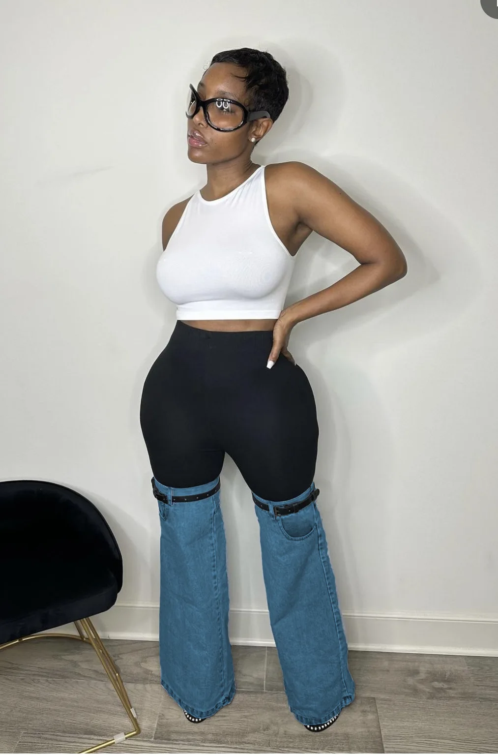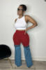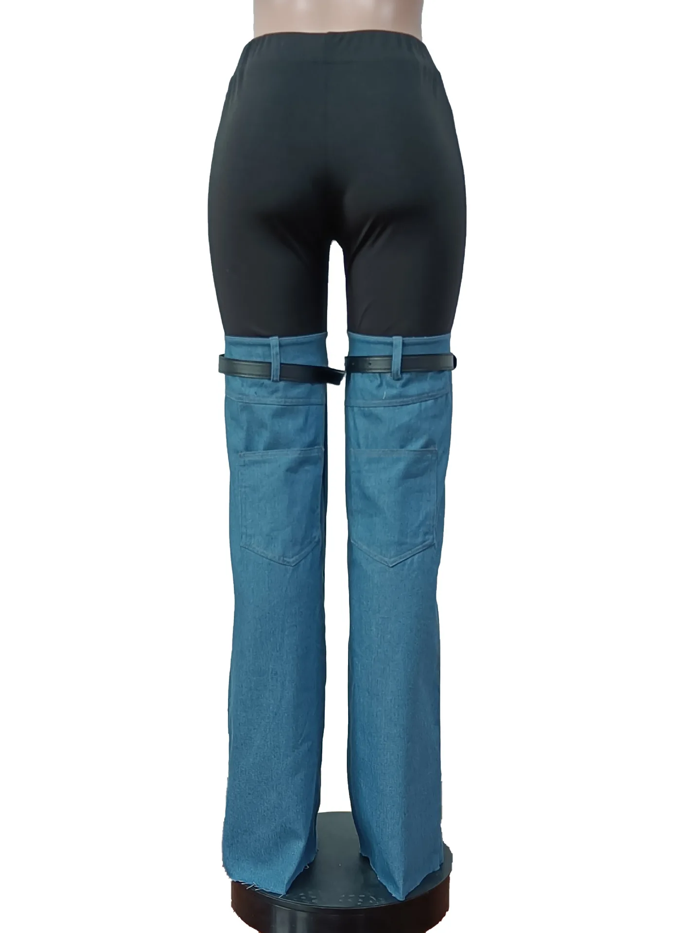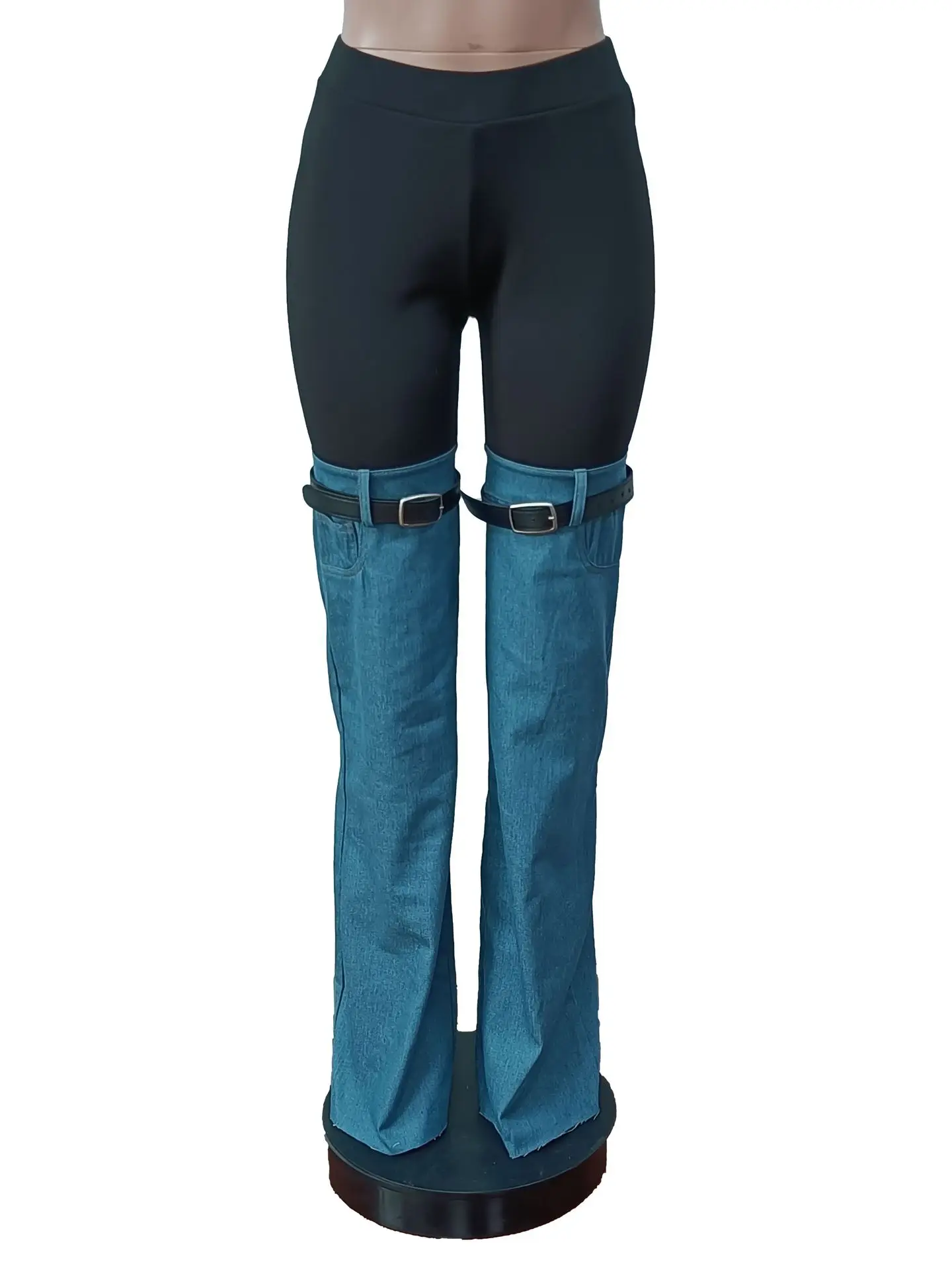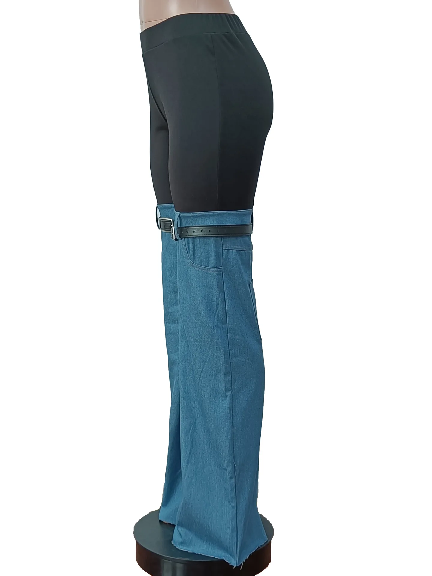 CM.YAYA Women Fashion Knee with Belt Denim Straight Pants 2023 Streetwear INS Vintage Patchwork Wide Leg Jeans Trousers