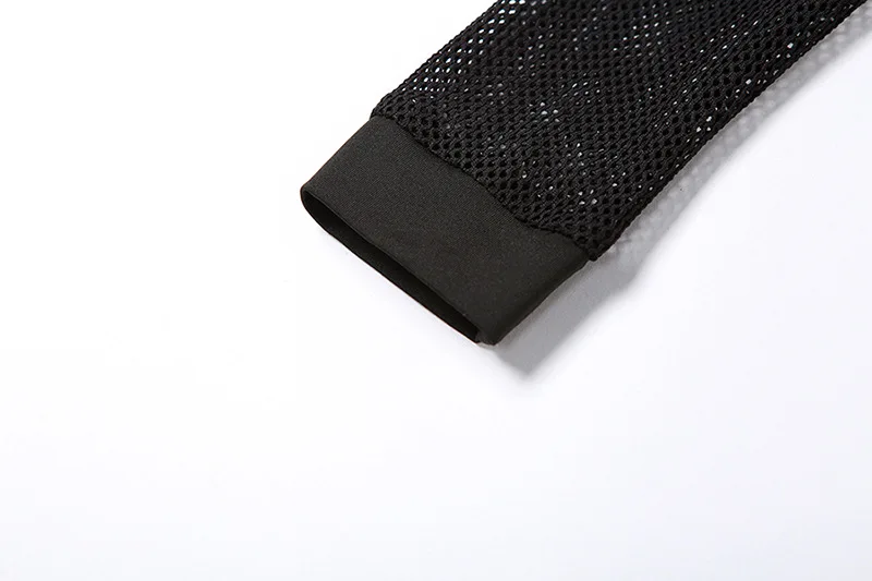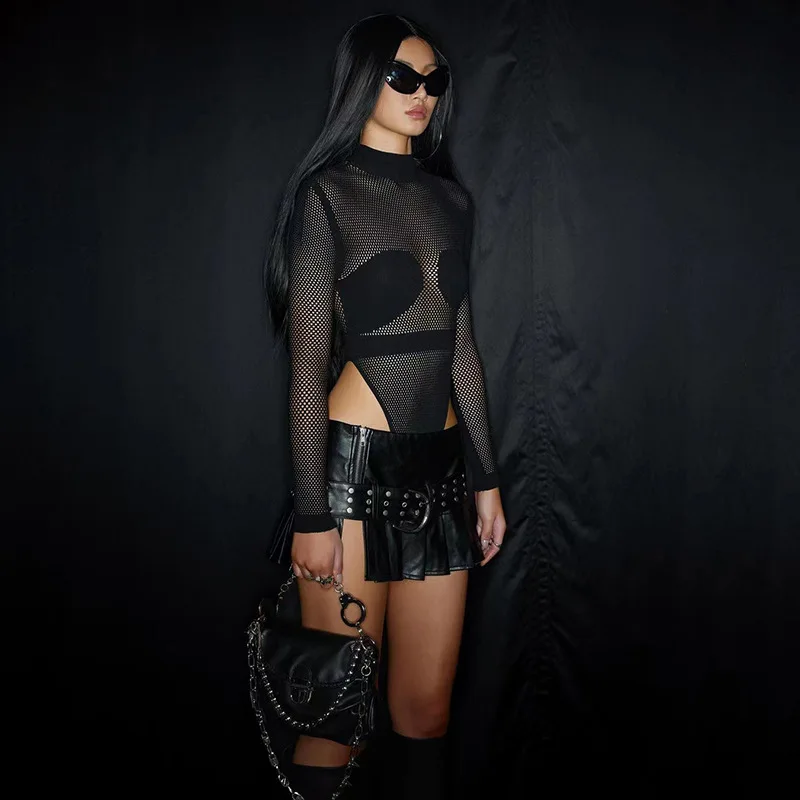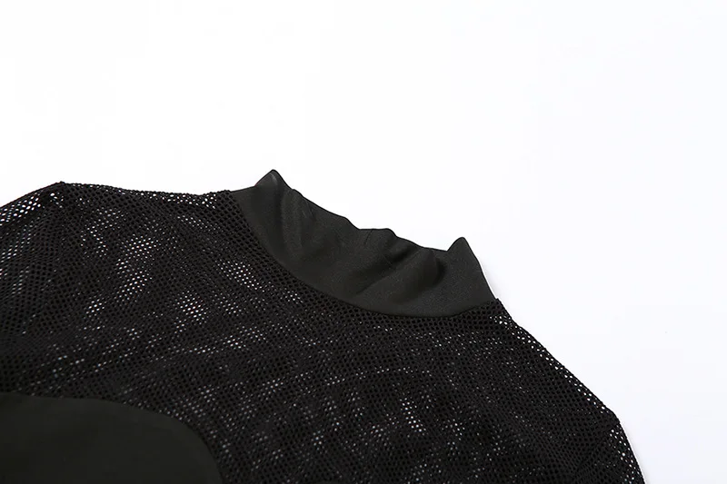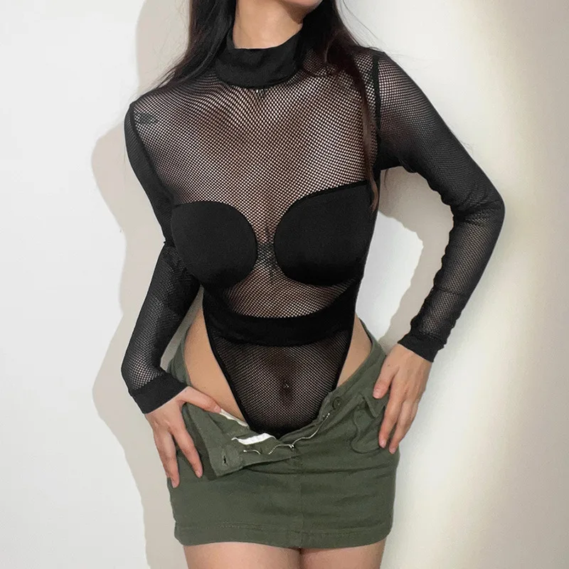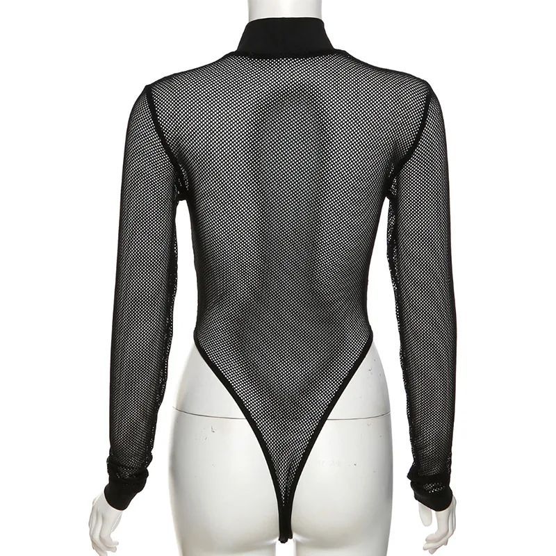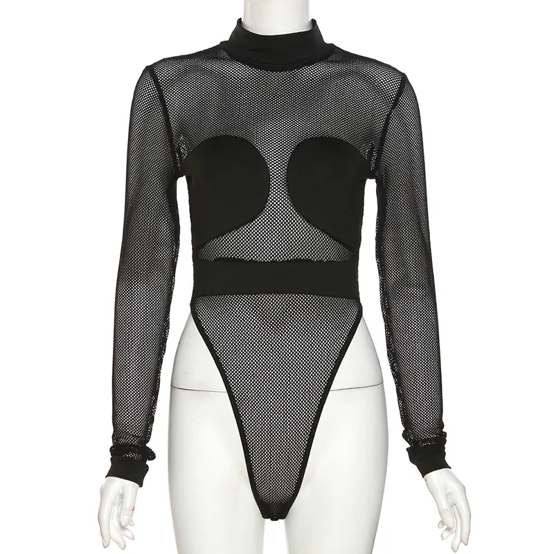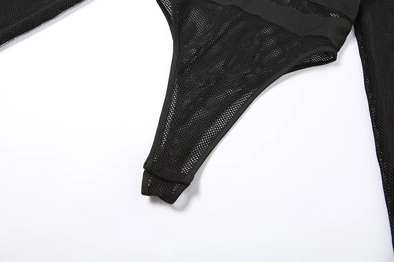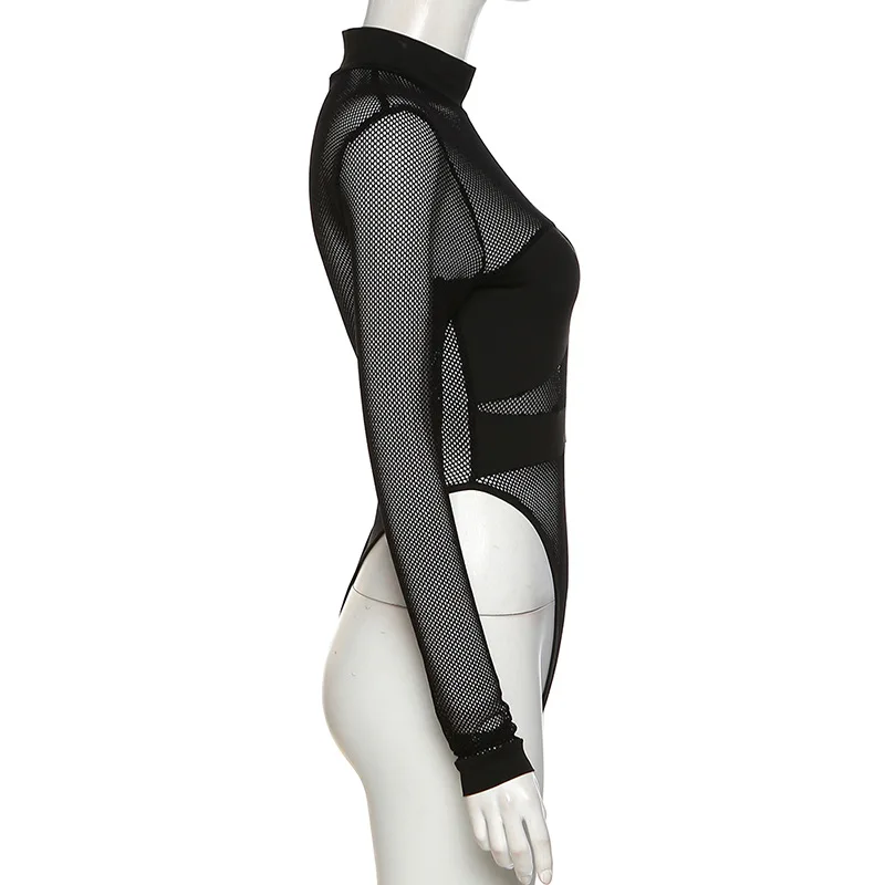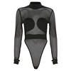 CM.YAYA Women Fashion Mesh See Though Patchwork Long Sleeve Bodysuit Sexy Club Party One Piece Suit Tops