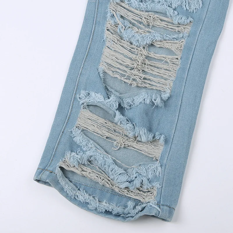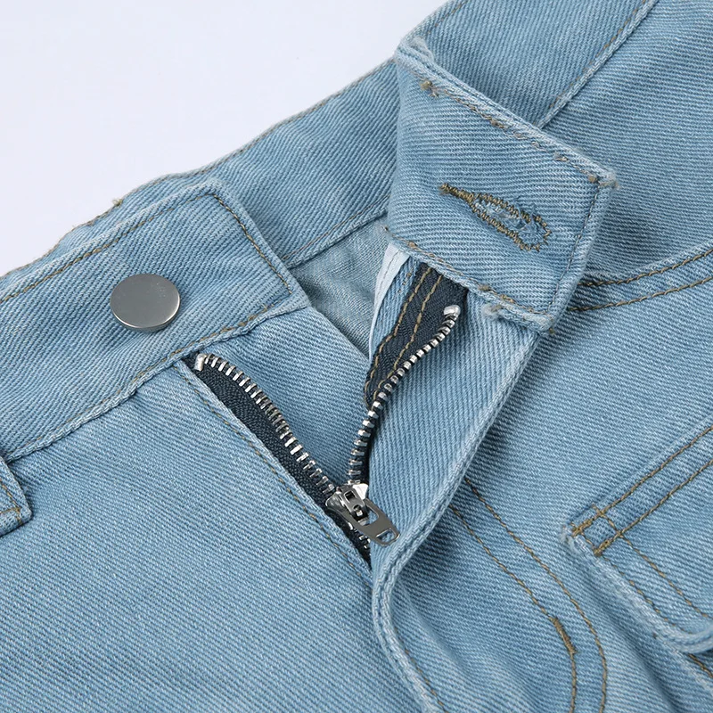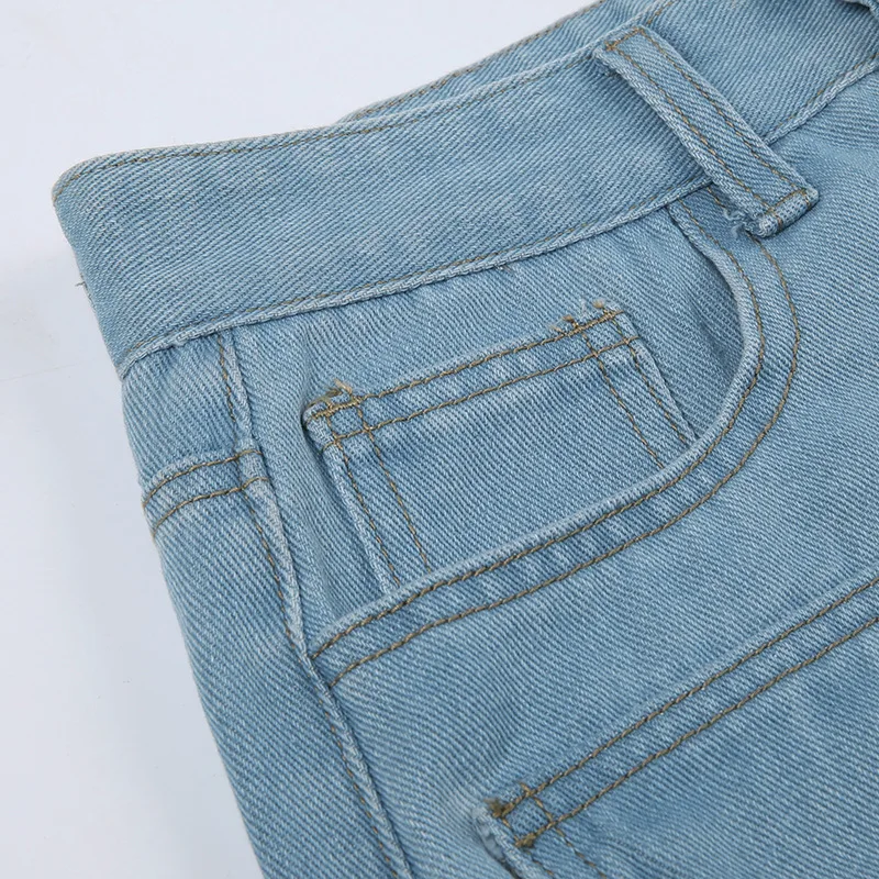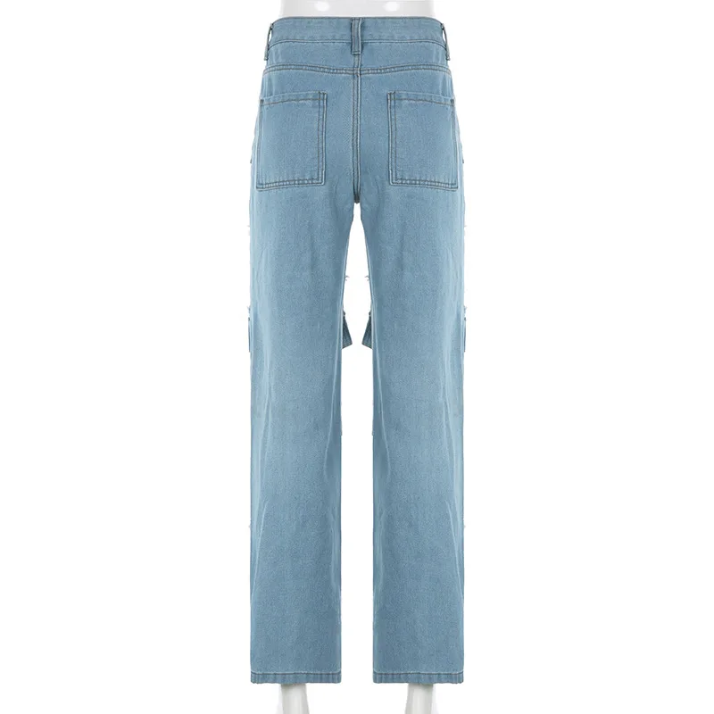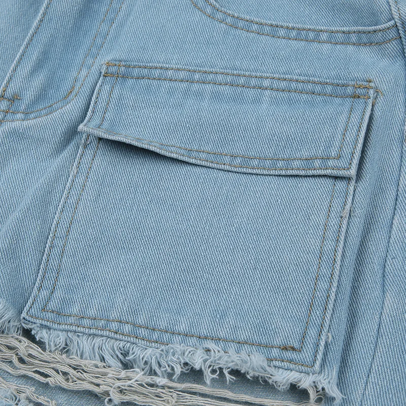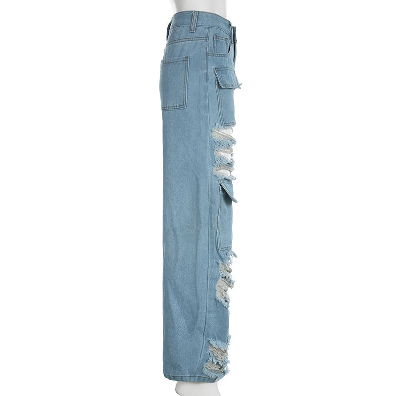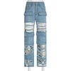 CM.YAYA Women Fashion Ripped Hollow Out Tassel Pocket Front Safari Style Jeans 2023 New Summer INS Street Denim Pants Trousers
