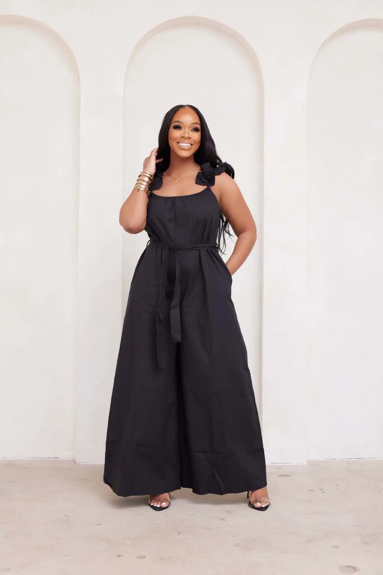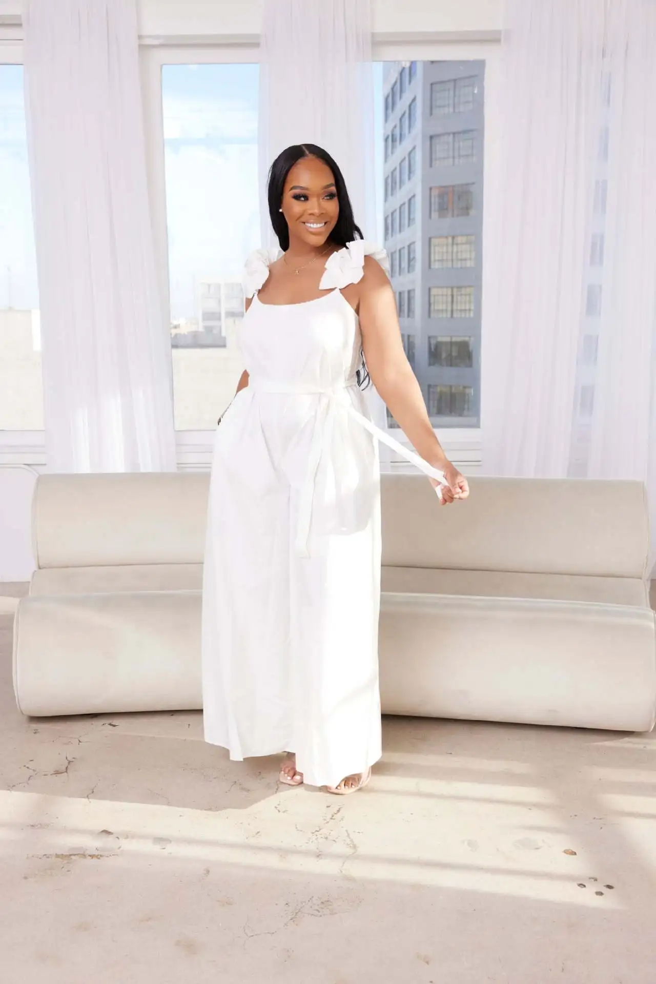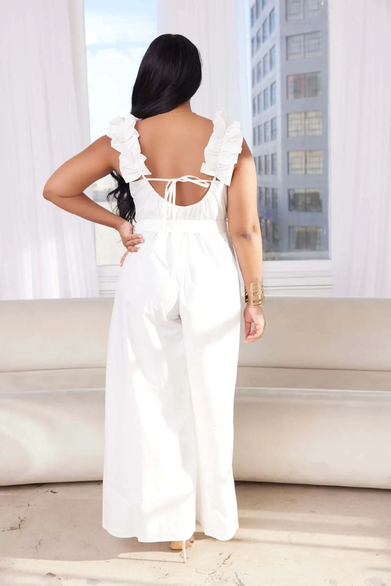 CM.YAYA Women Fashion Ruffles Shoulder Lace Backless with Sashes Jumpsuit 2023 Street Casual Playsuit One Piece Suit Romper
