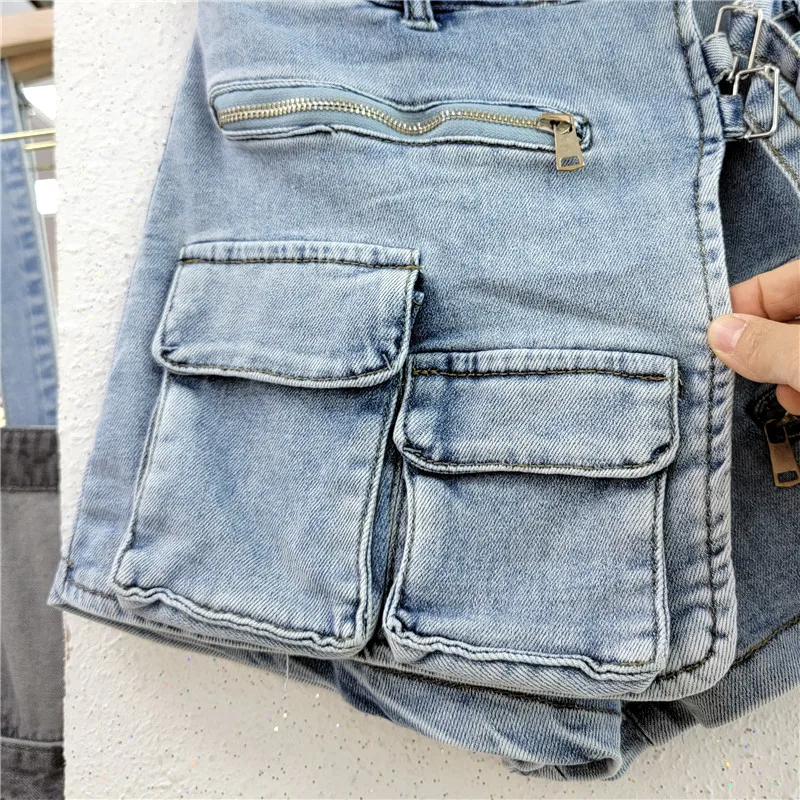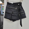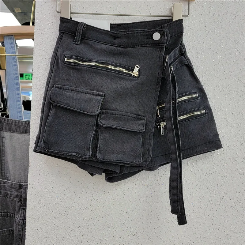 CM.YAYA Women Fashion Wrap A-line Zipper Splicing Multi Pocket Denim Skirt Shorts 2023 Summer INS Cargo Safari Style Short Jeans