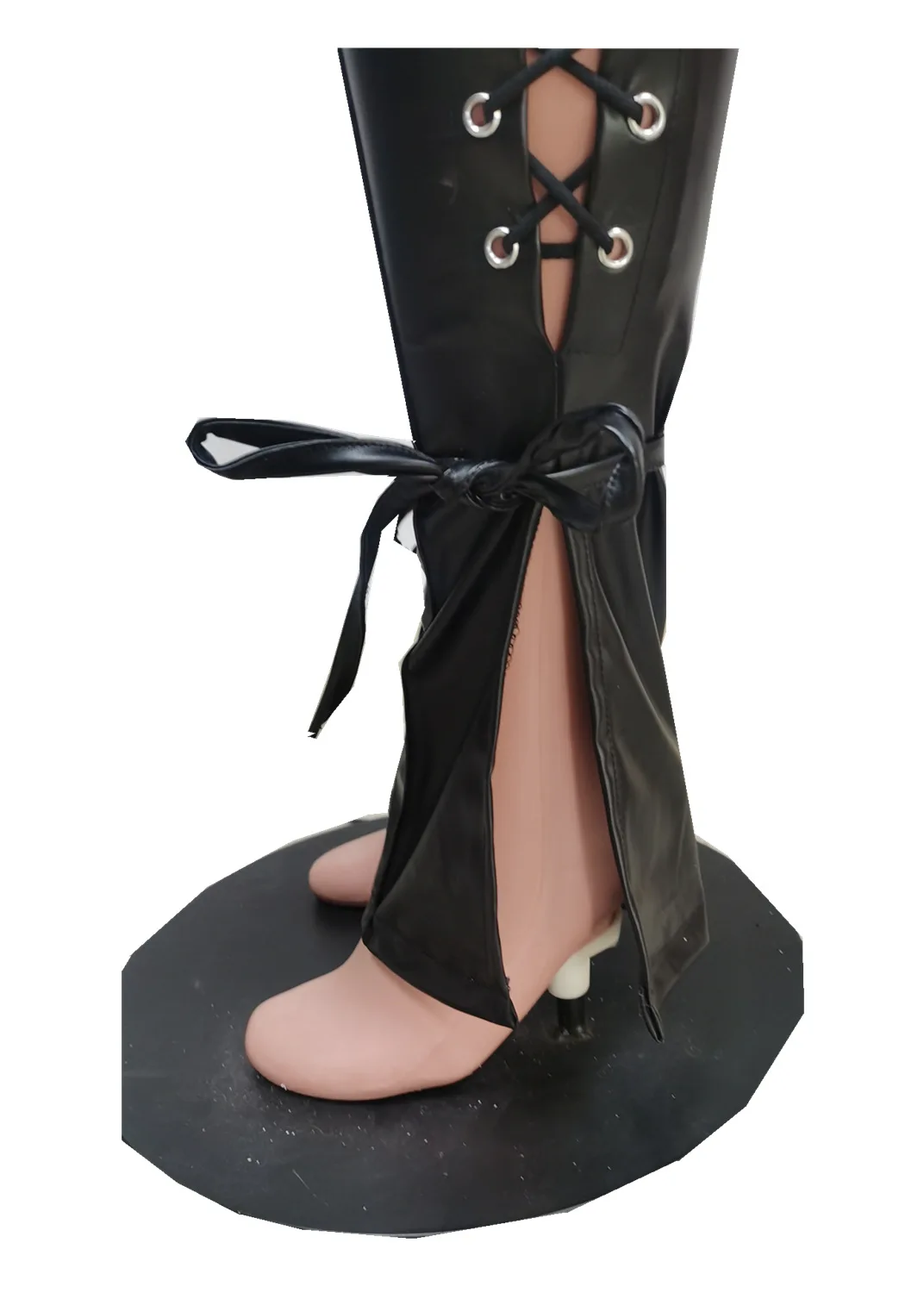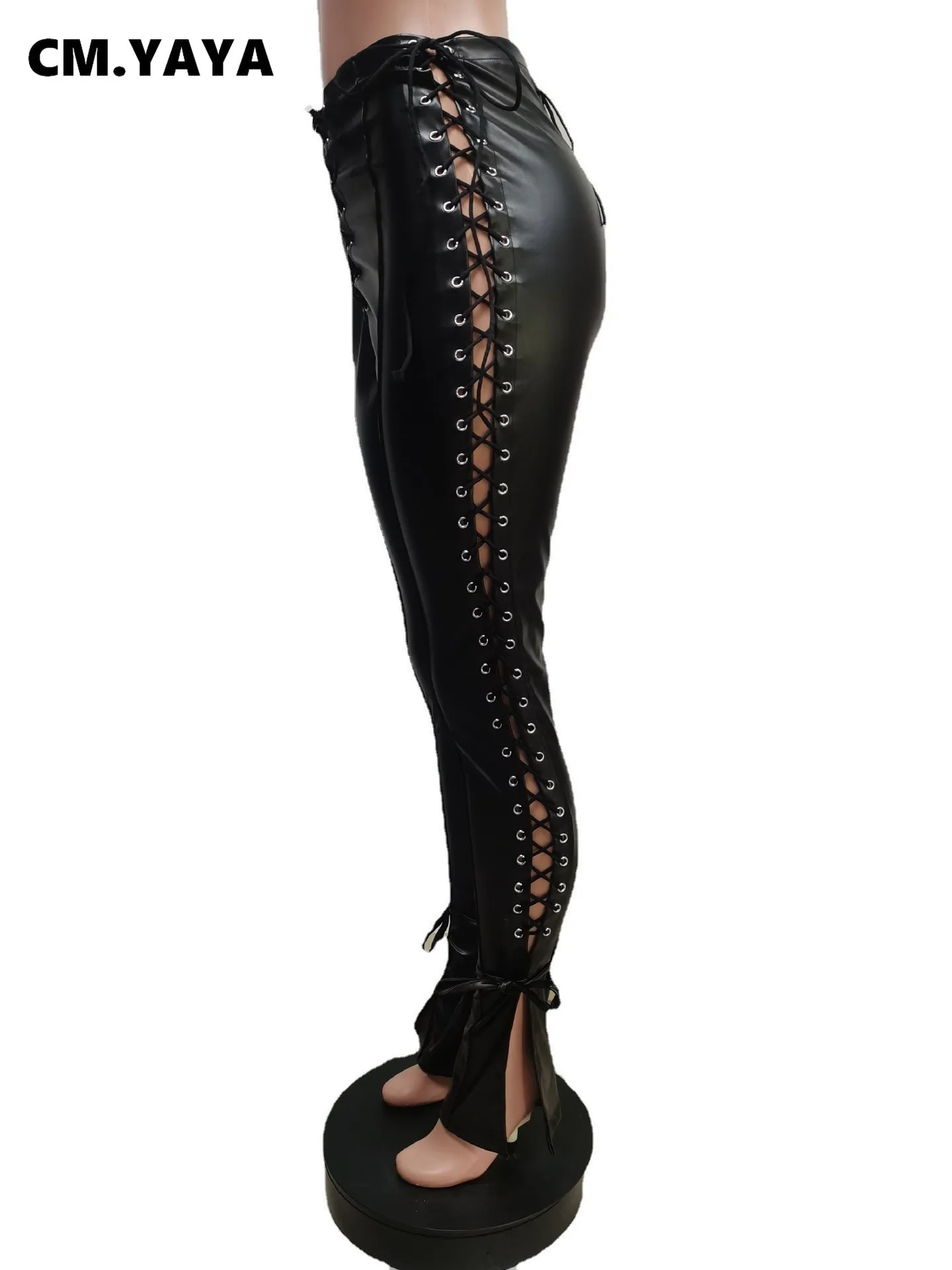 CM.YAYA Women Faux Leather Lace Up High Waist Hollow Out Side Sexy Pants for Streetwear Sexy Night Party Clubwear PU Trousers