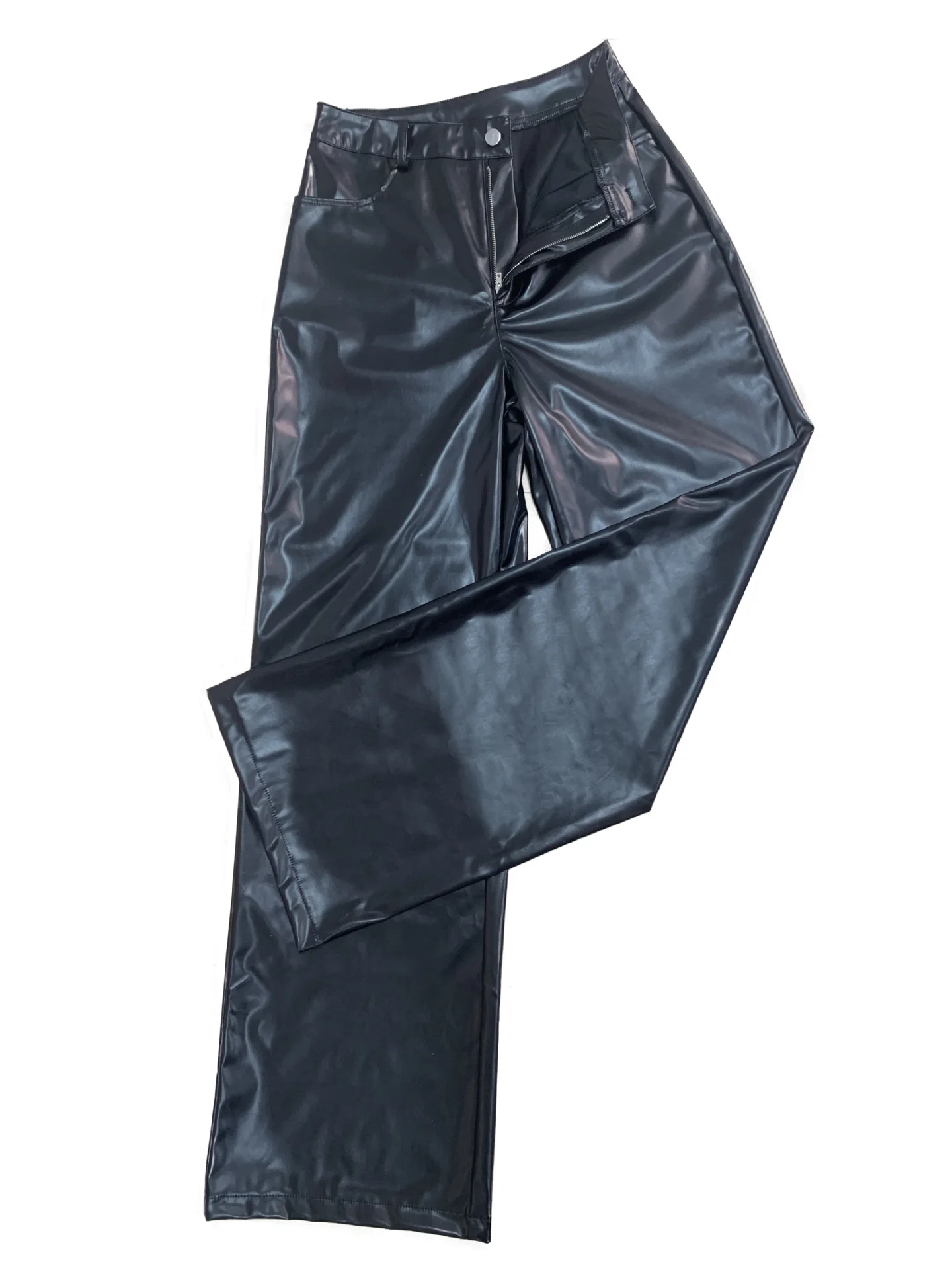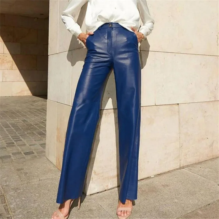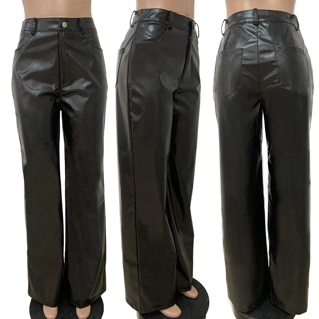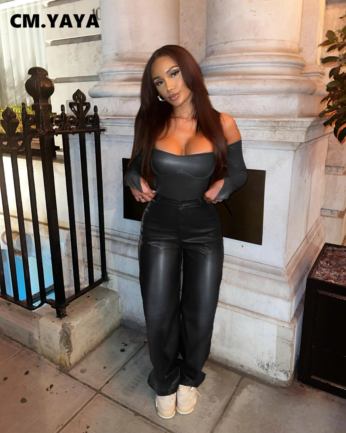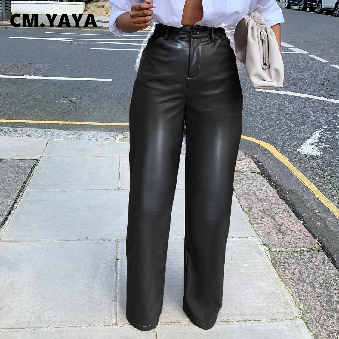 CM.YAYA Women Faux Leather Pu Pants Winter Spring Black High Waist Fashion Straight Trousers