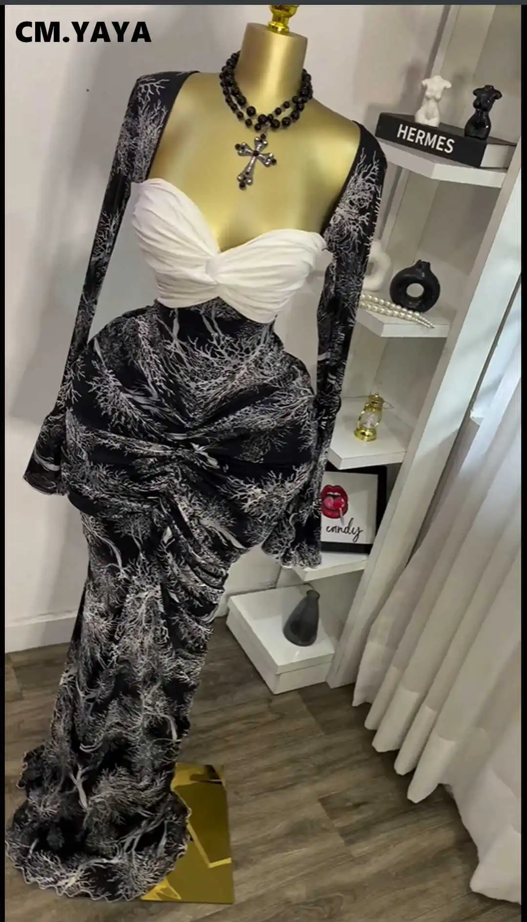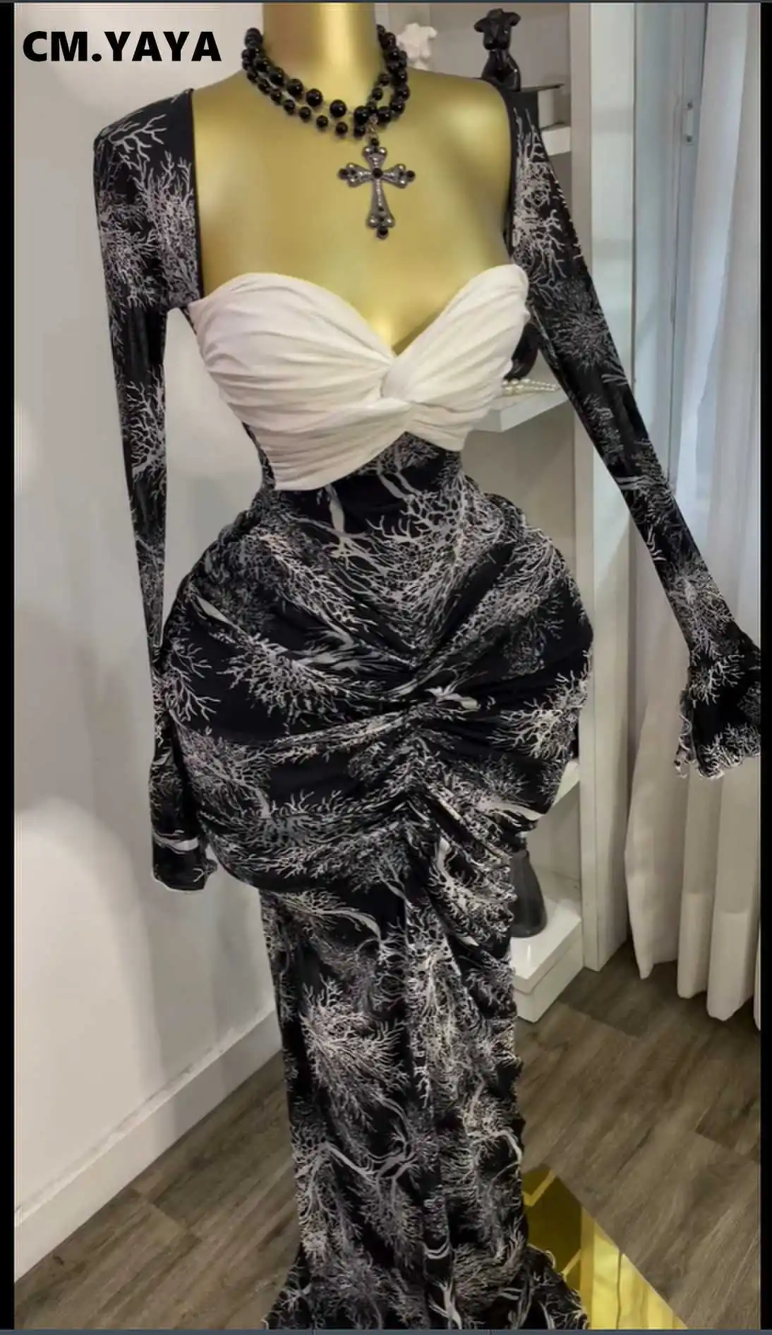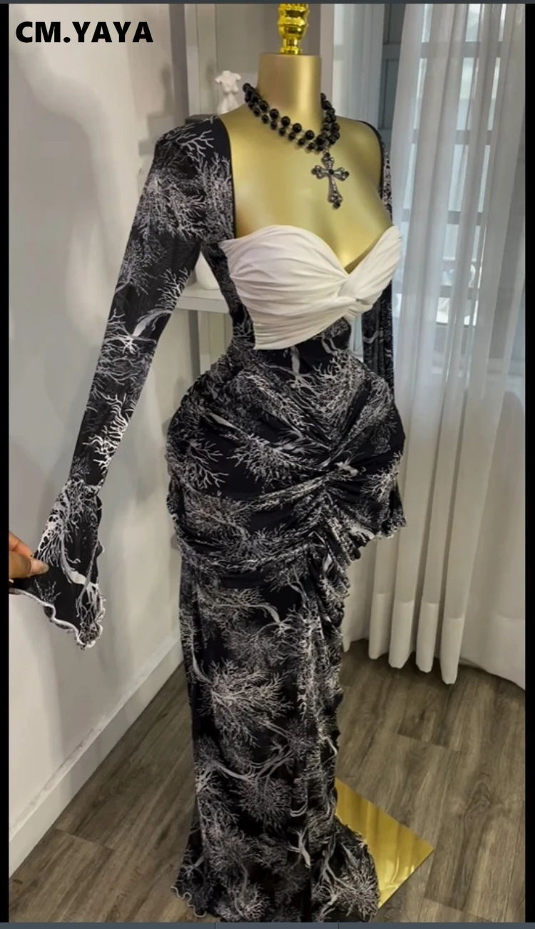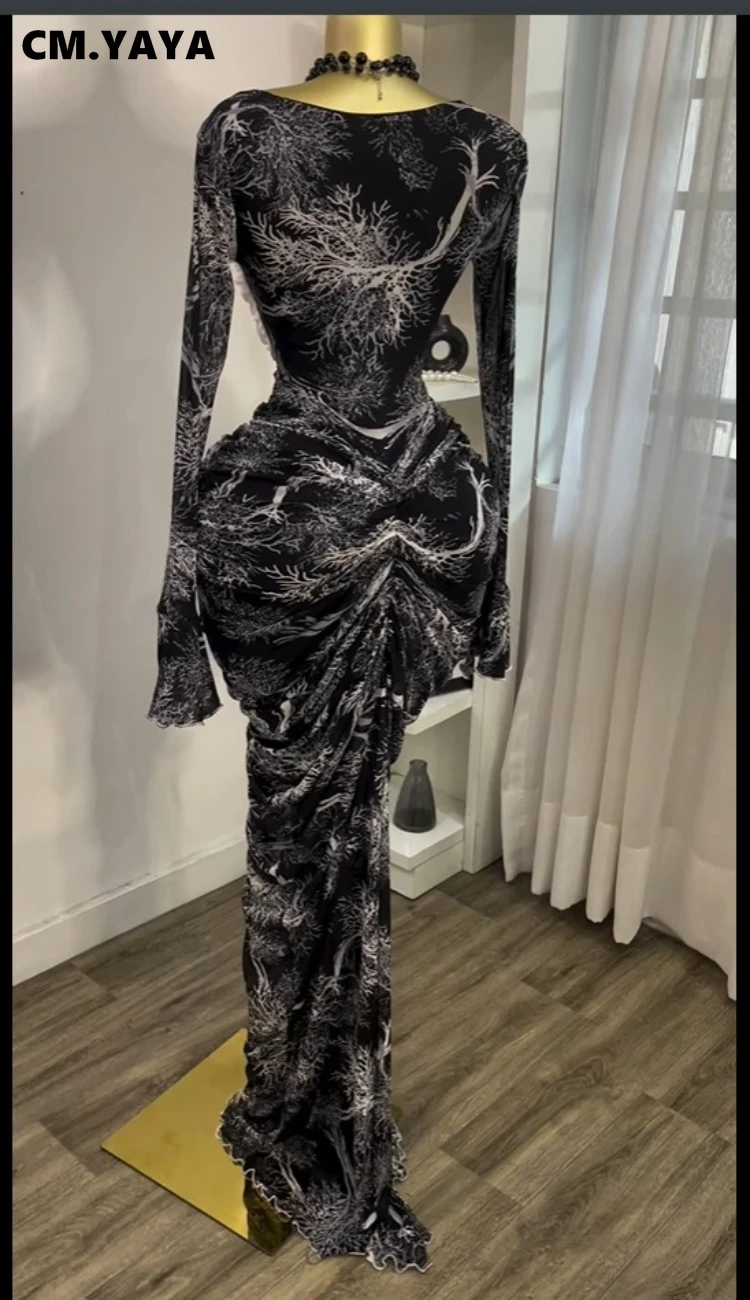 CM.YAYA Women Flare Long Sleeve Printed Patchwork Stacked Ruched Bodycon Midi Maxi Long Dress 2025 Birthday Sexy Party Dresses