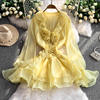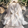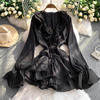 CM.YAYA Women Flare Long Sleeve V-neck Flower Applique Ruffles Mini Dress 2025 Beach Sexy Beach Party Birthday Street Dresses