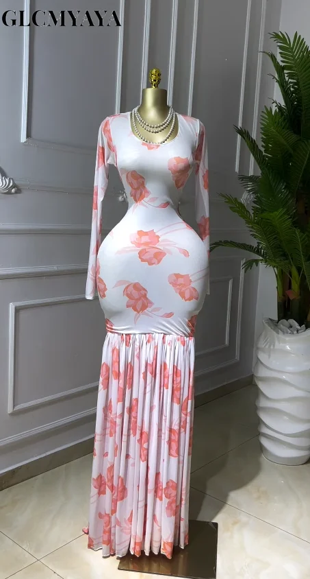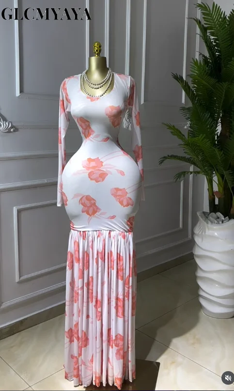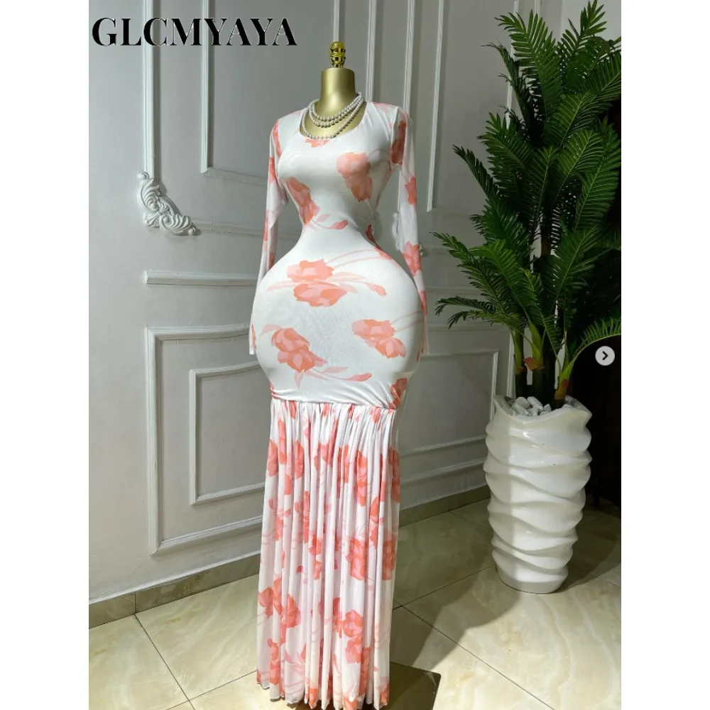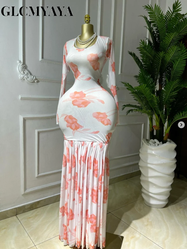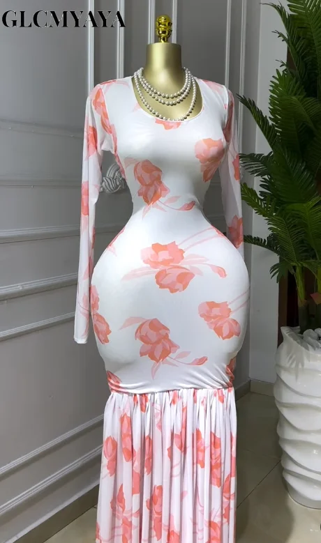 CM.YAYA Women Floral Print Ruffles Full Sleeve Bodycon Long Dress Fall Evening Vacation Birthday Party Vestidos Sexy Dresses
