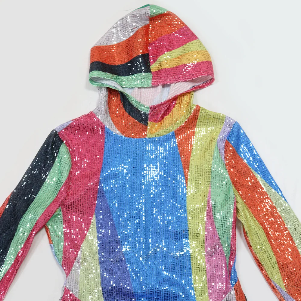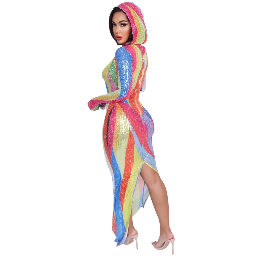 CM.YAYA Women Full Sleeve Hooded Back Split Striped Sequined Bodycon Long Maxi Dress 2025 Sexy Party Birthday Dresses Vestidos