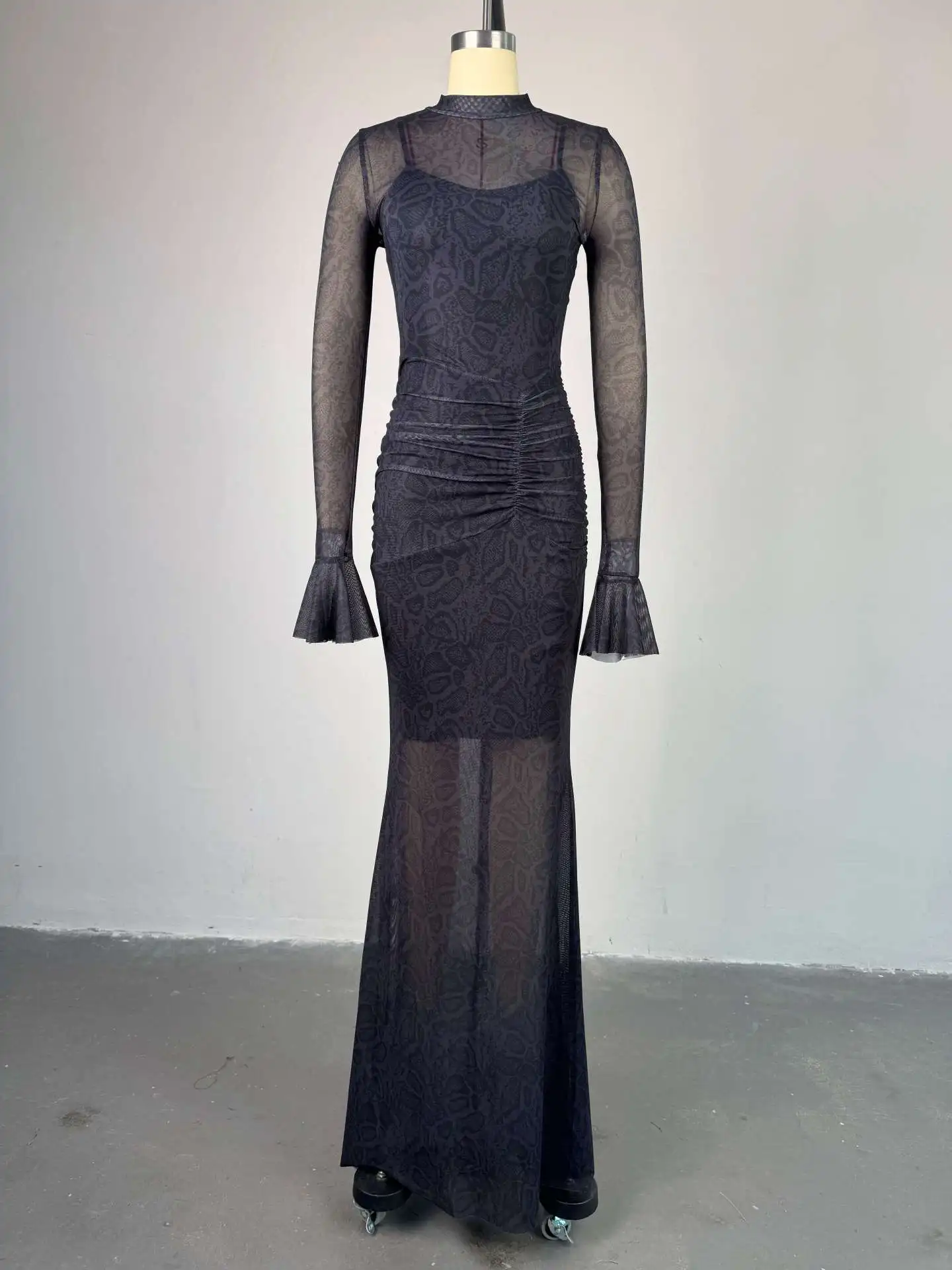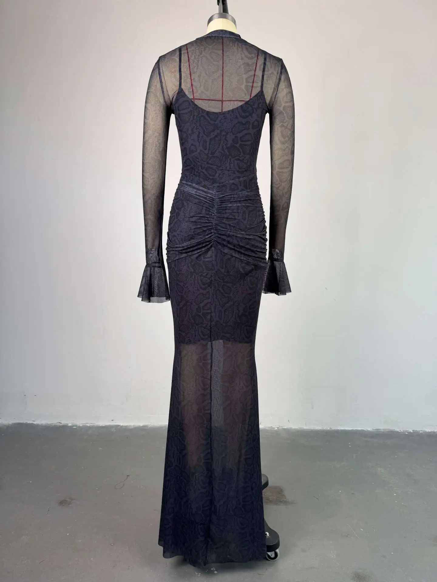 CM.YAYA Women Full Sleeve Long Dress Lace Leopard See Through Ruched O-neck Evening Vestidos Sexy Party Maxi Dresses Vestidos