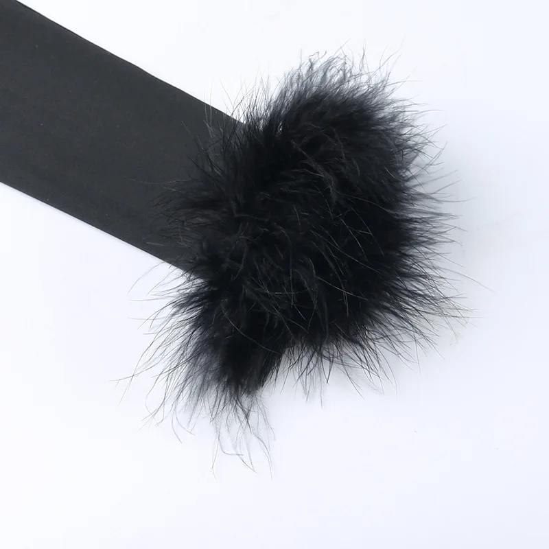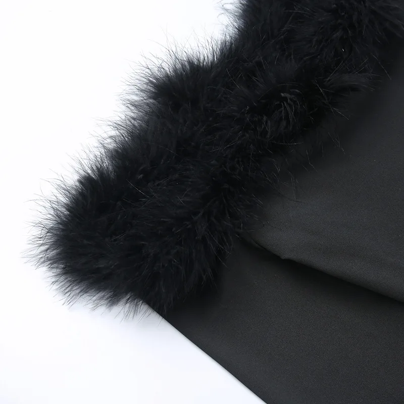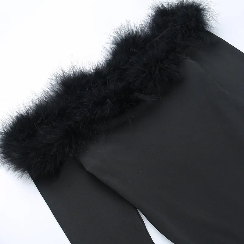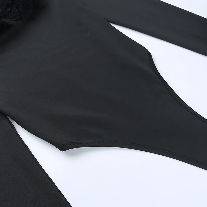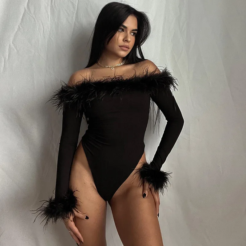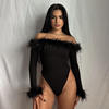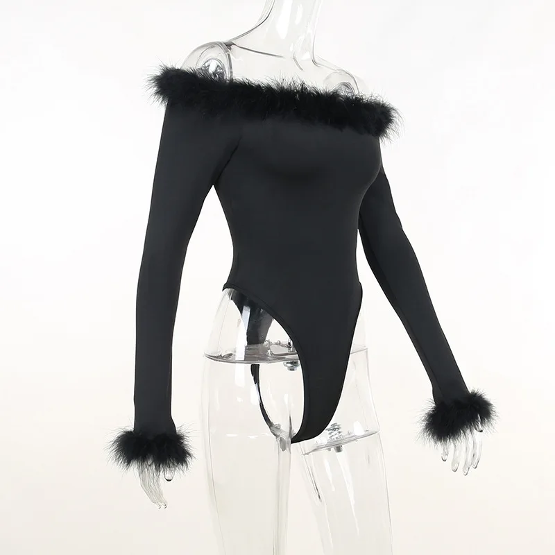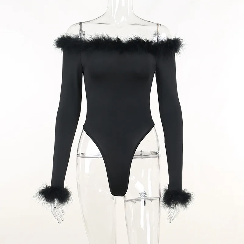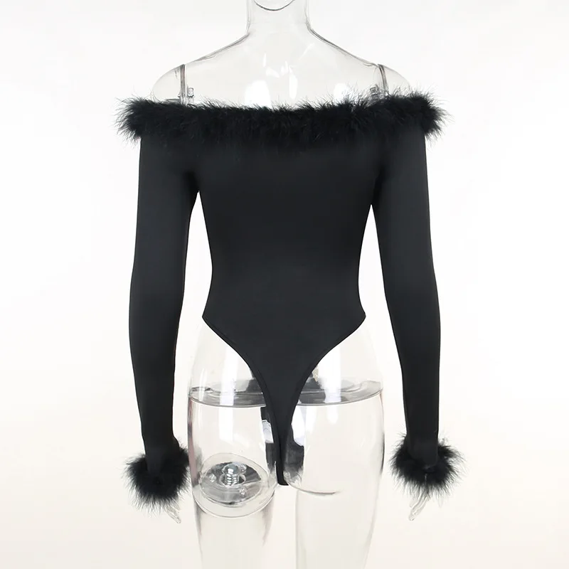 CM.YAYA Women Fur Splicing Off Shoulder Long Sleeve Black Bodysuit 2023 New Spring INS Sexy Party Club Stretchy Tops