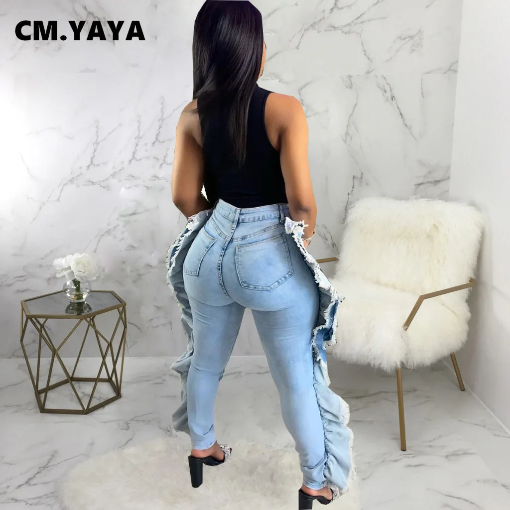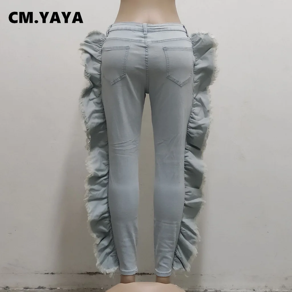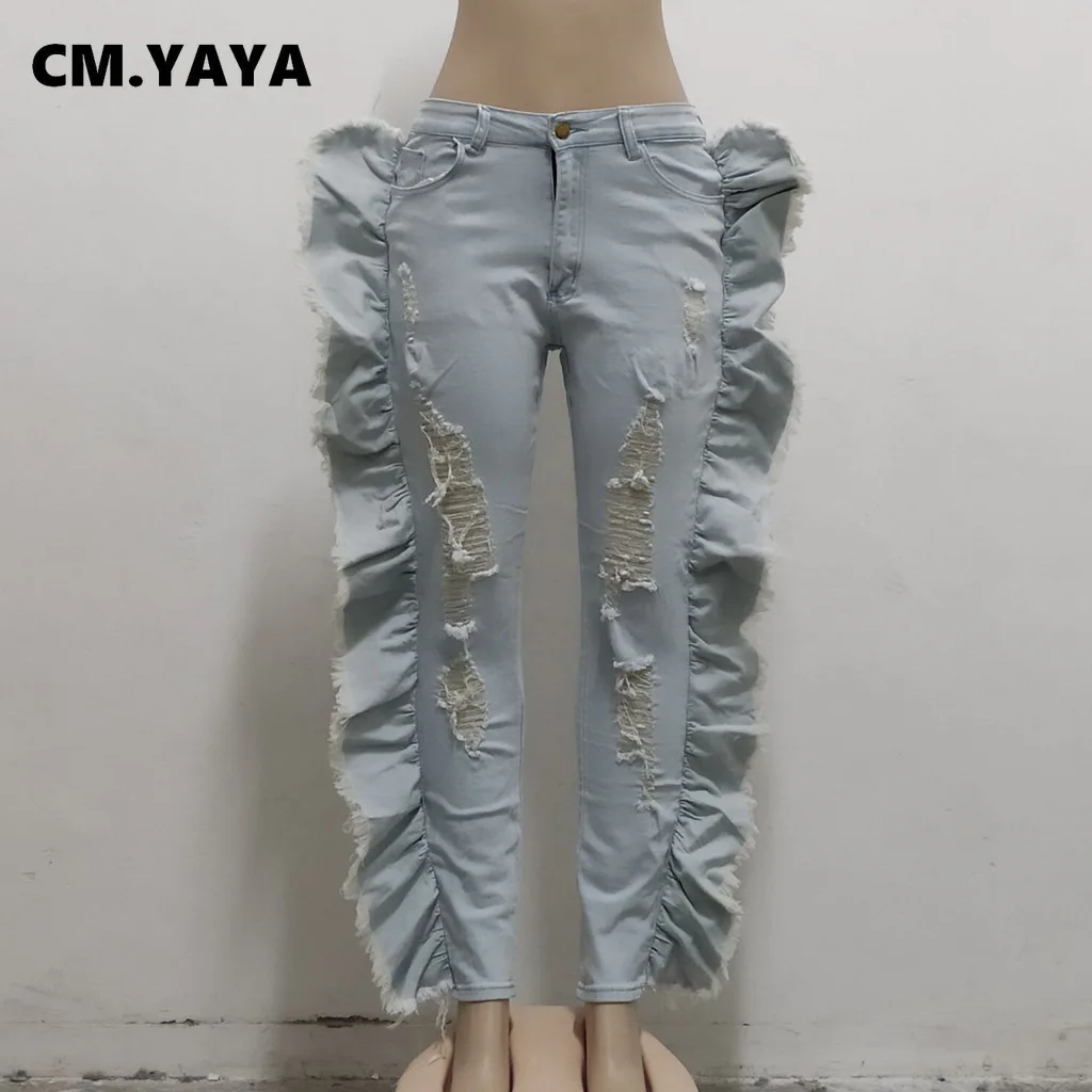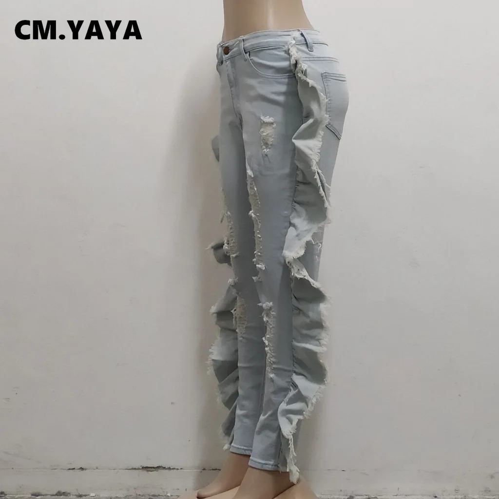 CM.YAYA Women Jeans Ripped Hole Side Ruffles Mid Waist Pockets Zipper Stretchy Skinny Pencil Denim Pants Fashion Trousers Summer