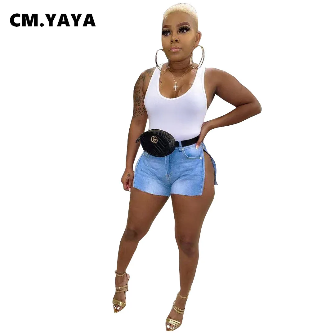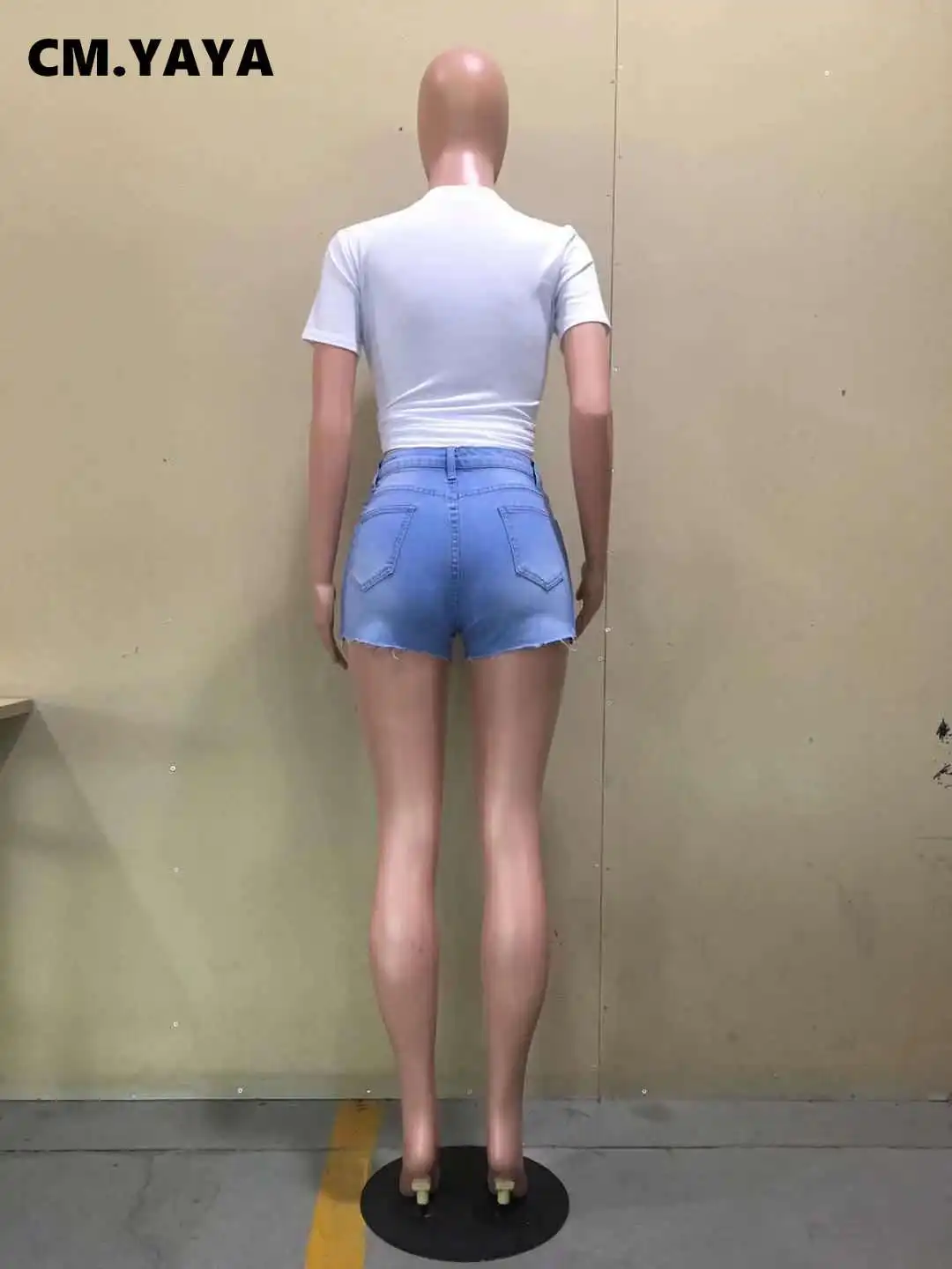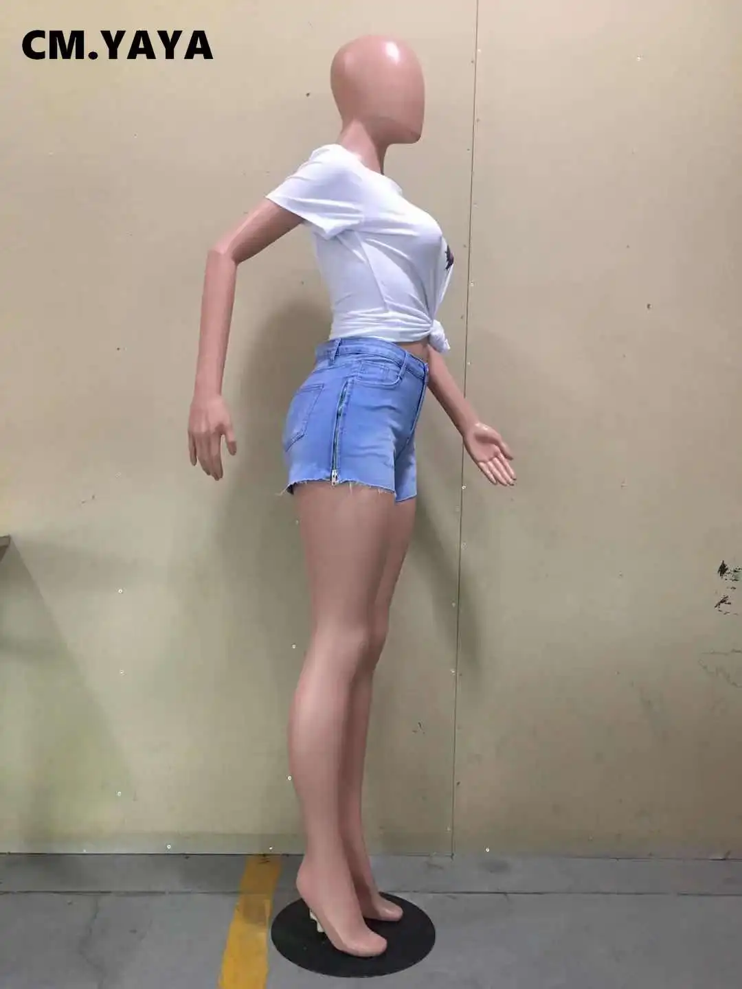 CM.YAYA Women Jeans Solid Mid Waist Zipper Pockets Side Zip Stretchy Straight Denim Shorts Sexy Fashion High Streetwear Summer
