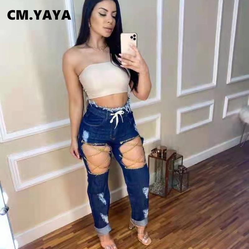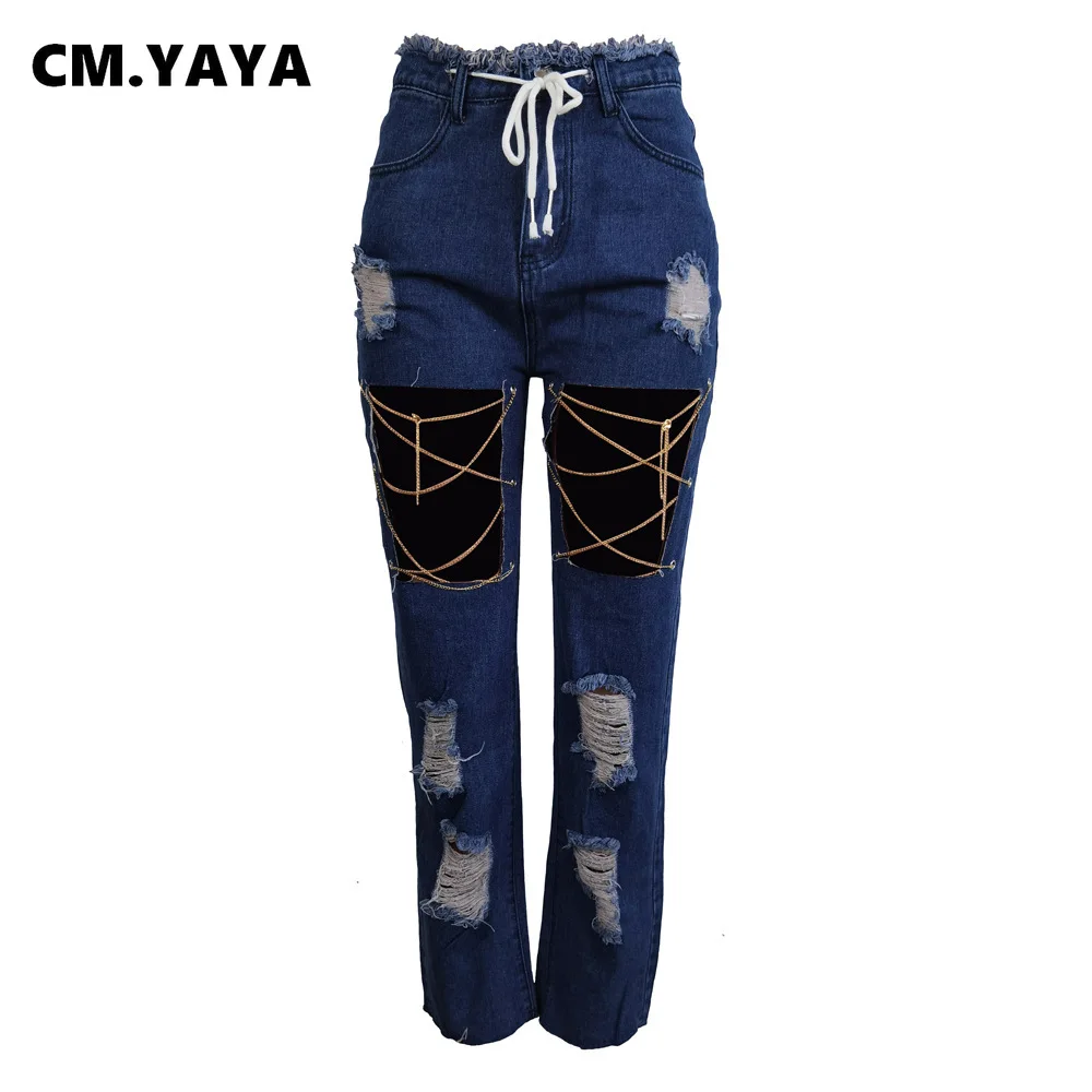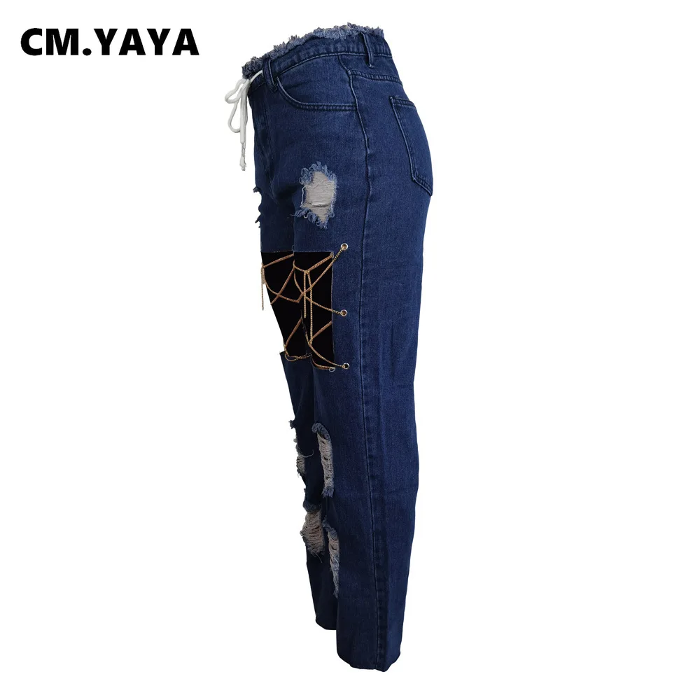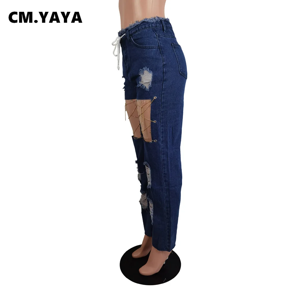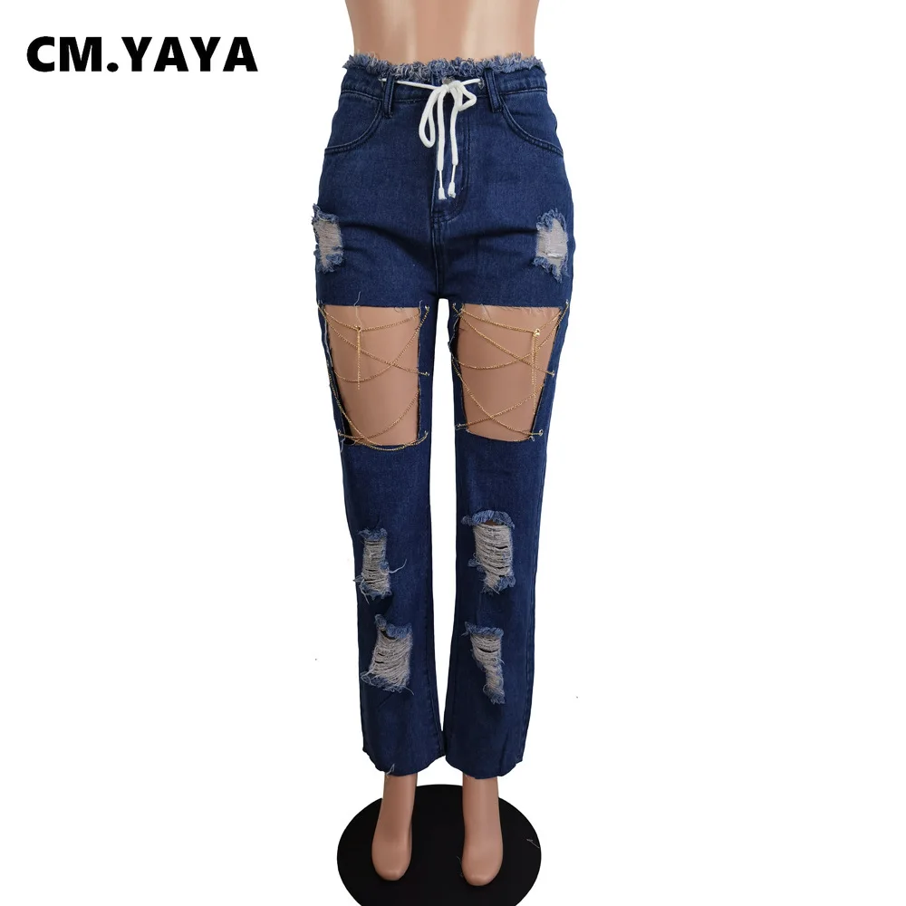 CM.YAYA Women Jeans Solid Ripped Hole Elastic Waist Draw String Pockets Stretchy Straight Denim Pants Fashion Streetwear Summer