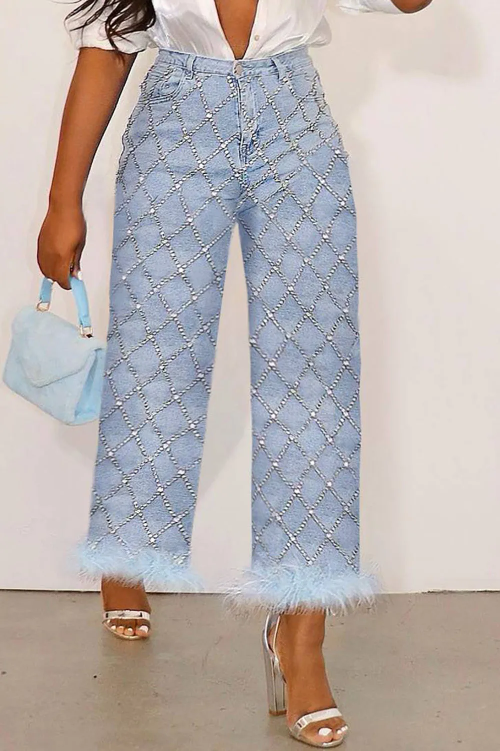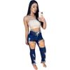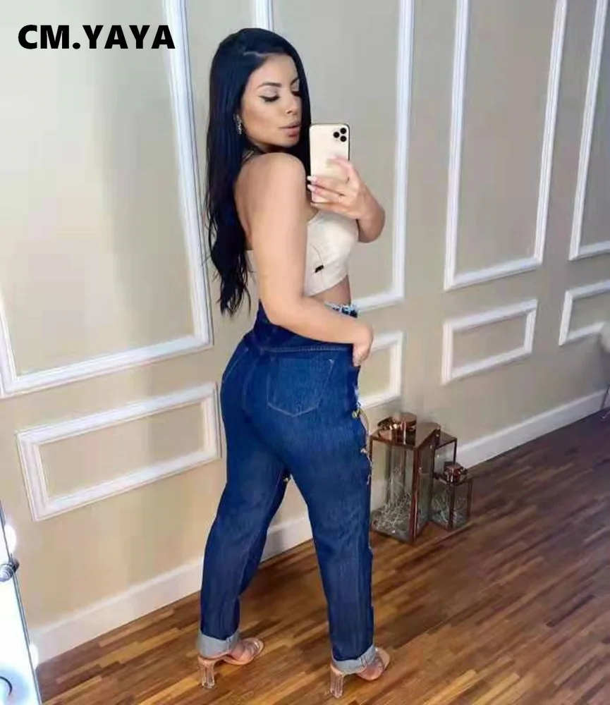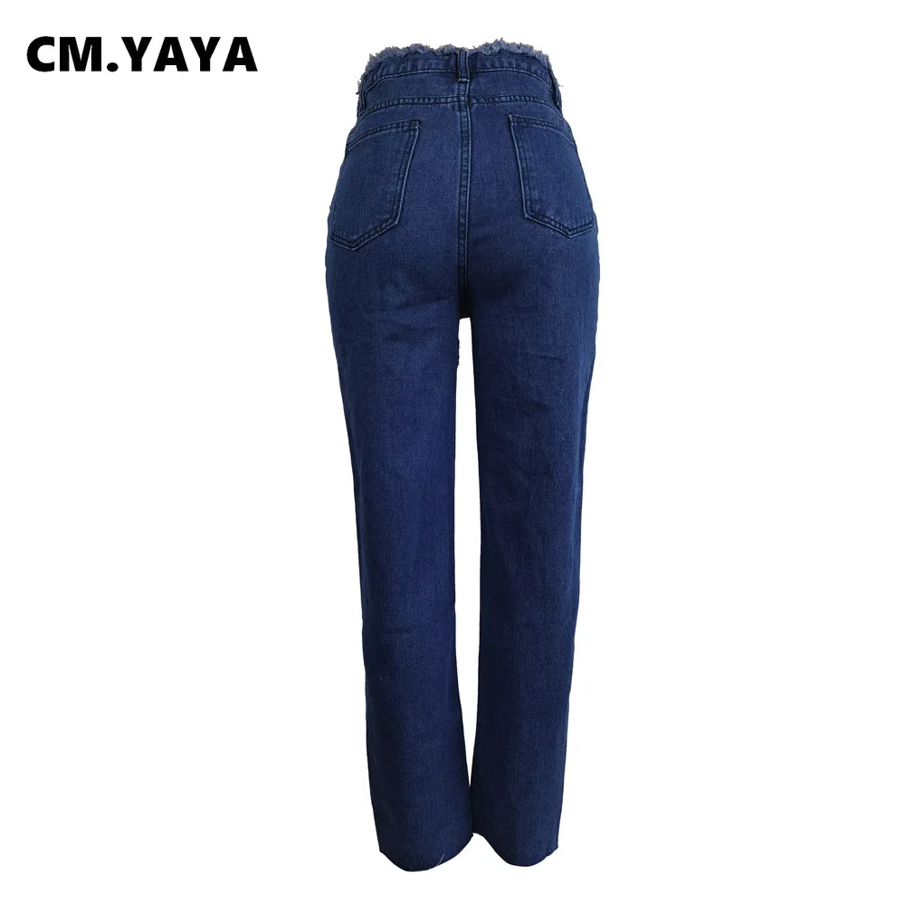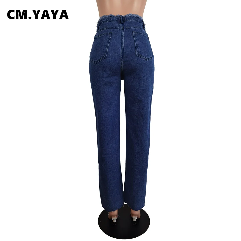 CM.YAYA Women Jeans Solid Ripped Hole Elastic Waist Draw String Pockets Stretchy Straight Denim Pants Fashion Streetwear Summer