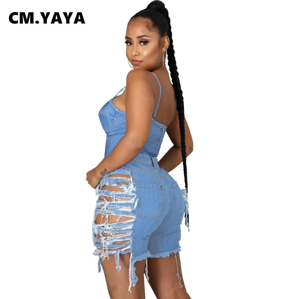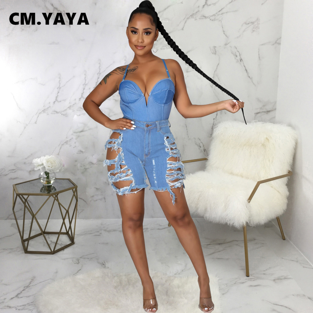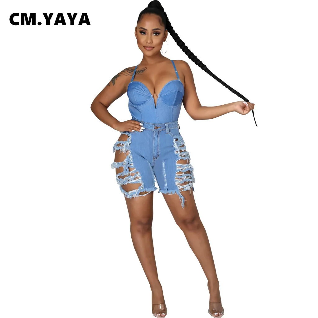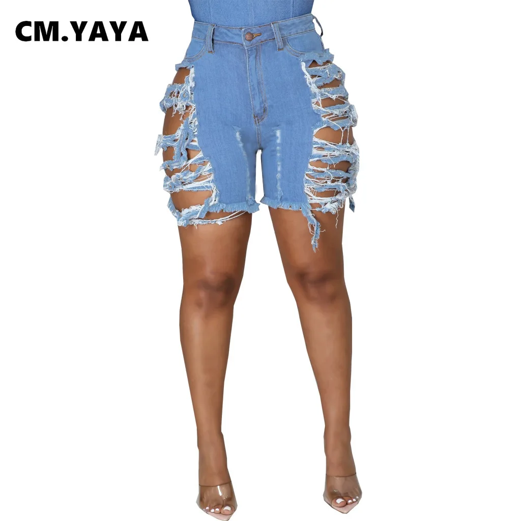 CM.YAYA Women Jeans Solid Ripped Hole Pockets Zipper Straight Denim Shorts Sexy Fashion High Streetwear Summer Trousers 2021