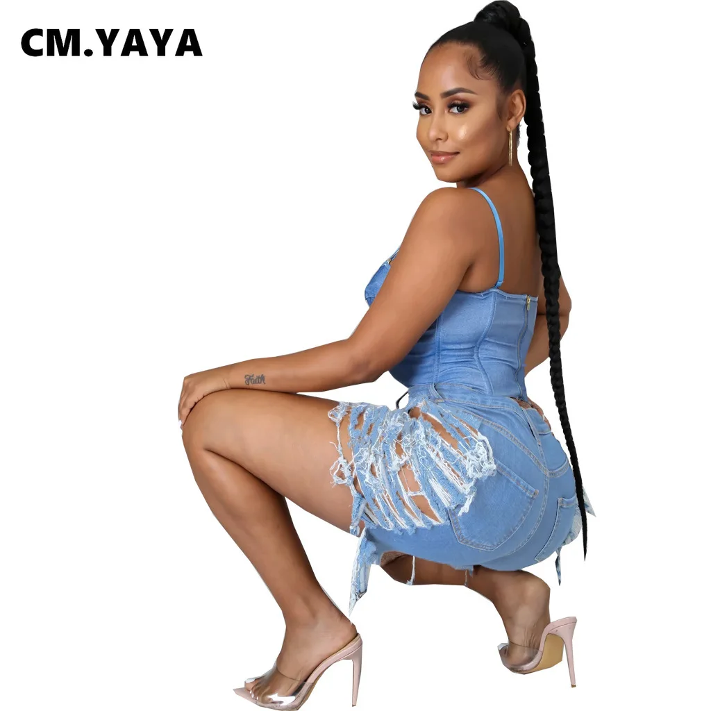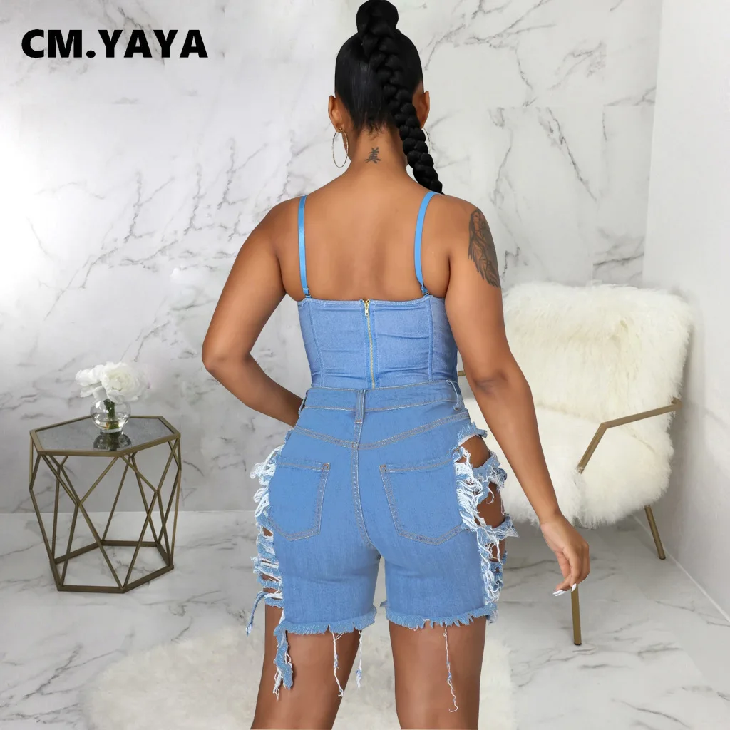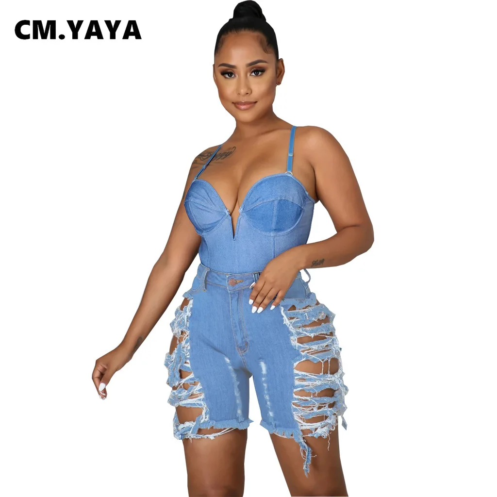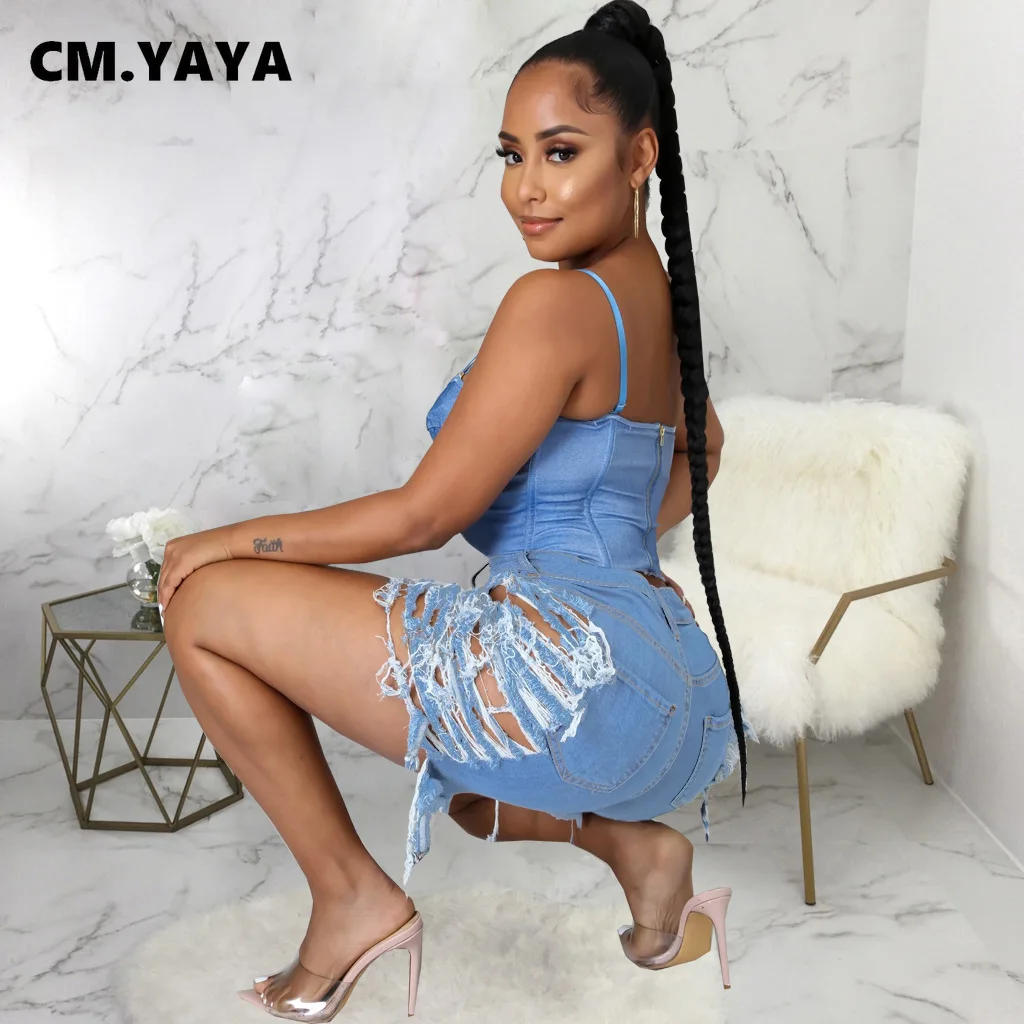 CM.YAYA Women Jeans Solid Ripped Hole Pockets Zipper Straight Denim Shorts Sexy Fashion High Streetwear Summer Trousers 2021